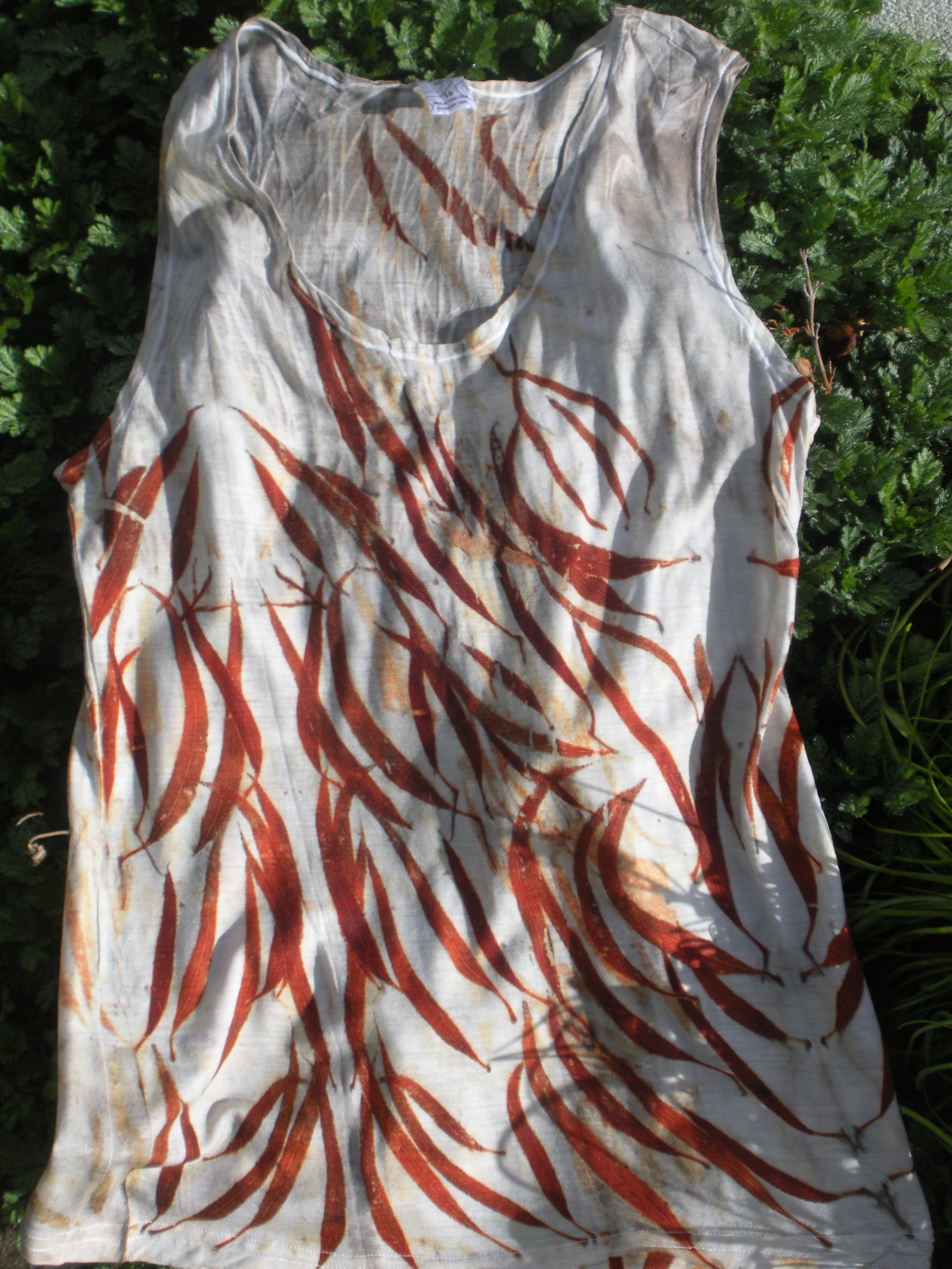 Since reading India Flint’s wonderful book Eco-Colour (2008), I have spent many an hour experimenting with her concept of the eco-print. Flint focuses on printing on wool and silk, and I highly recommend her books and blog. Since I do much more sewing with cotton, linen and hemp (and have made only a few special things from silk and wool)… I have experimented at length to get eucalyptus leaf prints onto cotton and linen fabrics. More of that later. But recently I leaf printed some woolen thermal underwear for a friend (and couldn’t wait for sun to take a picture before I handed them to her–I’m impatient that way). But I also dyed this for myself… Colour me happy with the result!