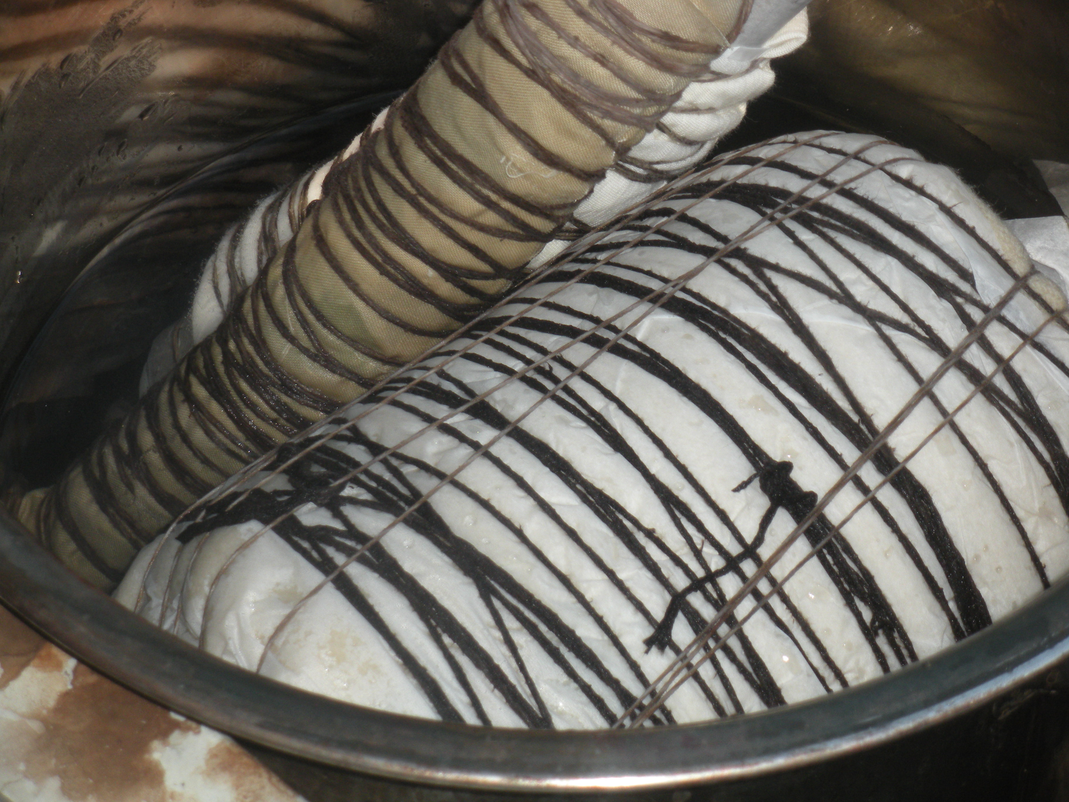 My other dye job looked all right to begin with but there are some very dark patches–perhaps I did not dissolve the dye properly. Now I have it out of the dye pot I think a second attempt might be called for! The dye is Landscapes ‘Plum’. Here it is in the pot, looking quite good, really: