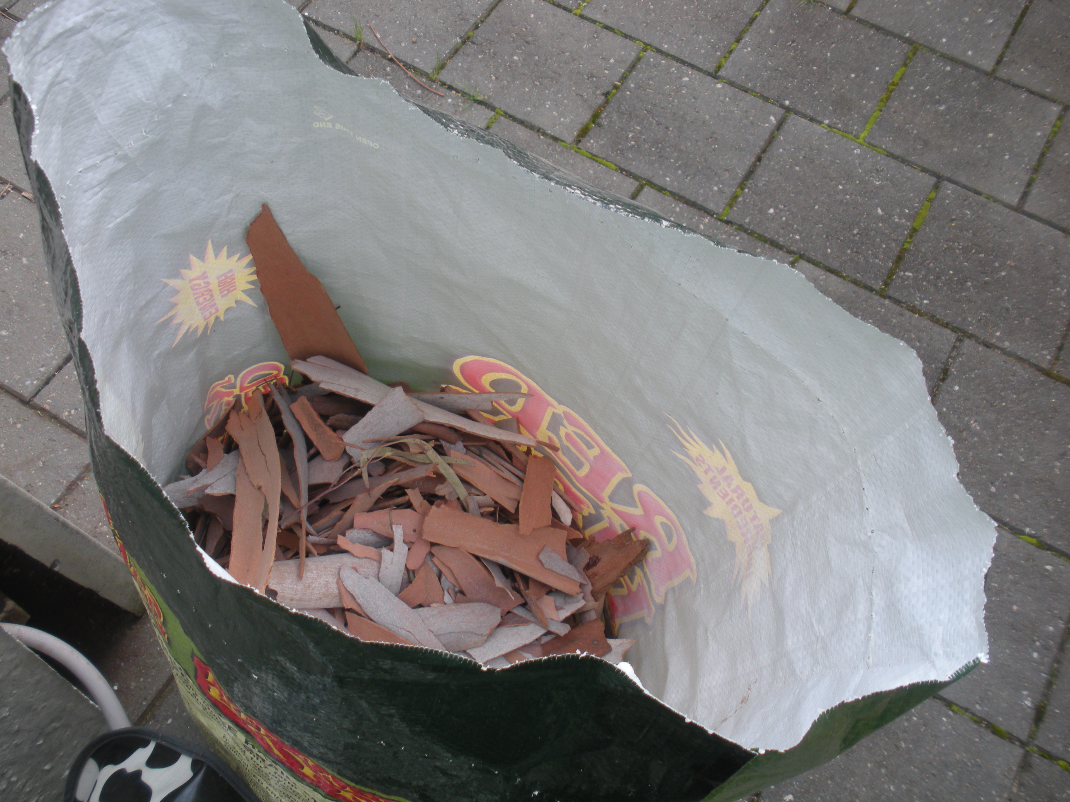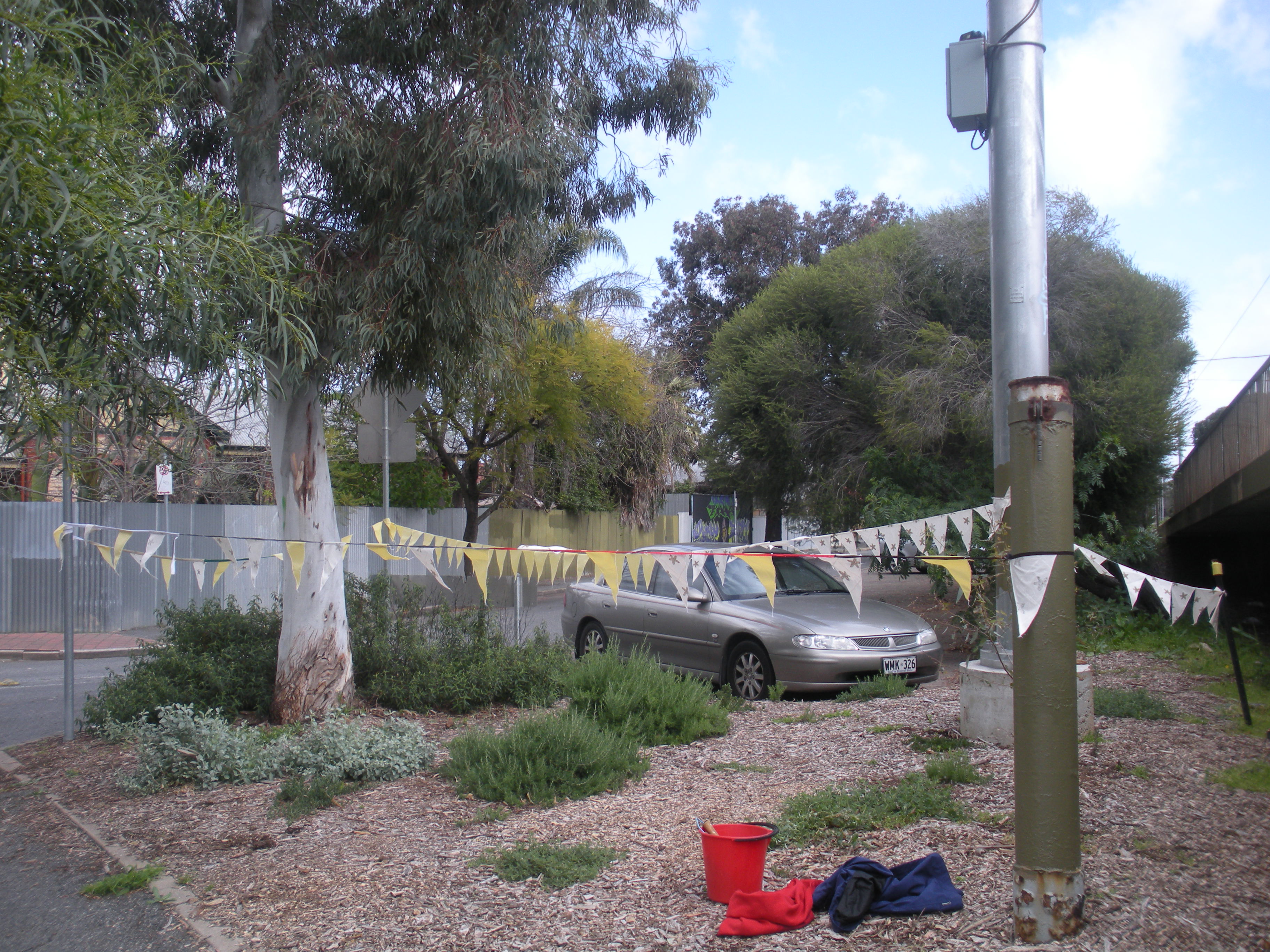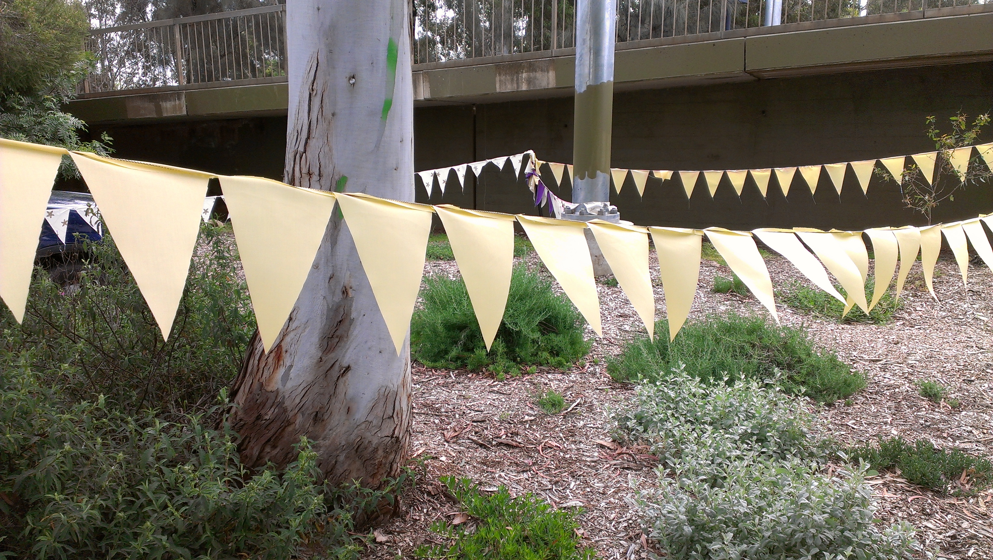 So, in short, the last replacement piece of bunting is extremely low fi… triangles zig zag stitched onto a piece of recycled cotton thread I rescued from a sad old jumper. However, with one day of the show left to go, it was still there when I went to pick some leaves from the tree, and I found two geckos living under bark at the base of the tree when I checked under it for white ants (sadly, evidence of white ants as well as geckos). I’ve never seen lizards on this tree before, so this was very exciting!