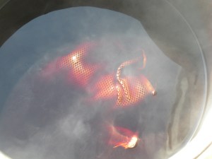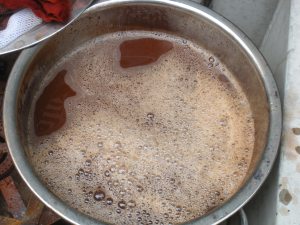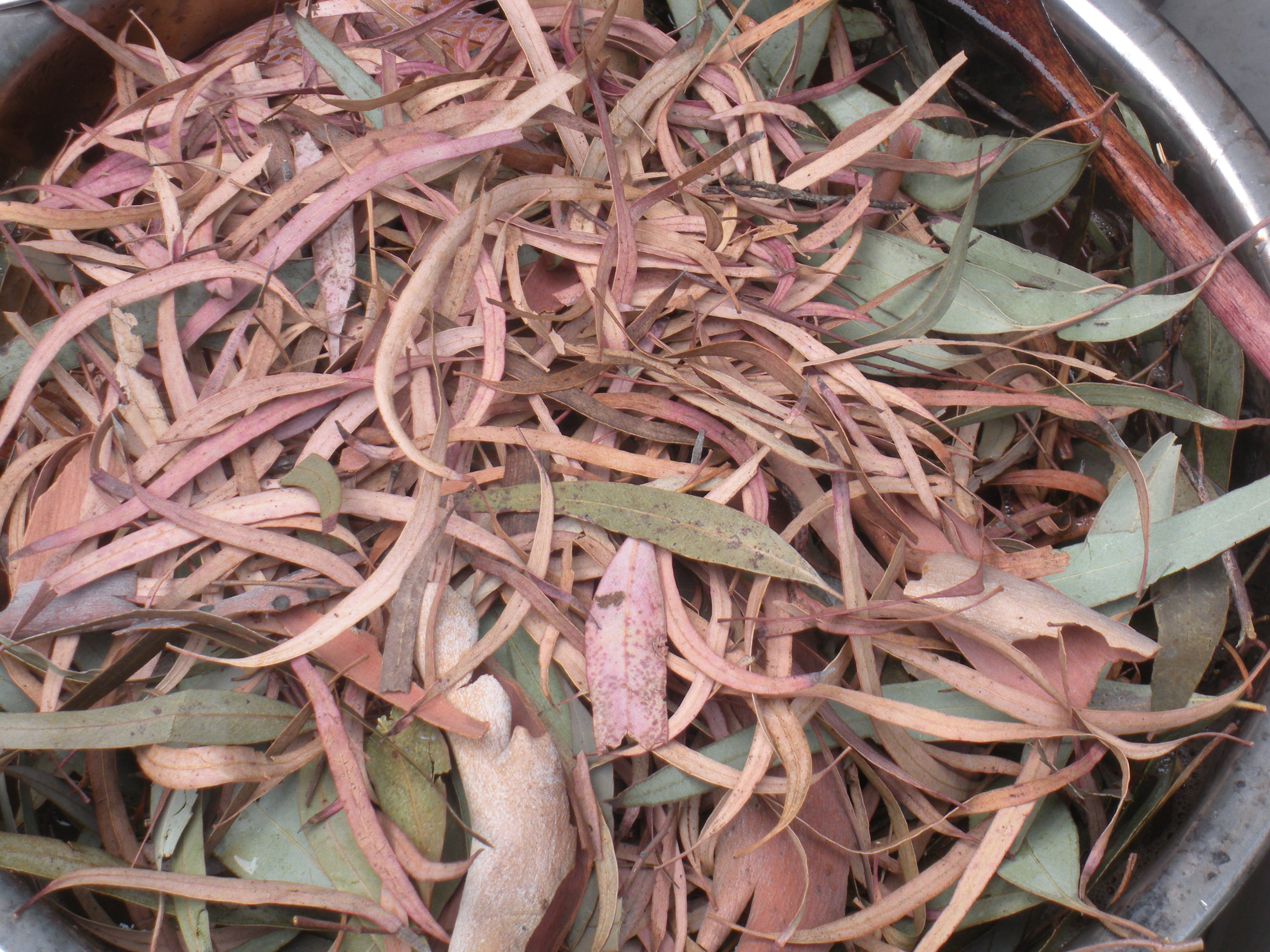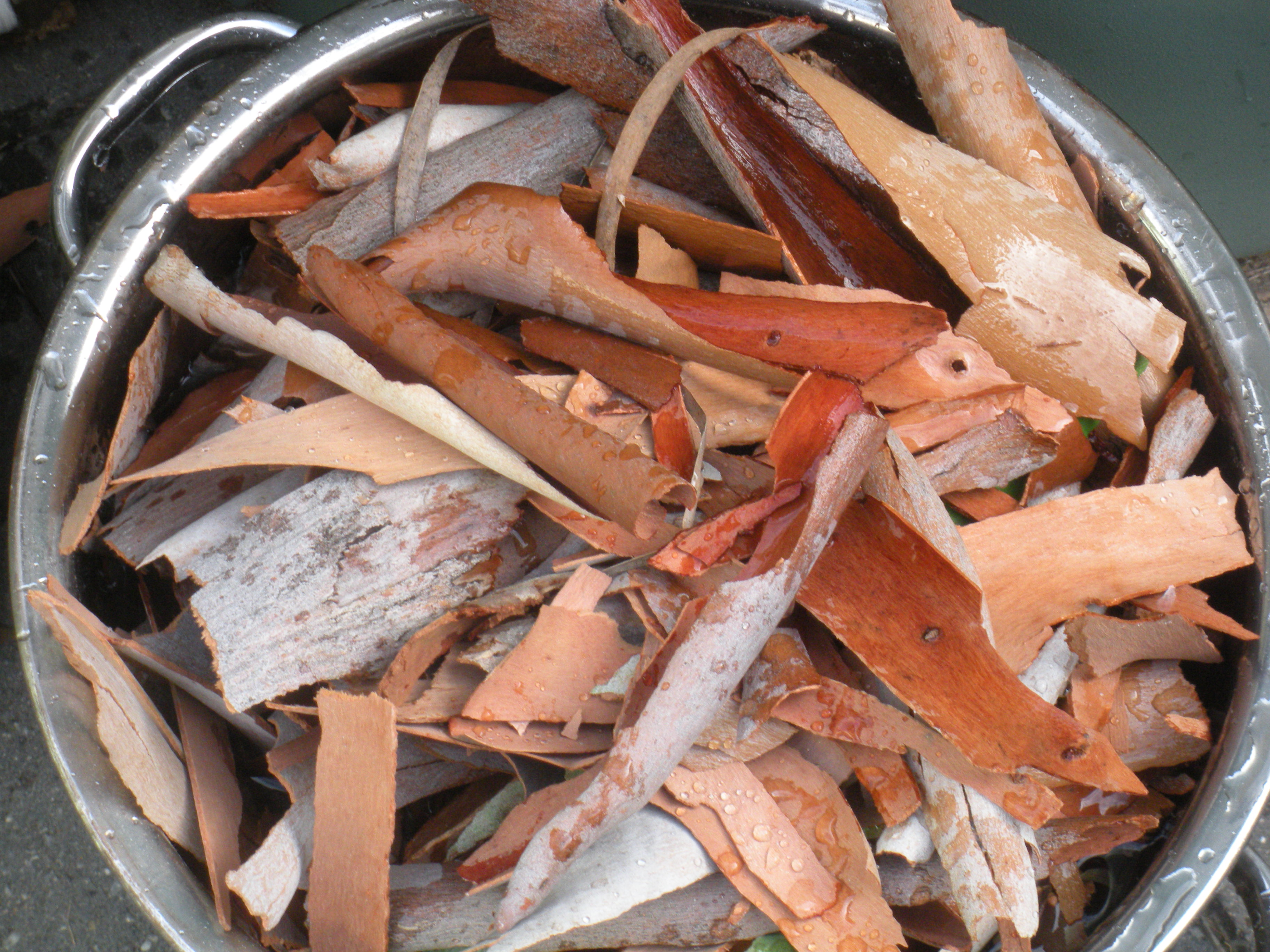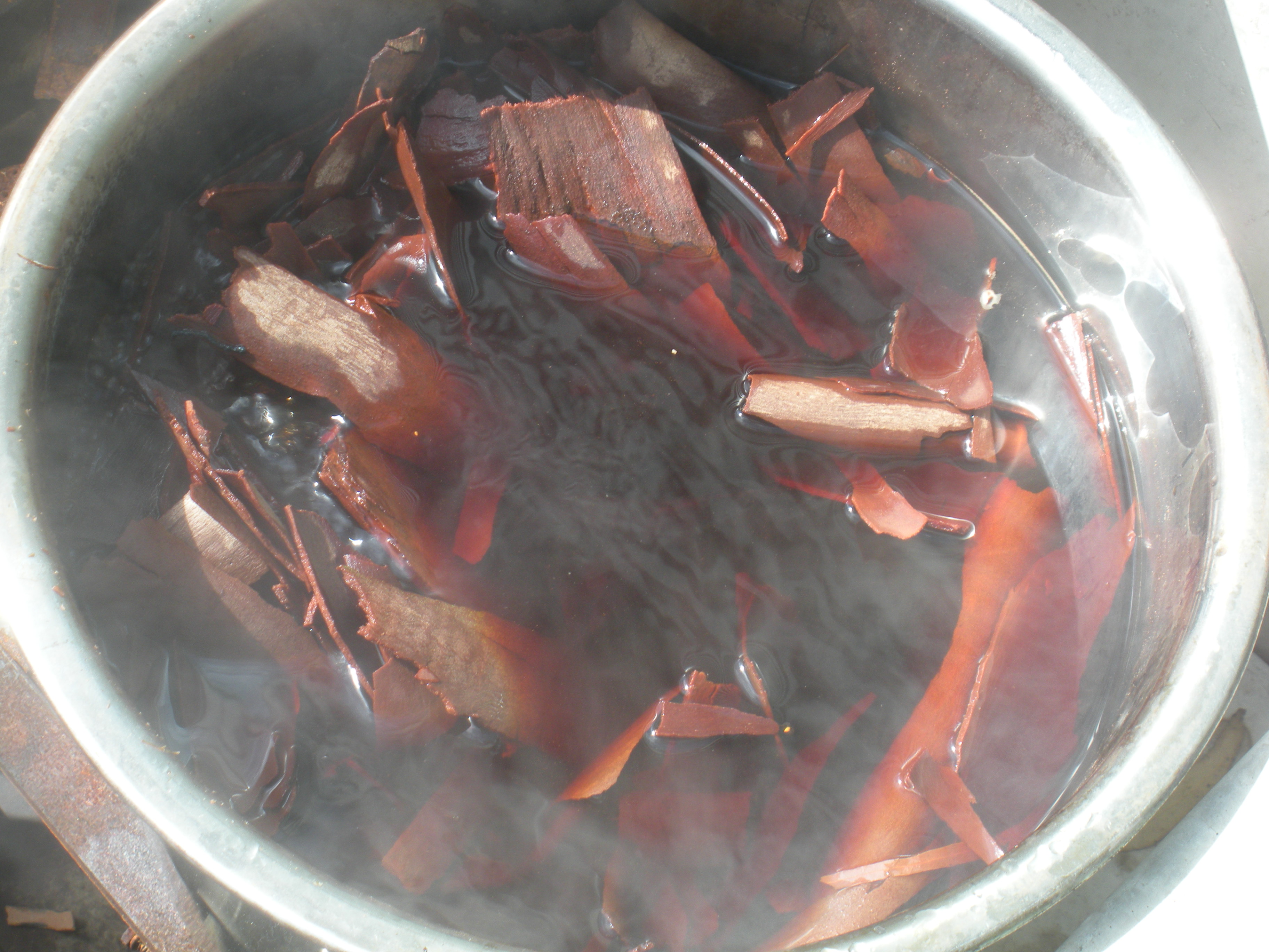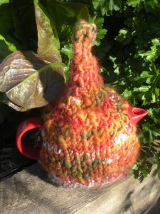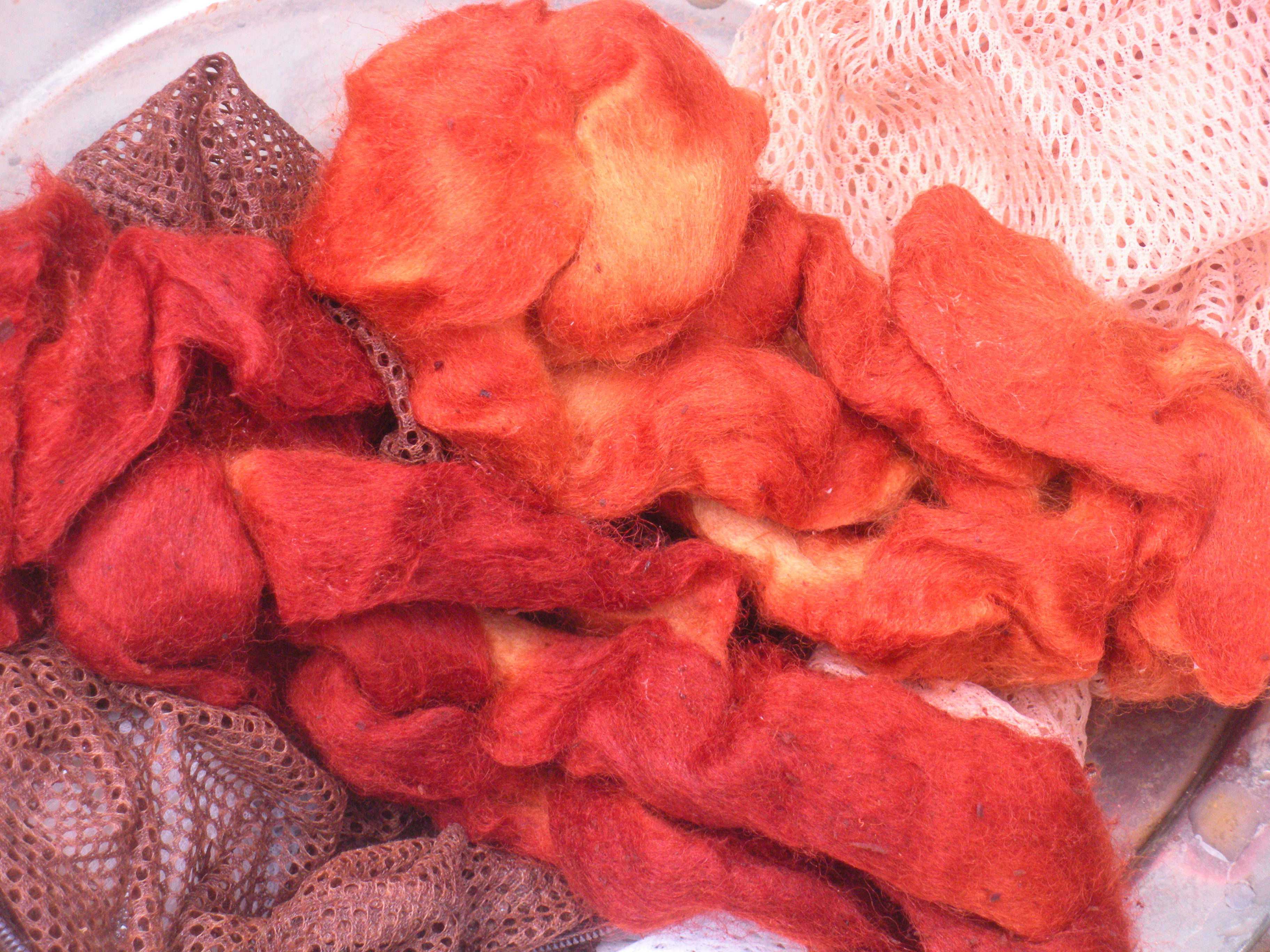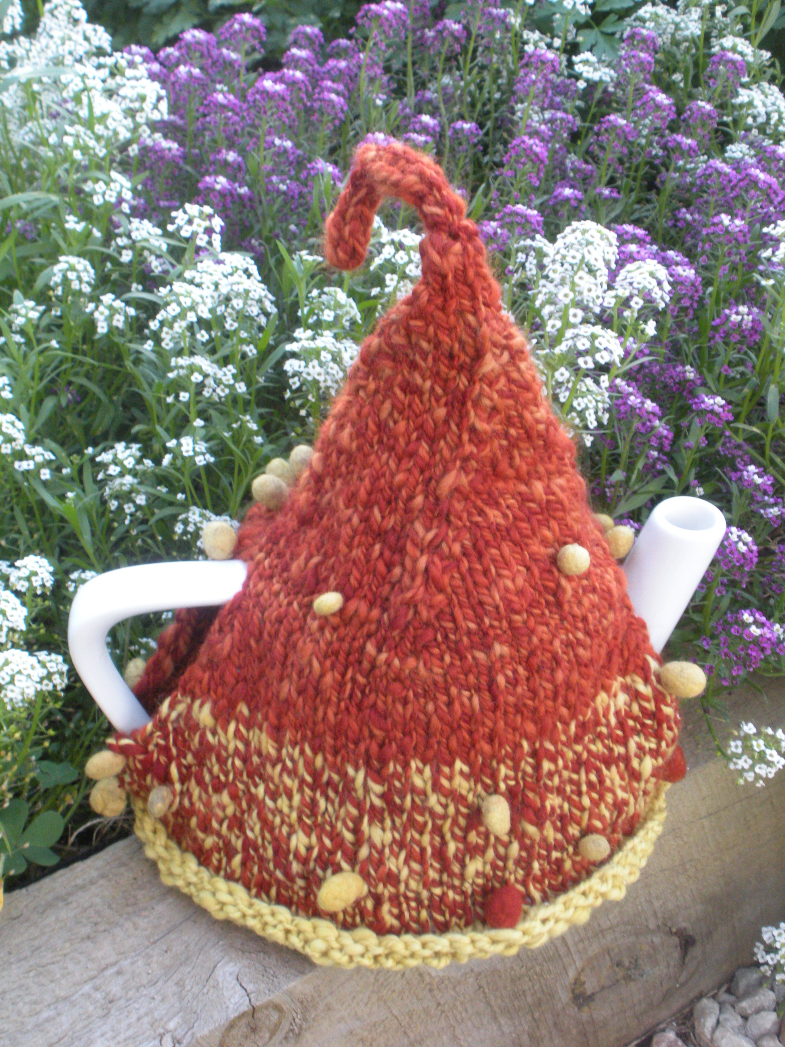 Meanwhile, I have sieved out all the leaves and bark, added more dried leaves and my smallest piece of iron pipe, applied heat, and we’ll see how that goes… Finally, here is another tea cosy. It’s made from merino dyed with Eucalyptus–for the orange– and Silky Oak (Grevillea Robusta)–for the yellow– with felted shapes spun into the yarn. Once again, this is based on the Fun and Fast tea cozy by Funhouse Fibers.