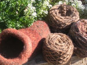 Here are my first few balls, and a slipper with some polwarth content and some eucalyptus dyed wool content to give me hope…