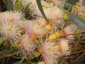 I find Coolgardie Gum easy to identify. When I was a child we lived in the goldfields in WA where this tree is from. We lived in Kalgoorlie for a while, and this tree grew there as well as over to Coolgardie, which we used to visit. The other town Wikipedia mentions as within its range is Widgiemooltha. When I was a kid you could hardly call Widgiemooltha a town, but there was a dam there that someone had set goldfish free in. We went there once and came home with 15 goldfish, all different! It was a fantastic day out, picnic plus new pets–what more could a young person want? We used to break the beak off the bud caps from this tree and string them to make necklaces. They are distinctive.