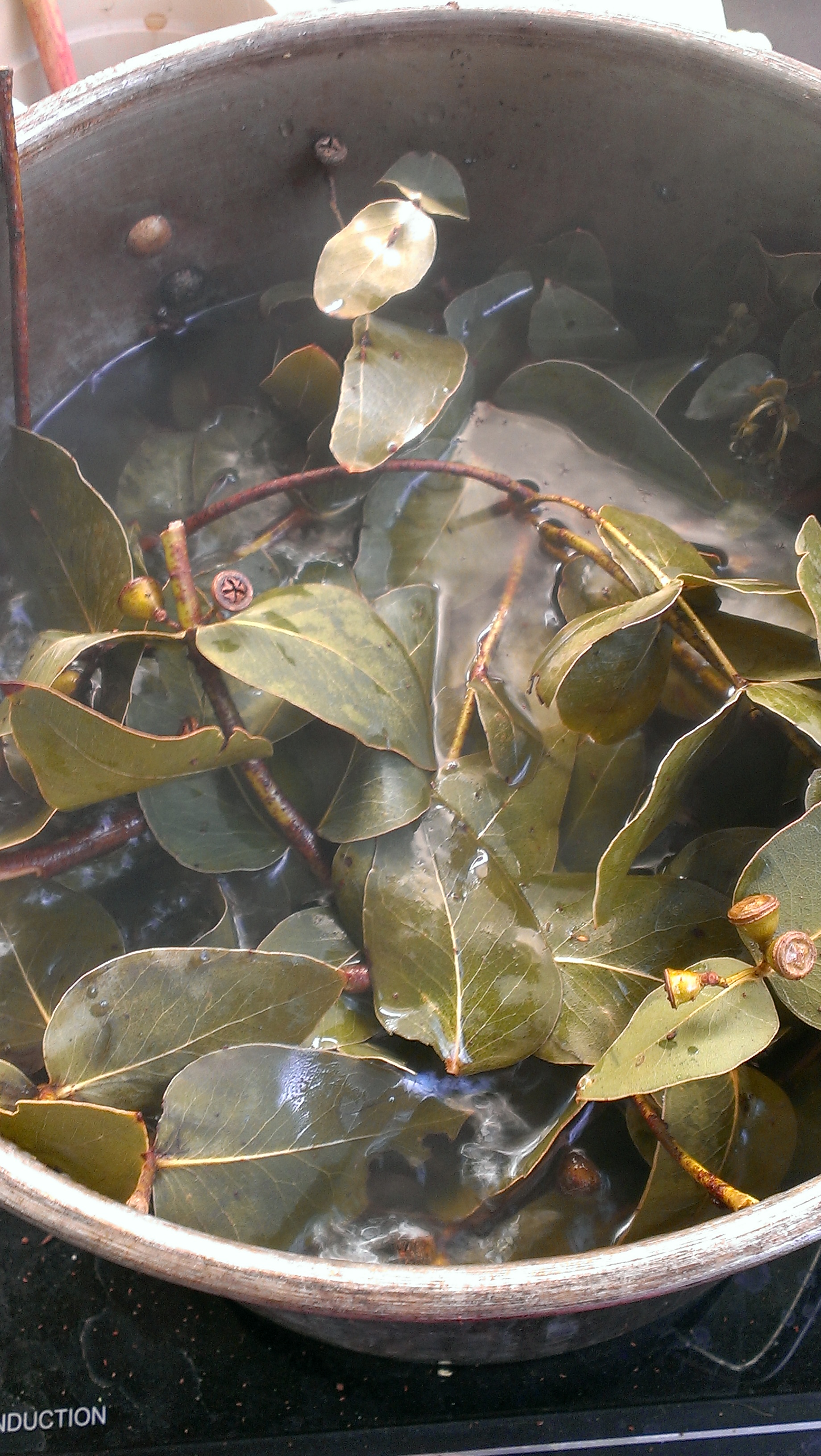 On the second visit to trim the E Cinerea, my friend’s partner spoke about the loss of a bough on their other eucalypt. I looked closely at this second very large tree with rough, fibrous bark on the trunk and very narrow leaves and ‘Eucalyptus Nicholii’ went through my head. Could I at last have found a fully grown specimen? It branched so high and the ground had been so thoroughly cleared in the effort to remove all the fallen material that I couldn’t find fruit. I did manage enough leaves for a dye pot however… and it is very promising! I heated the leaves for an hour, dropped the sample card in and went for a bike ride leaving the heat off. When I got back: