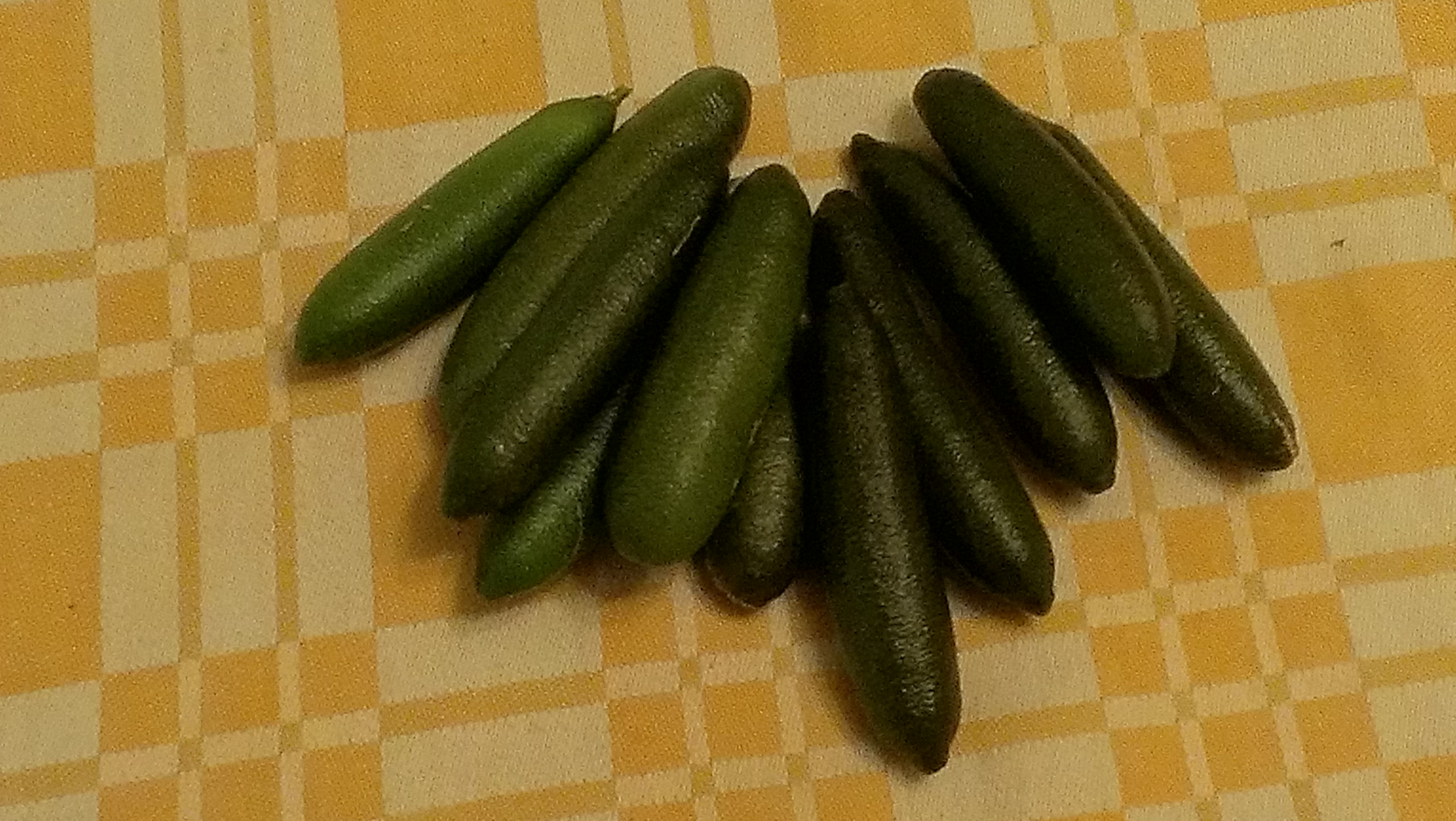 We have a little finger lime tree (Citrus australasica syn. Microcitrus australasica). This is a native plant but it certainly isn’t native to any place near me: it’s a tropical plant. A friend was growing it in a pot in a seaside location that is windy and cold in winter and it was judged to need rescue by her horticulturally knowledgeable friends, who proposed me as a suitable new host. Colour me flattered by this! We’ve struggled to find it a spot in which it can manage through winter, and this year it behaved less like a deciduous plant through the colder months and we have had a bumper harvest.