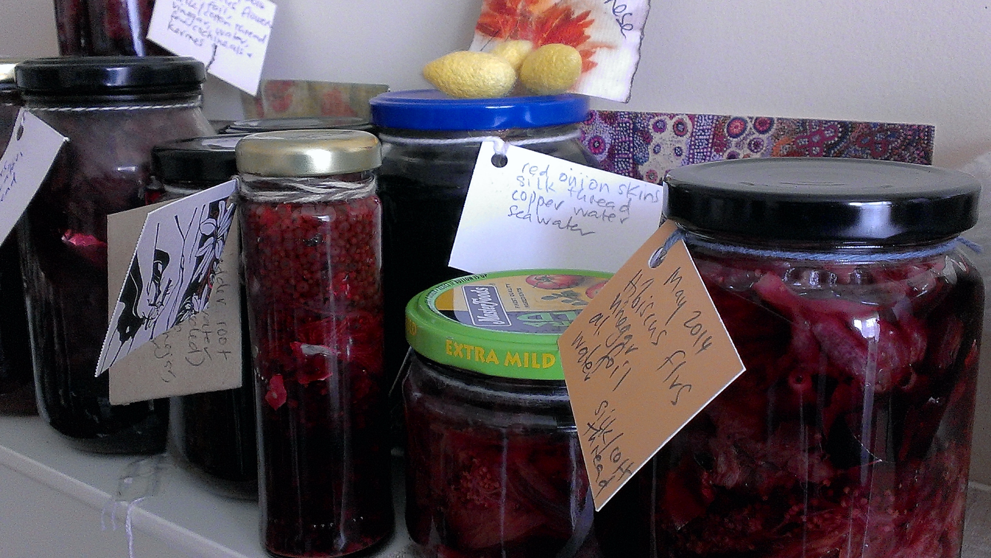 It was a day of happy experimentation, I think, the smell of fermented walnut hulls fighting it out with stewed eucalyptus bark notwithstanding. The people who came were friendly, warm and generous–a delight to be among. It was a treat to be in the company of other people who are fascinated by eucalypts and by the dye possibilities of plants. Folk were talking about what they might do with their cloth and how they might approach their neighbourhoods differently… I hope that for at least some it will be the start of an exciting new journey. By the end of the dye I was deeply weary. I took the logwood, madder and cochineal baths home with me (after taking suitable precautions against spillage) and began some exhaust dye baths next day. But by late afternoon I was down to twining silk string mindlessly and happily…