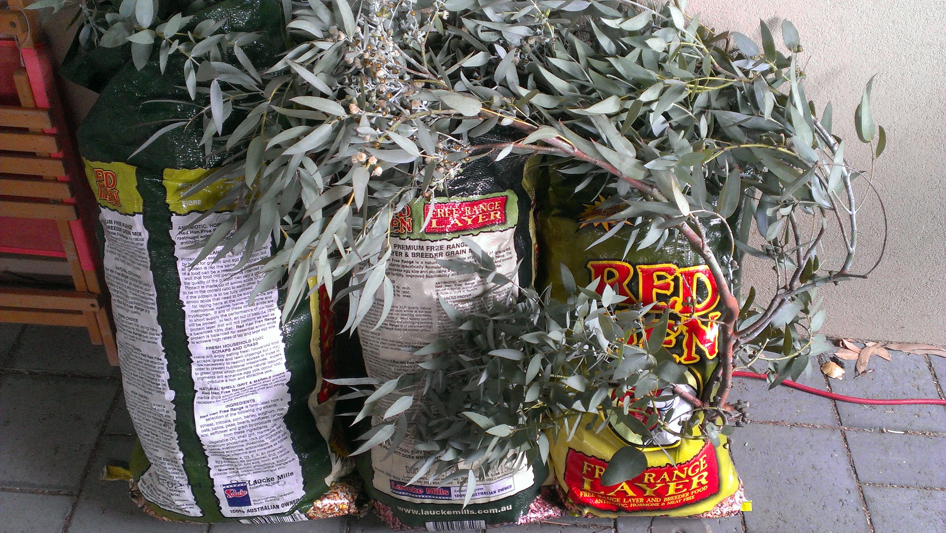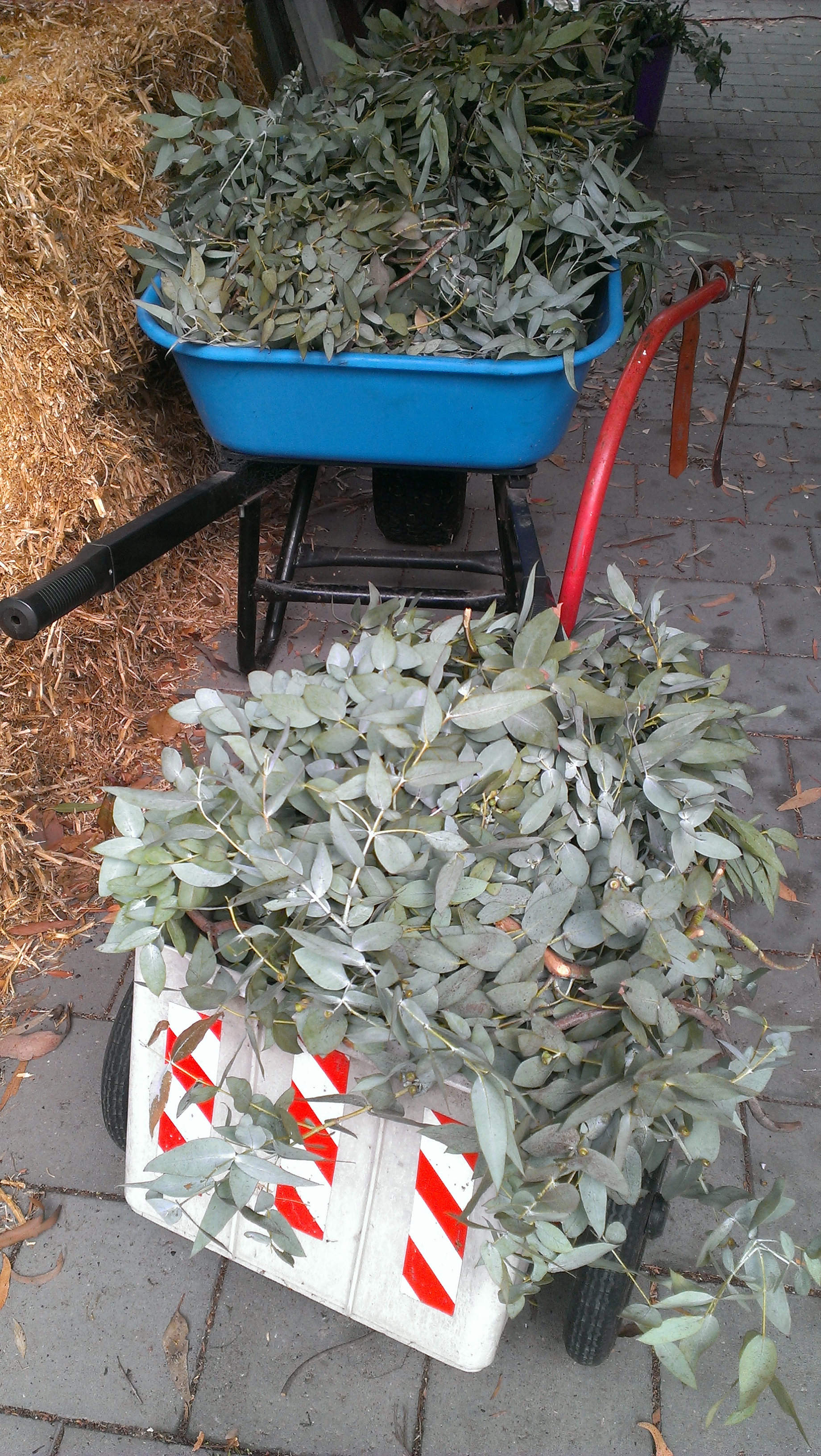 There were bags of varying sizes containing eucalypt leaves. One was clearly E Sideroxylon leaves. Then there was the orange bag of unidentified leaves–possibly E Nicholii (which has clearly been in widespread use at the Guild in the past).