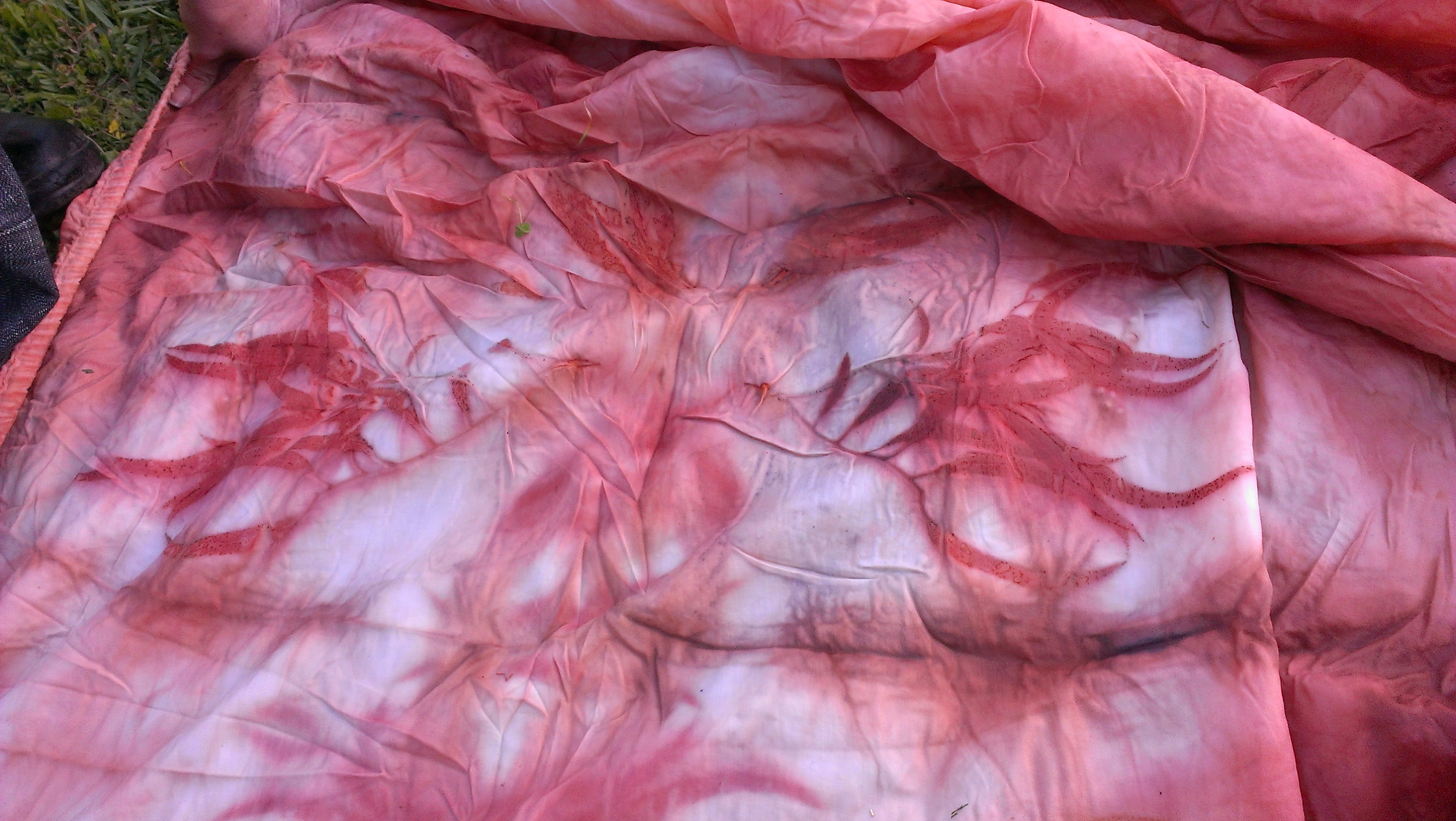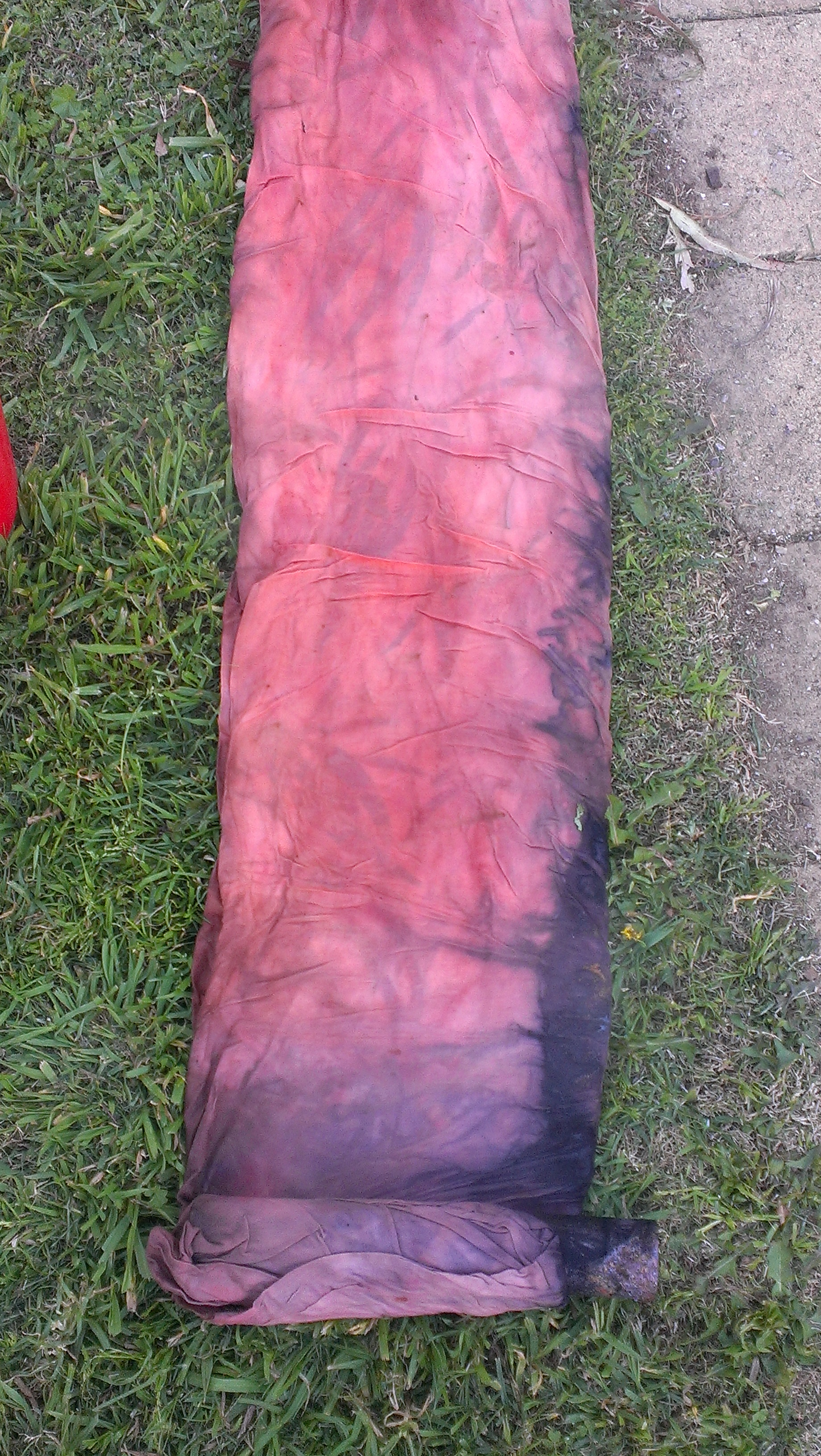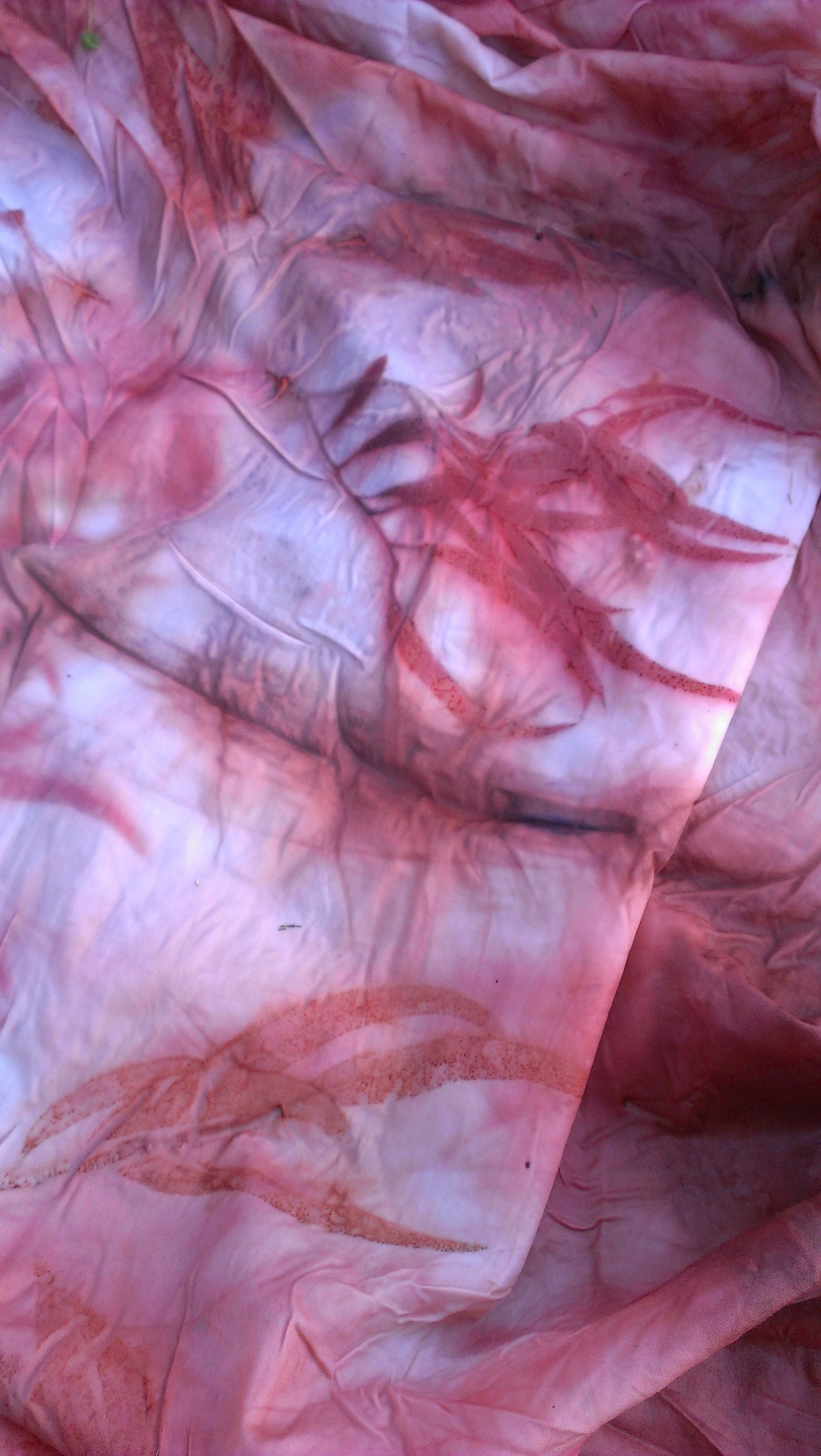 One had remarkably little in the way of distinct leaf prints. I am amazed that there was enough dye in those leaves to colour so much fabric. Unrolling…