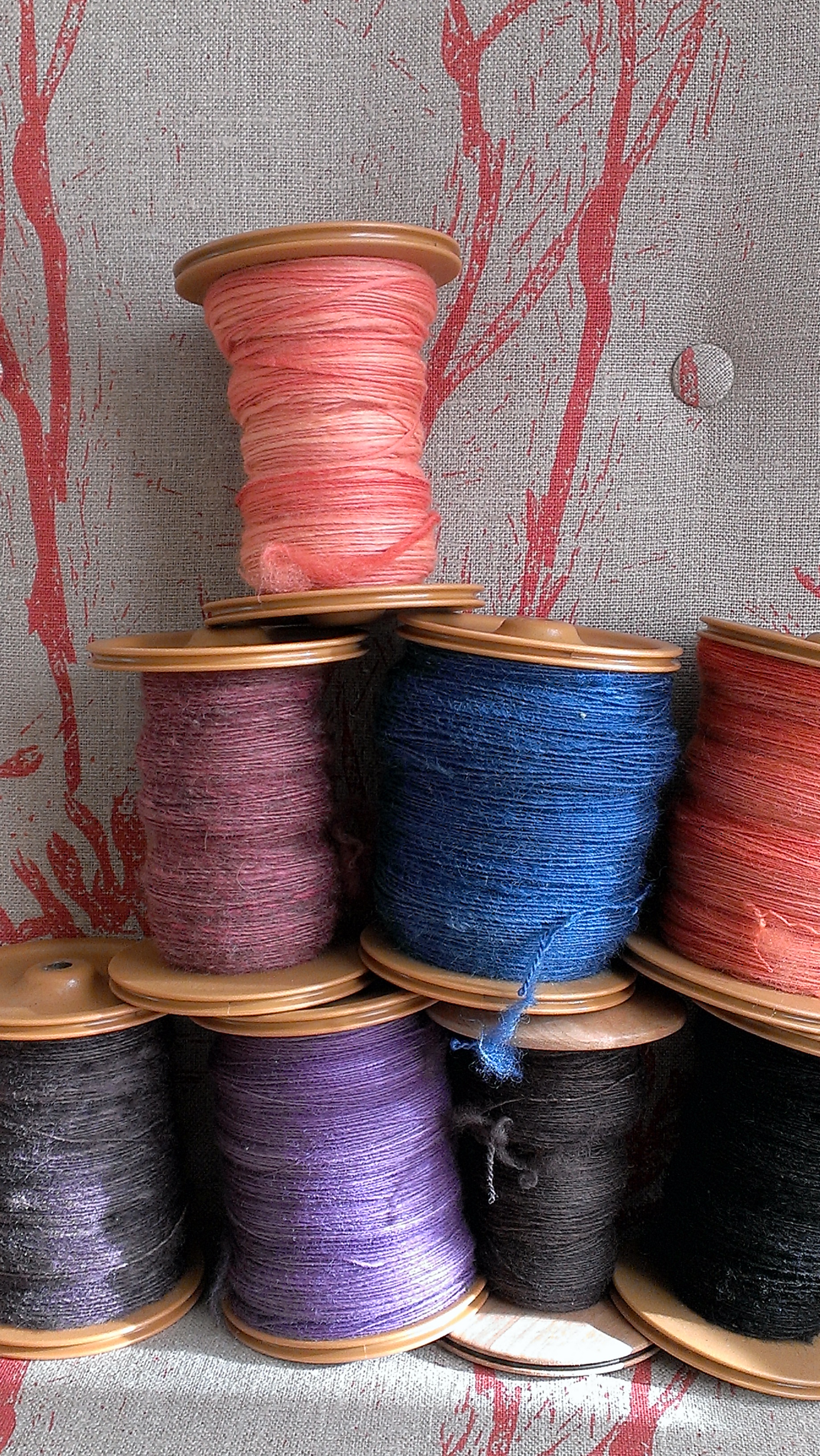 I am spinning a lot, in several different fibres. I went to a weekend away with members of my Guild recently and carded a lot of naturally dyed wool. It must be time to do some plying soon! These colours include indigo, logwood and cochineal. Many came from exhaust dyebaths after a dyeing workshop where I used old dyestuffs donated to the Guild.