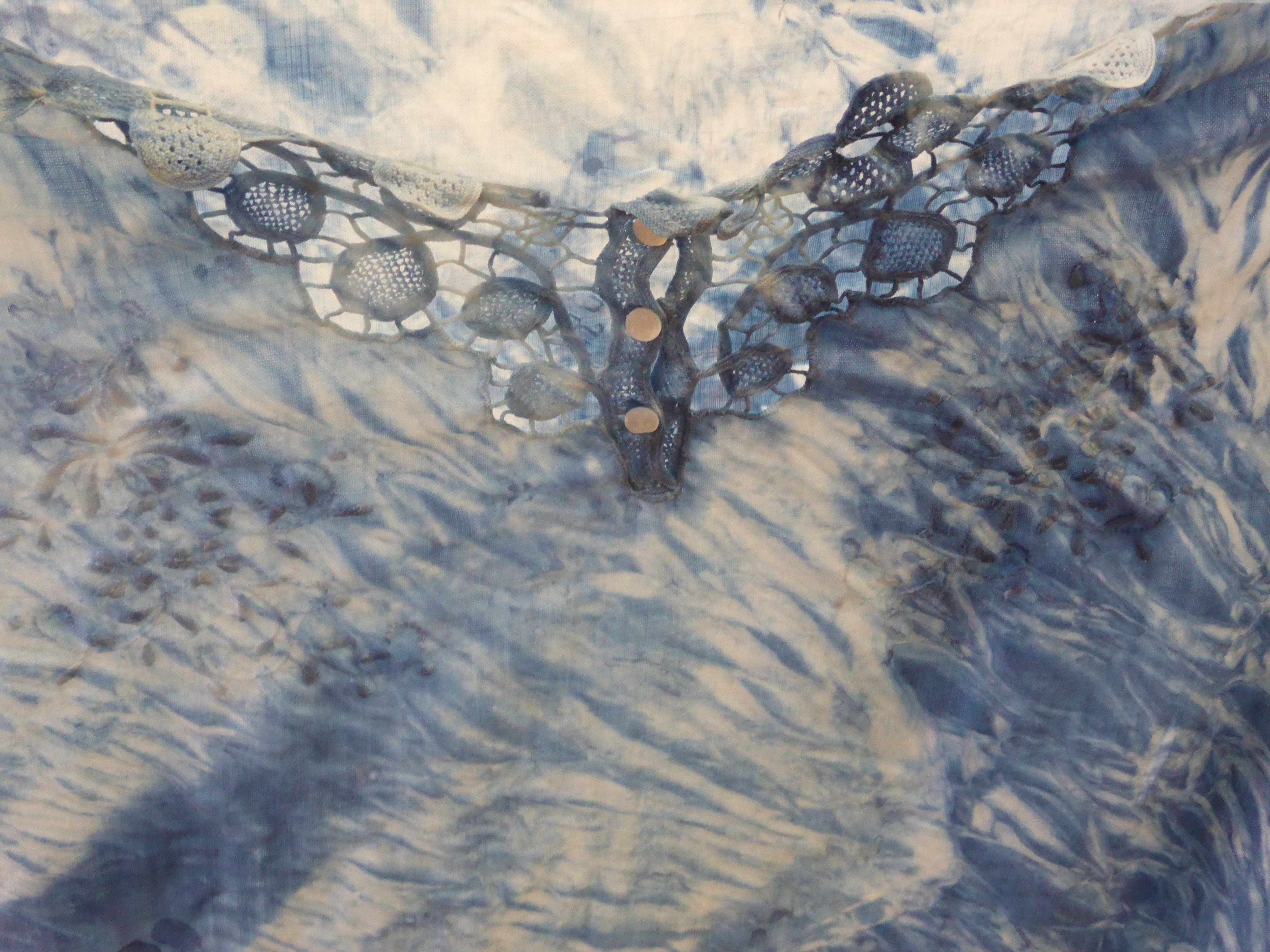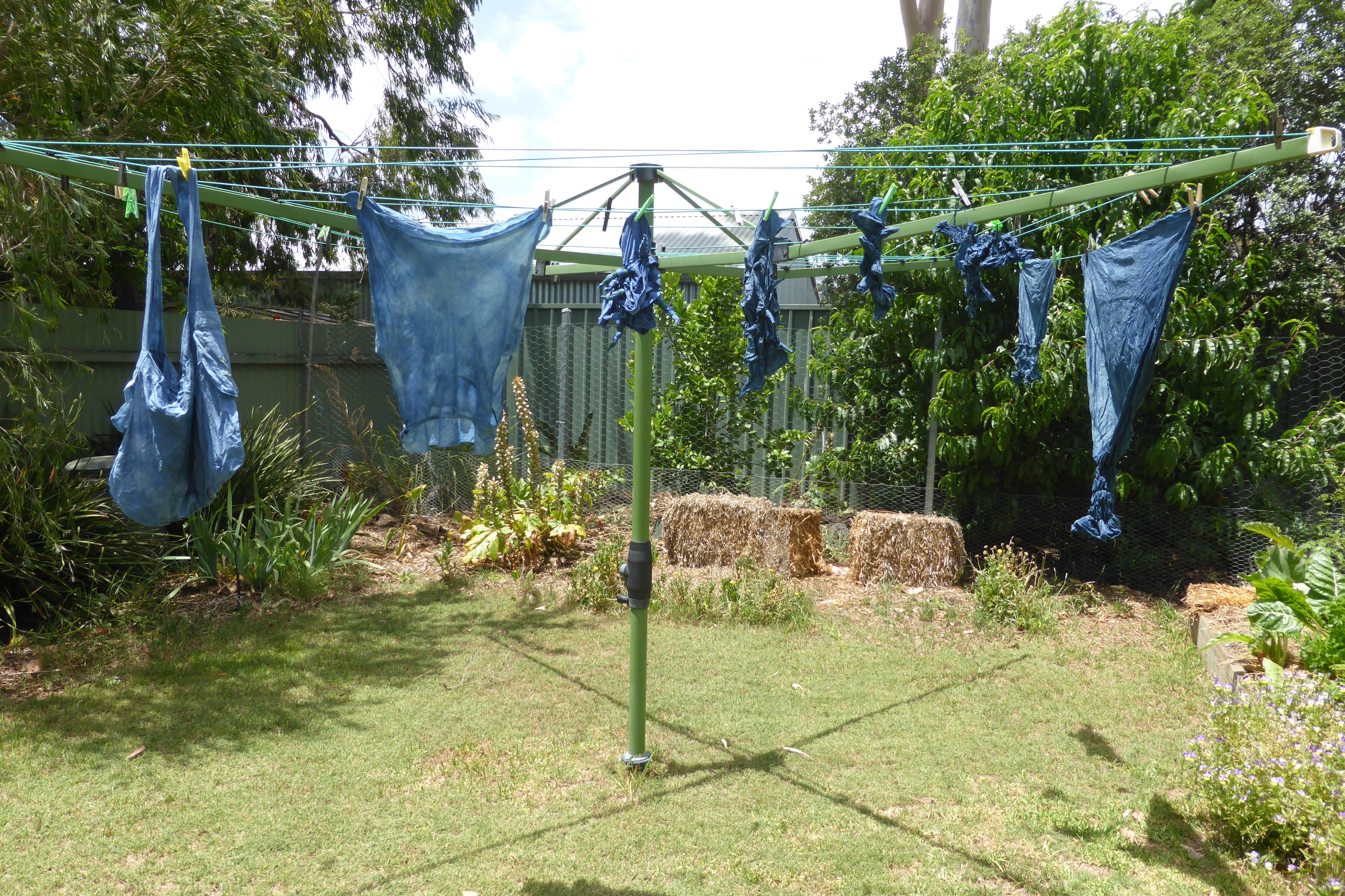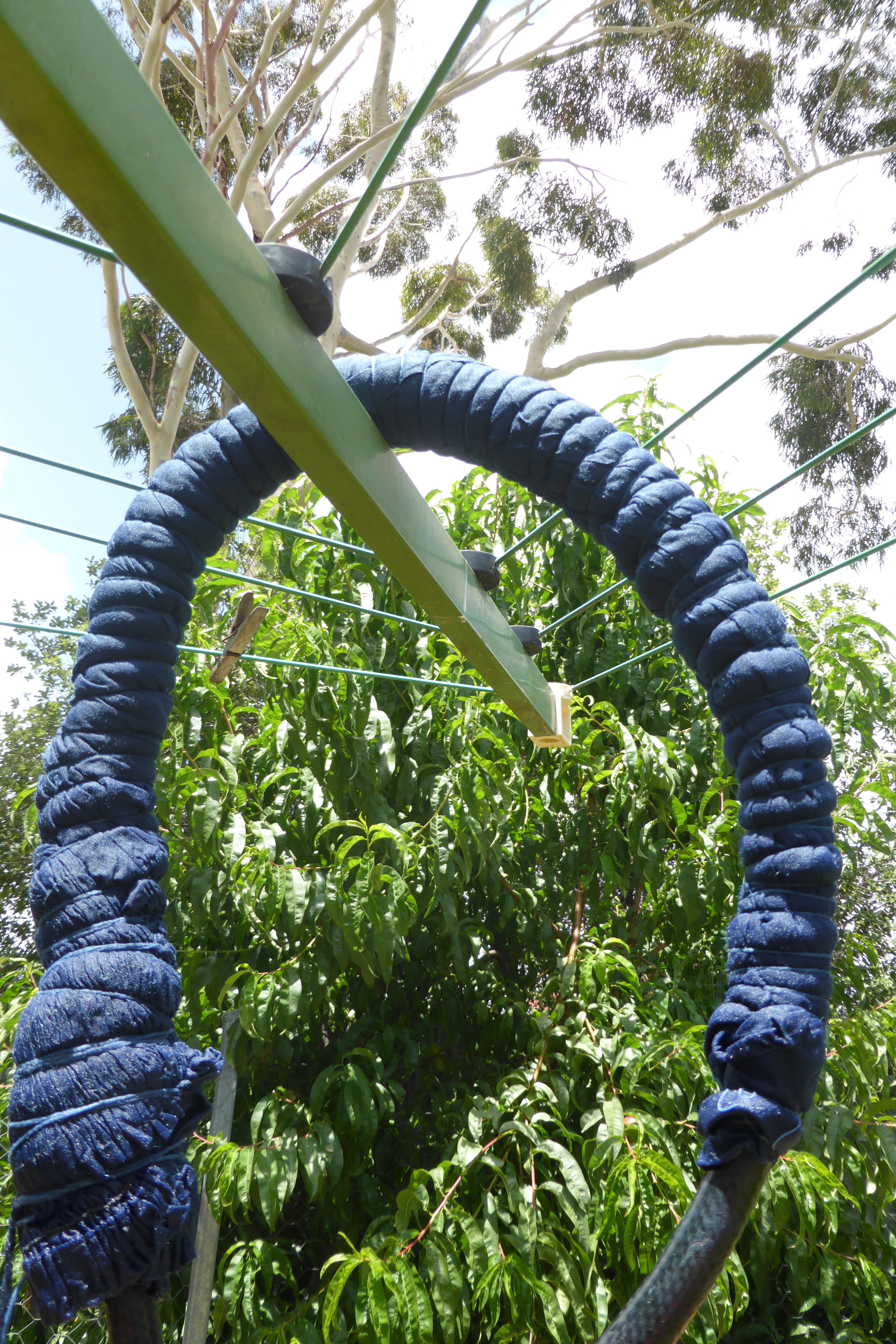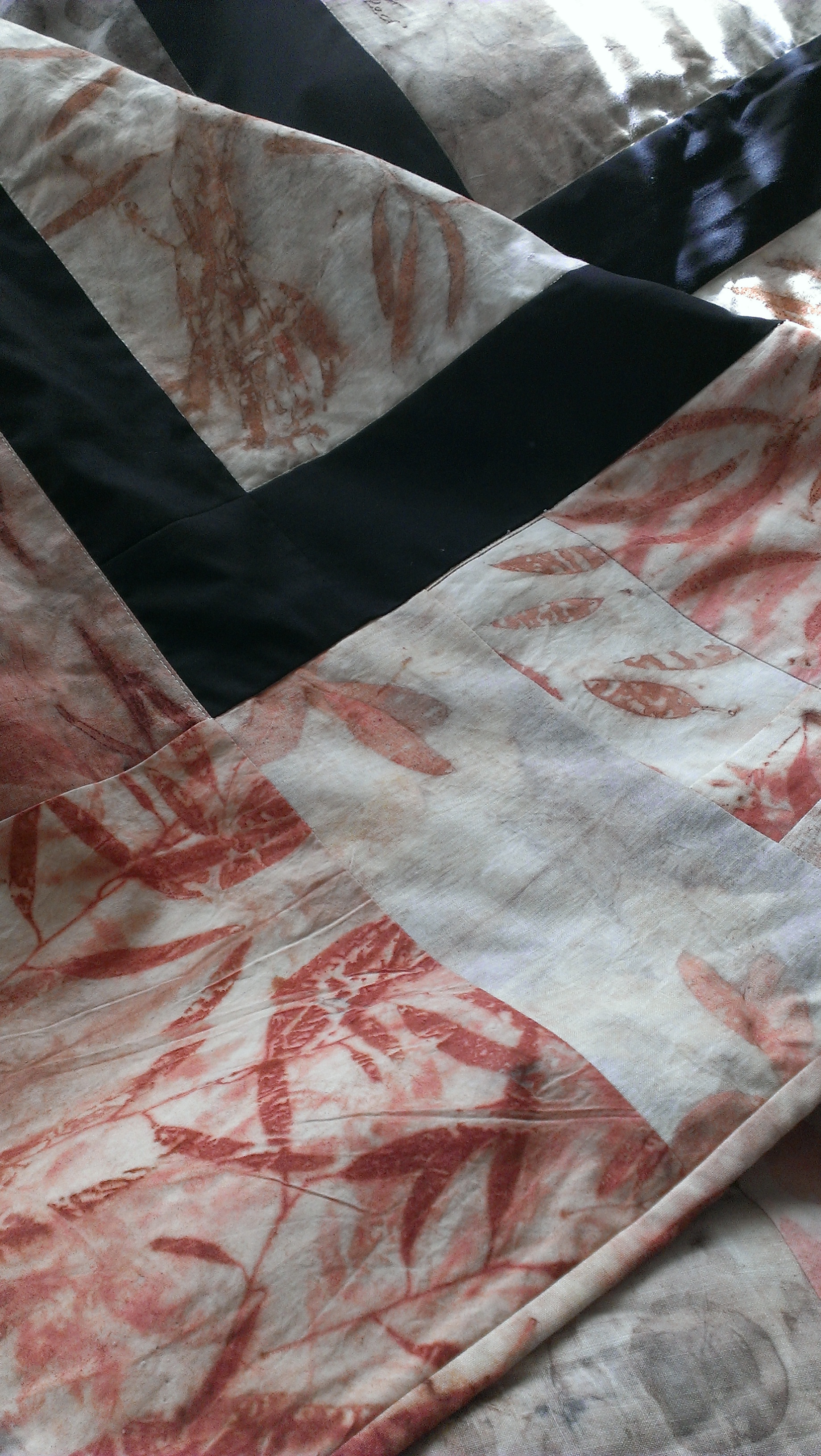 It has been a long time coming, but toward the end of my first burst of holiday time I finally got a proverbial wriggle on and made some serious quilt progress. I have created a series of blocks that each showcase leaves from a specific eucalypt, and embroidered the name of the eucalypt onto the block with eucalyptus-dyed silk thread. Who knew I had it in me? I thought I had decided against embroidery as a child, never to go back. I tracked the old posts on this project because I wondered just how long I have been working on this quilt (or not working on it, which is the routine case, of course!) Just between you and me, this post in July 2013 is my first intimation on the blog that this project was in my mind. Blocks sitting waiting for courage here. Blocks finished here. Sashing attached with help from a visiting friend here. Dyeing the border here. Back finished here. Finally, it was assembly time! Here is the back, pinned out flat on the floor, wrong side up.
