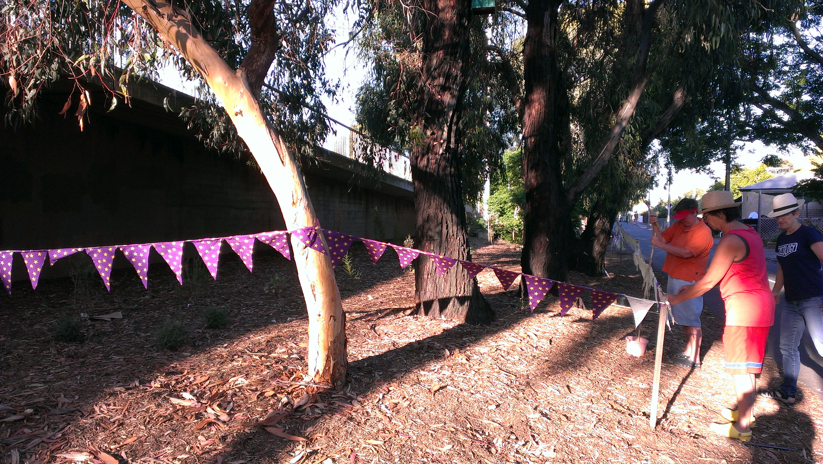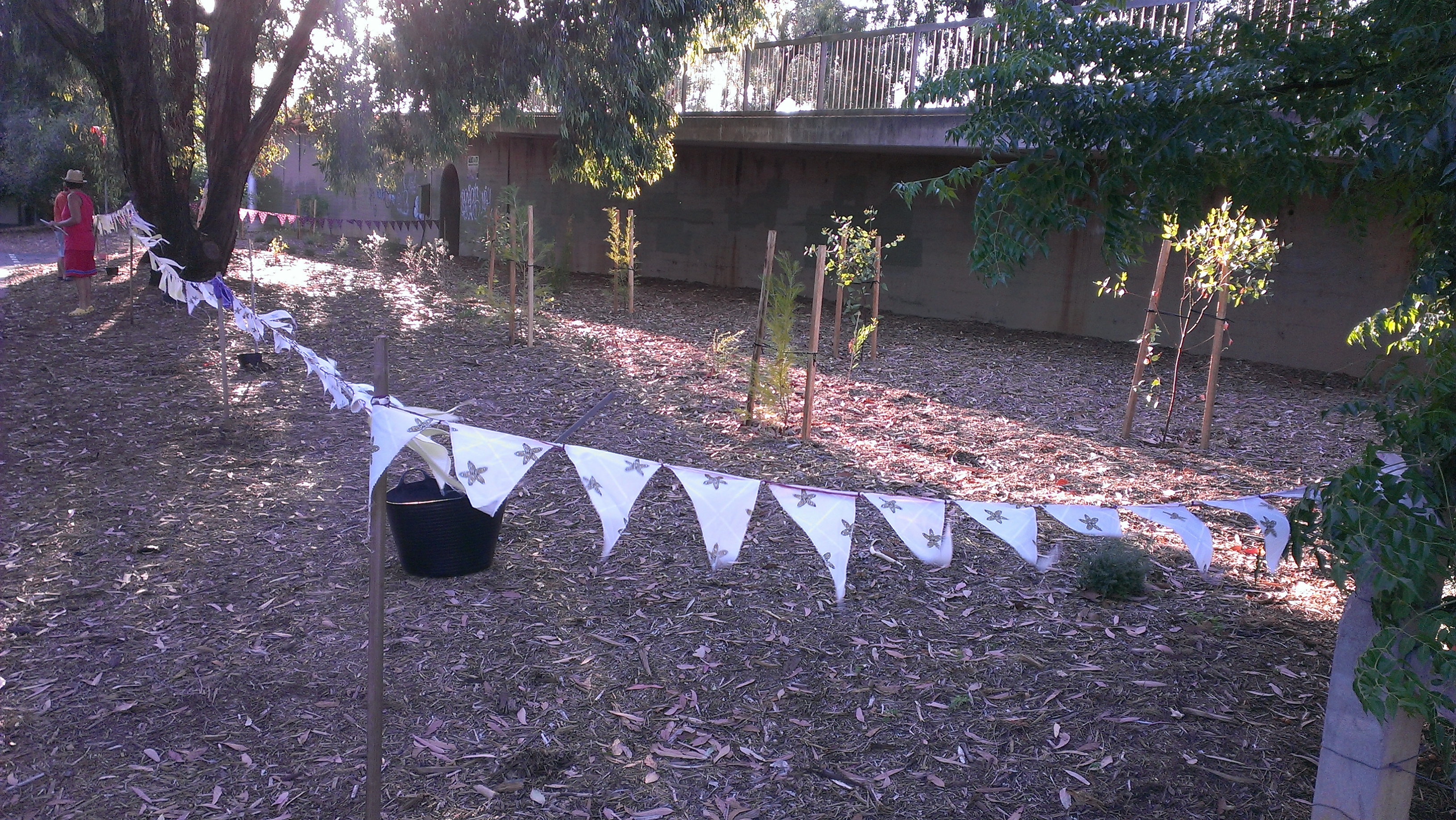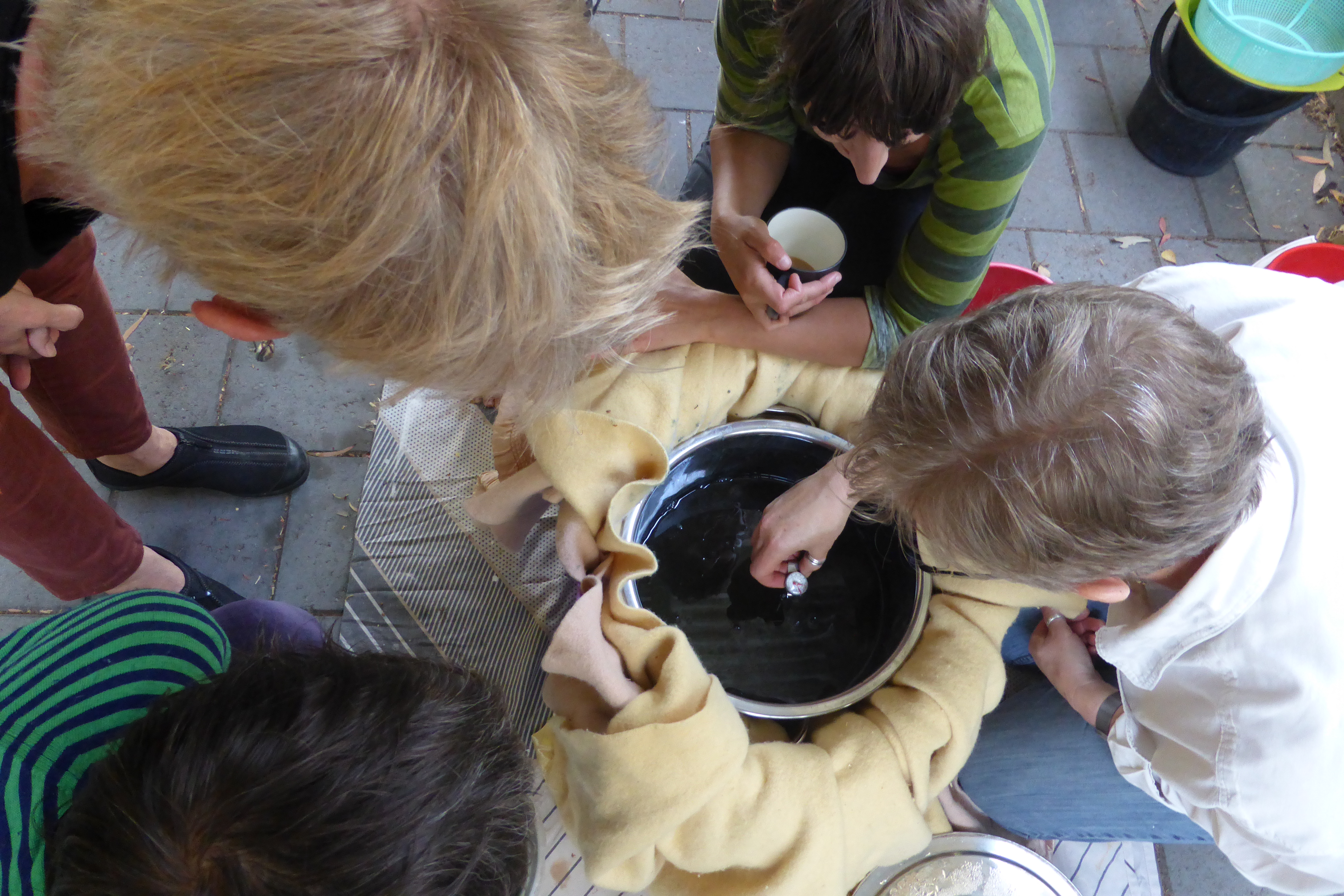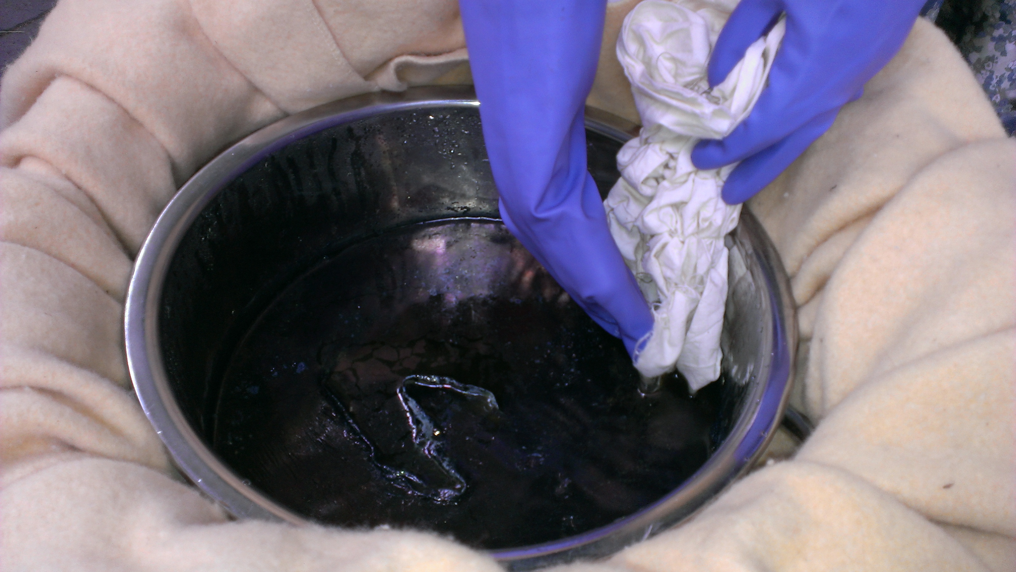 It has been a long time coming, but toward the end of my first burst of holiday time I finally got a proverbial wriggle on and made some serious quilt progress. I have created a series of blocks that each showcase leaves from a specific eucalypt, and embroidered the name of the eucalypt onto the block with eucalyptus-dyed silk thread. Who knew I had it in me? I thought I had decided against embroidery as a child, never to go back. I tracked the old posts on this project because I wondered just how long I have been working on this quilt (or not working on it, which is the routine case, of course!) Just between you and me, this post in July 2013 is my first intimation on the blog that this project was in my mind. Blocks sitting waiting for courage here. Blocks finished here. Sashing attached with help from a visiting friend here. Dyeing the border here. Back finished here. Finally, it was assembly time! Here is the back, pinned out flat on the floor, wrong side up.