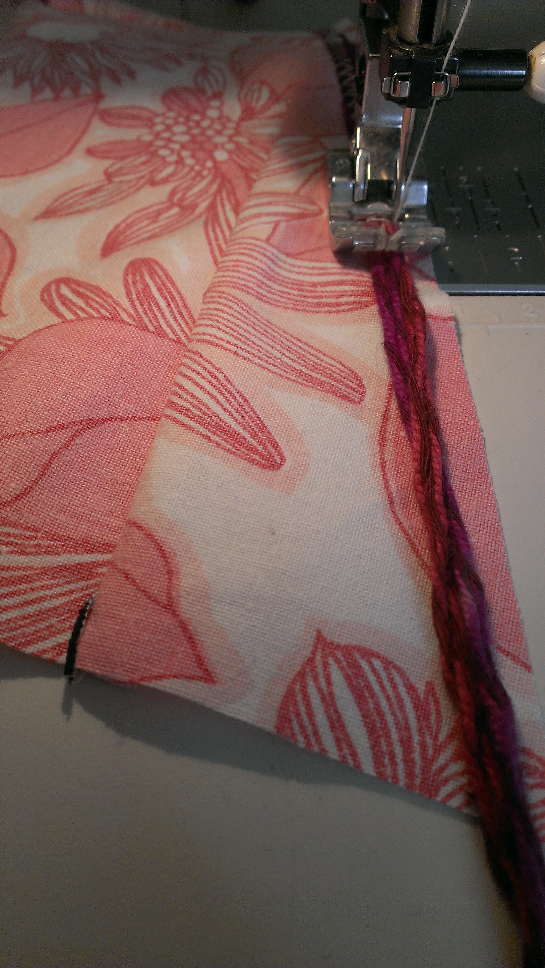 I do understand bias binding, and there are places for it, but I can’t see the point when binding a straight edge, so I went with on-the-grain binding and contrary to the instructions, sewed seams straight across at 90 degrees (okay, it creates less bulk to use 45 degree seams–that part, I concede). I made an exception when I had a moment of curiosity and finished with a lovely 45 degree seam–seen under sewing-machine-mood-lighting below. Because who needs seams that match? Maybe next time I’ll give all the binding that treatment, you just never know. I followed the instructions for mitred corners. Simple and effective! Much better than my own past efforts at reverse engineering without instructions. Done!