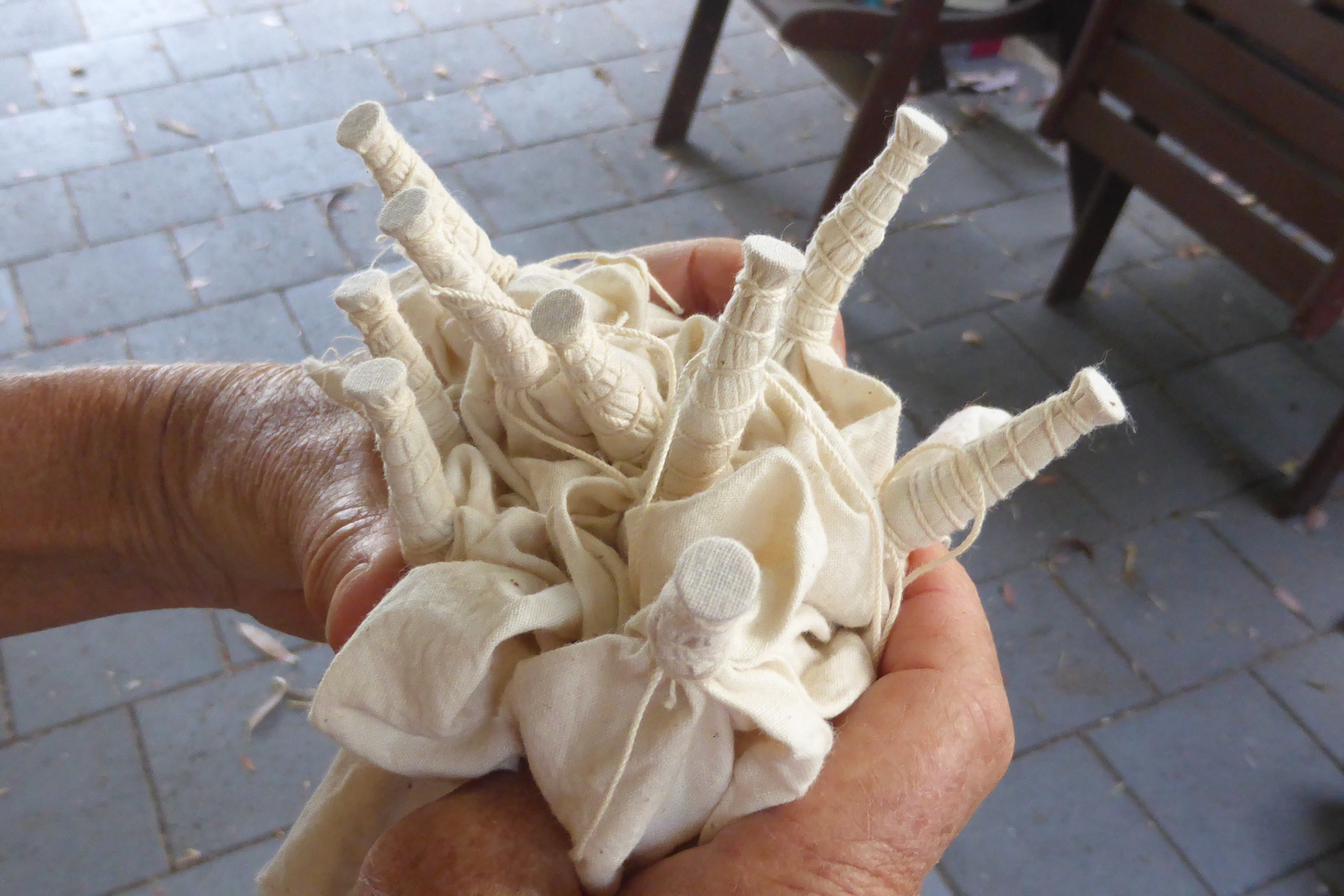 I love the wrong side. Of most things. The back is made of a mix of recycled, inherited and thrifted fabric. Next, the minimal batting option for women of a certain age in a warm climate: an ancient flannellette sheet, well past its prime. It’s hard to tell it was ever blue now.