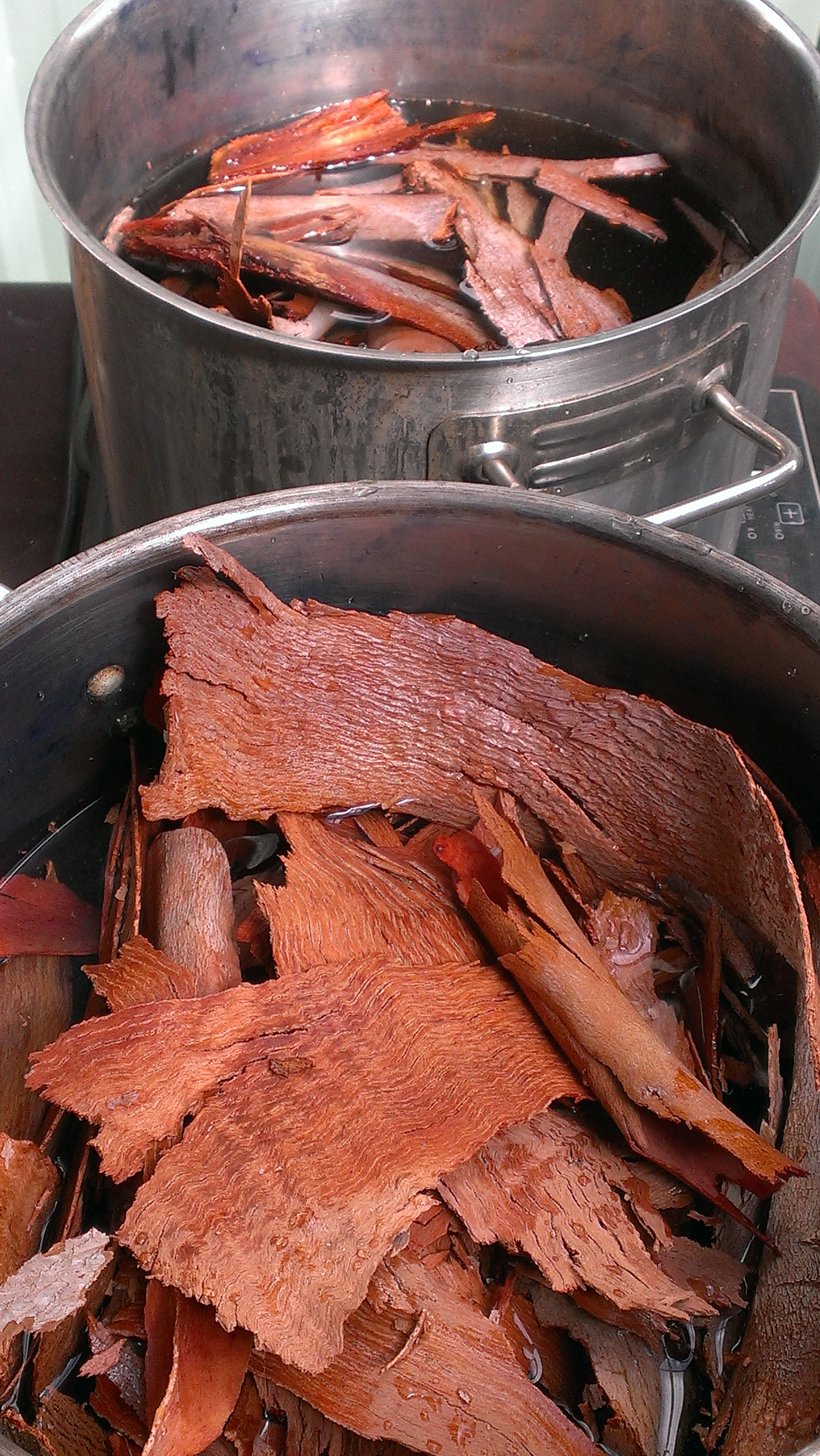 At the end of the year, my sisters and I were out walking and gathered some E Polyanthemos bark.  This is a purely speculative dye pot.  And it has been waiting in a cardboard box.  I moved it to a dye pot and came out next day to add water.  Do you see what I see?