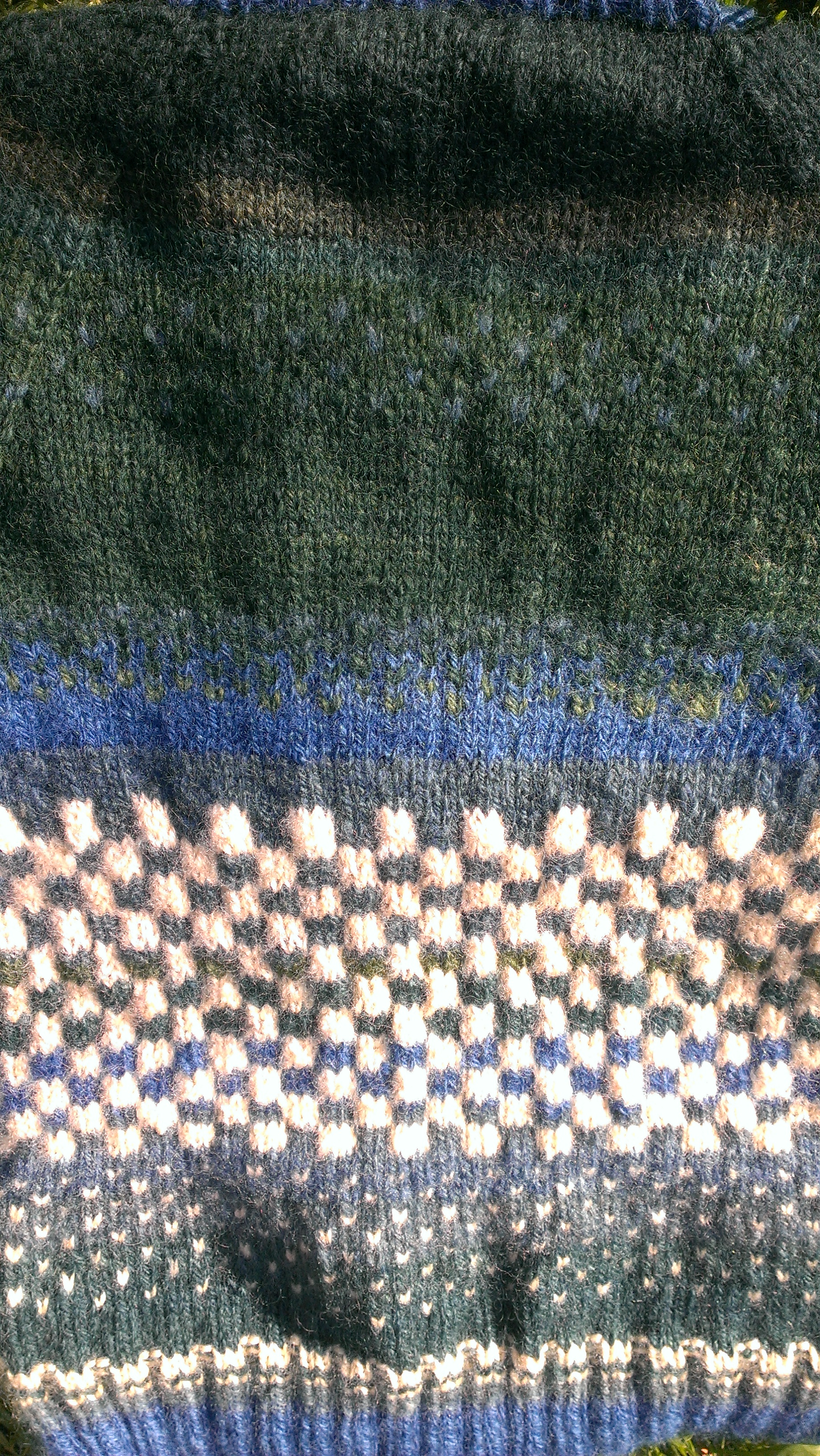 very very clever hands doing it that way, wow! the hardest thing with fairisle knitting is the tension once you have got used to manipulating the 2 threads. what a lovely design, stars and roads/waves, it’s beautiful. the great thing about handknits is that if looked after properly they get passed down and treasured by further generations – I am sure this will be.