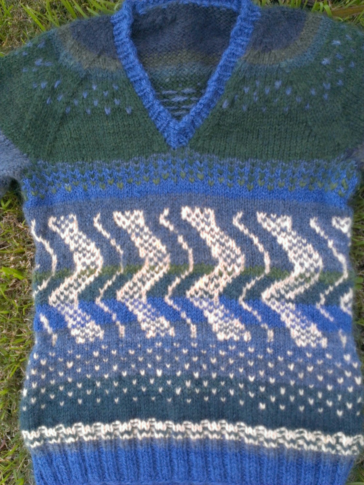 The yarns are mostly from Malcolm the corriedale (may he rest in peace), a sheep who had a long and well loved life in the Adelaide Hills, and a pet Polwarth, also from the Hills. The creamy pale yellow is from an exhaust bath of coreopsis saved by my mother, a fabulous and generous gardener. The greens are from that same coreopsis and from osage orange shavings donated to the Guild overdyed with indigo. The blues are from indigo. The jumper was designed with much guesswork with help from the intended recipient, my fairy goddess-son (and lots of help from his mother, my friend)–and with so much encouragement from friends, retreat companions and strangers.