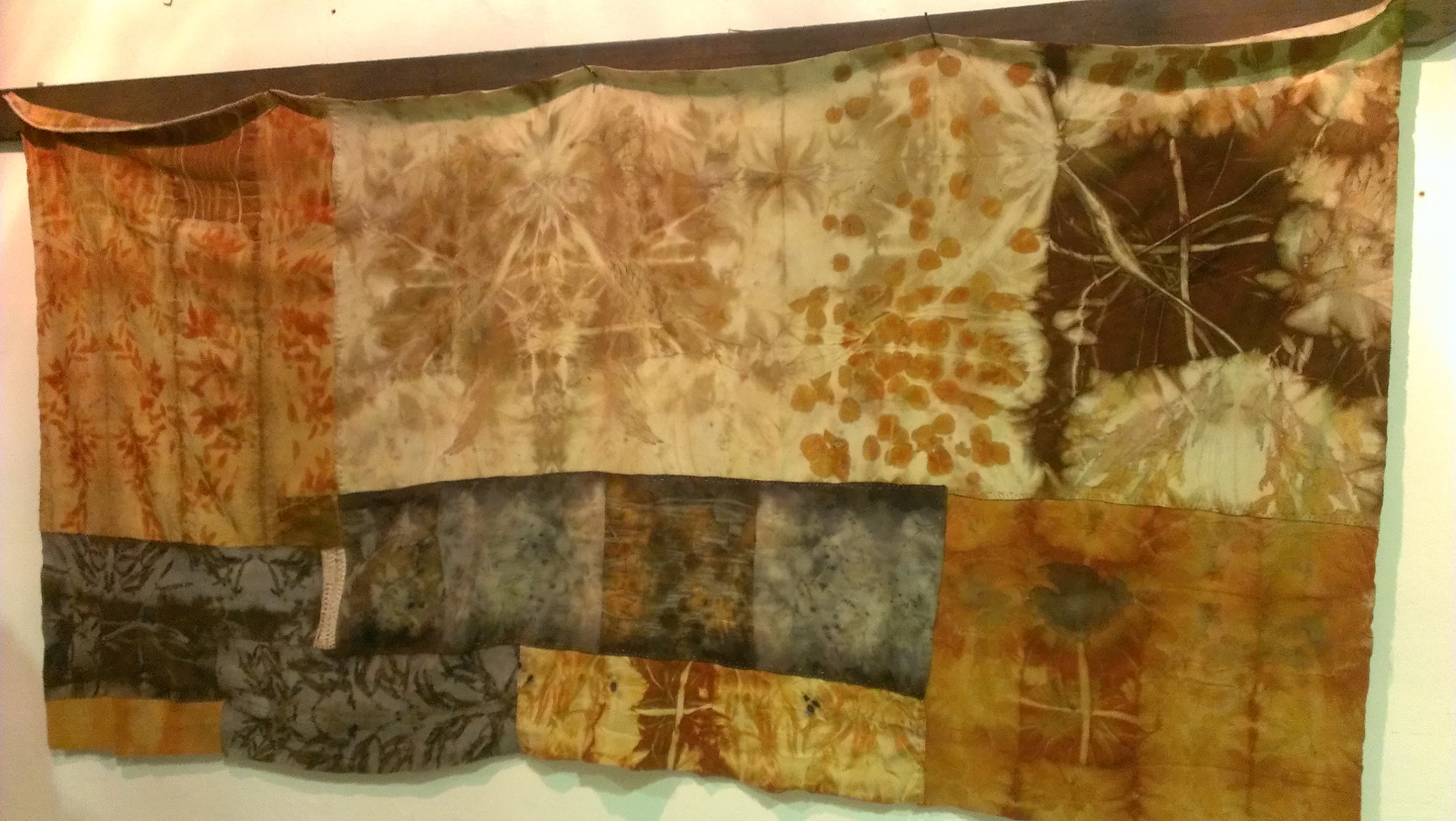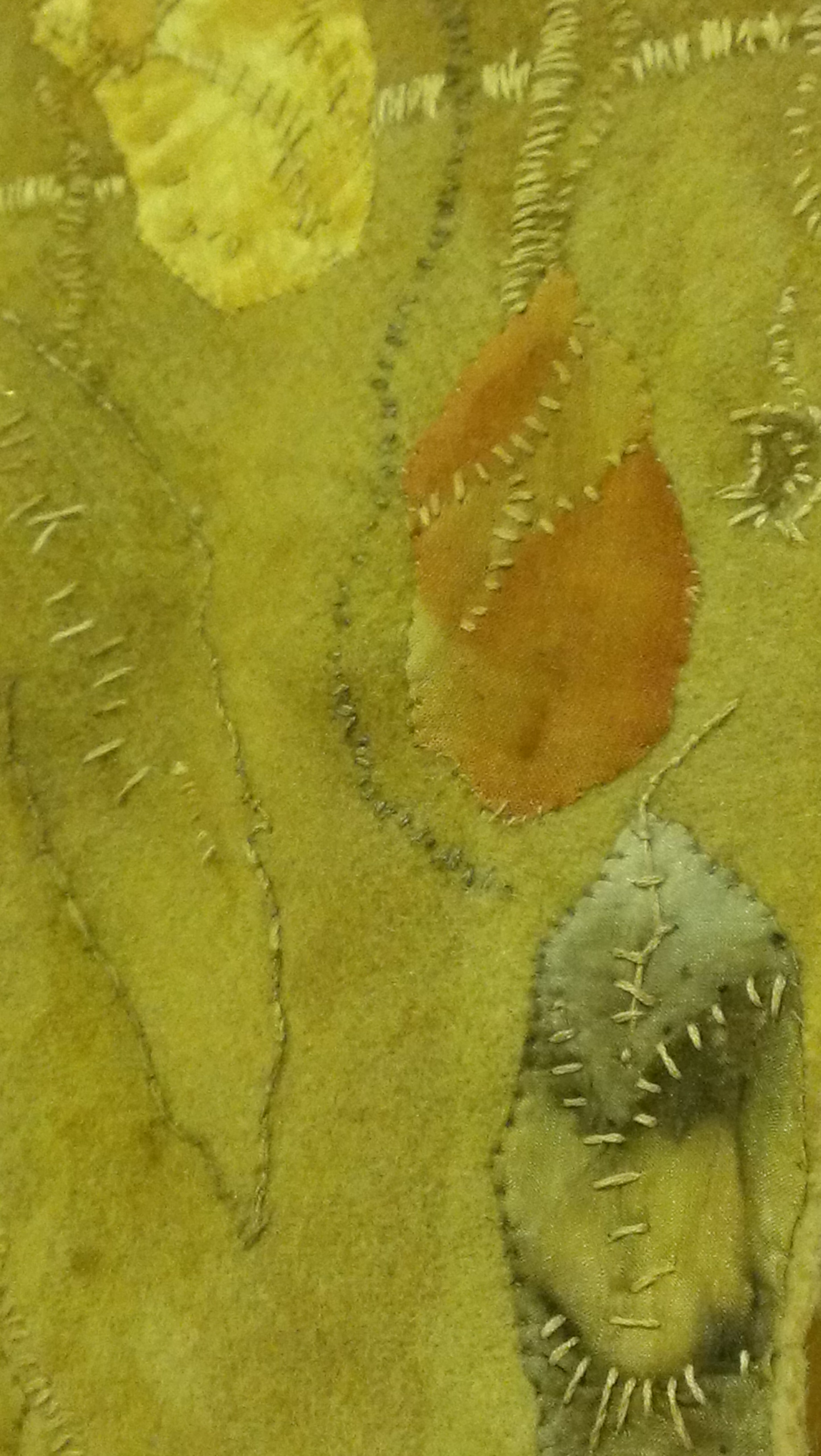 India Flint’s work is substantial in every way: created from segments of eco dyed blanket and nailed to a massive piece of kauri with nails that would make my father proud. (He is the kind of man who would never use one nail if four nails could do the job.) The colours and leafy shapes are glorious, and the trails of eucalyptus dyed stitching form an understated uniting tracery that seems to me to be a signature of India’s.