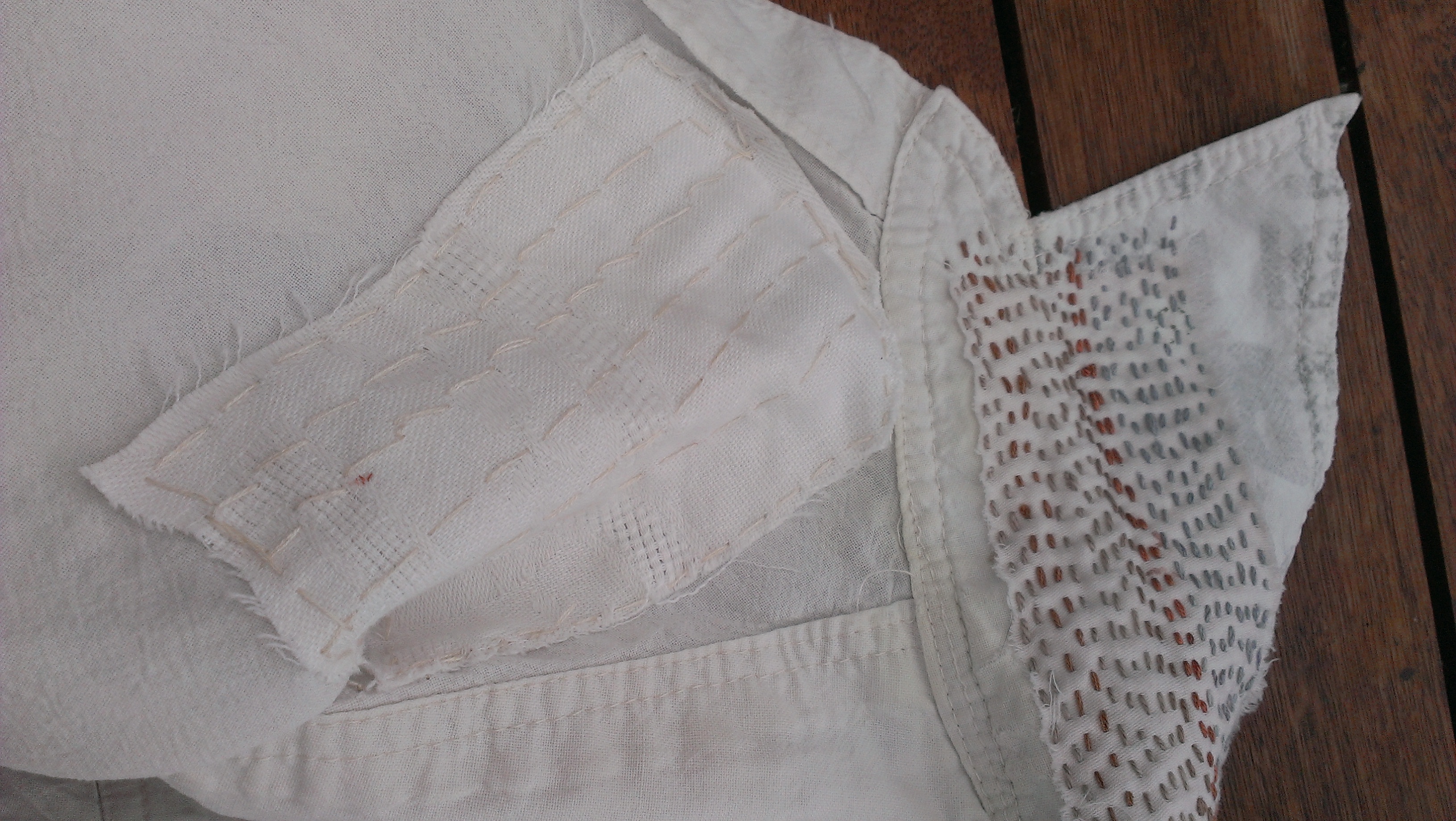 But I digress… The pockets had given way most spectacularly in places. There was nothing for it but a complete rip out and retrofit. Not my idea of a good time, I confess. Off with the belt loops! Out with the pocket bags! And on and on it went until I had nice, plain, bottle green, intact pocket bags. The mending doesn’t remedy any of the original defects of the garment, but that’s a pair of work pants for summer I can wear without showing off parts of me that shouldn’t be on display. I did a quicker, less dramatic mend on the other pair I made the same year to address small holes in the pockets, and that’s some big items off my list. But there are more, my friends. There are more.