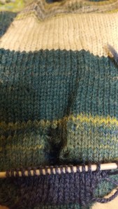 But I digress. This sock came home recently with only one hole! I made these socks a little over a year ago (follow the link for details), so they have not had a huge amount of wear. But the hole was quite big, and clearly resulted from the fabric wearing right through in a large area. Given the fact that the other sock had not worn through in the same place, I’d say there was a weak patch in the fabric, likely caused in this case by the blending of the fibres (Suffolk, mohair and silk) being uneven, or by the spinning being on the thin side, or underplied. I decided on a knit-in patch rather than a darn. So I picked up stitches at the base of the heel flap (above) and began to knit, joining on by picking up a stitch on each side of the patch each row, and knitting it together with the edge stitch of the patched section. The under-heel section will be thicker than the surrounding fabric, and the patch is generous, but I think under the heel is about the least sensitive place to put a patch and clearly reinforcement is needed!