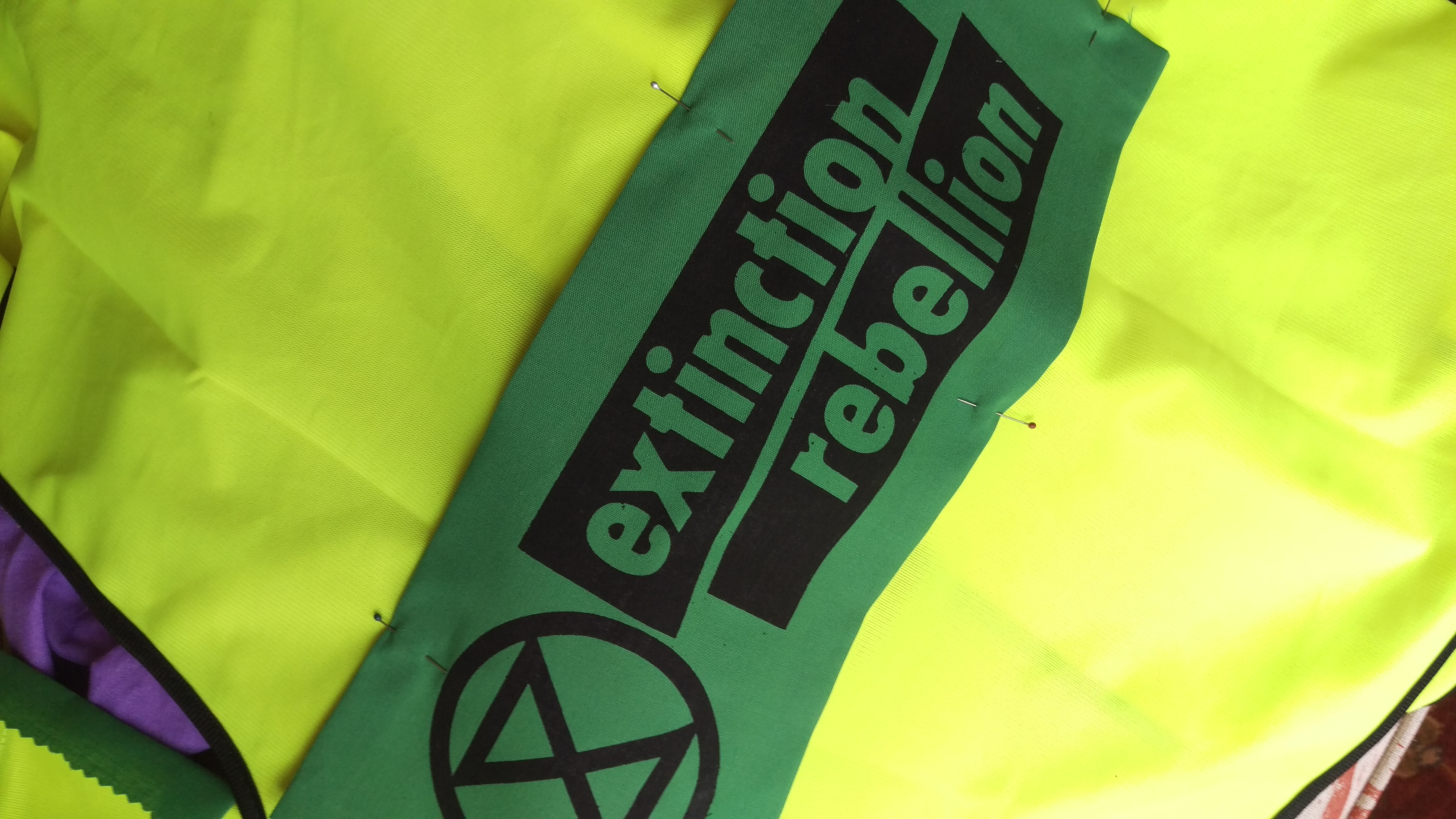As high vis vests continue to trickle in, (for marshals to use in keeping people safe on the streets or when doing banner drops) and patches emerge from the screen printing (and stitching) rebel, I’ve been stitching them on to keep our collection growing.