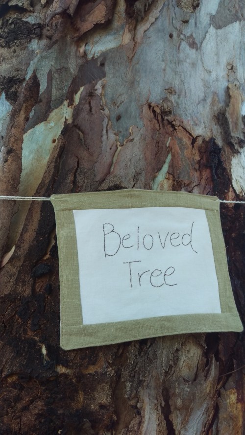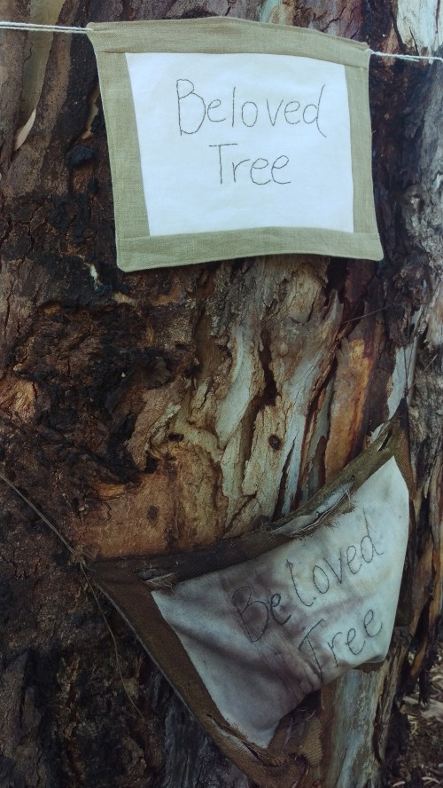 This tree has had several beloved tree banners in the last few years. This one is well and truly eucalypt dyed at this stage, and the fact that it is made of biodegradable fabrics is showing too.