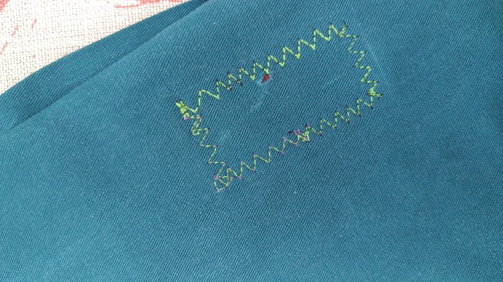 This gardening shirt you are looking at here is years old and has spent years in the rag bag. My beloved found the rag bag (not the main one–this one must have moved houses!) and pulled out one of hers and one of mine, and insisted I mend hers (done) and that this one was too good to throw out. Well, the cuffs look like they encountered acid. Lots of holes in them. A hole in the front pocket. Another beside the button band… and on and on. Maybe my one long ago encounter with paint stripper hit this shirt? Or did I wear it blackberrying? Or did it come to me like this (from the thrift shop)? It has paint from that time I painted the pink ceiling white finally. It has mismatched buttons. It has been stitched (both constructed and mended) in several colours already. When to stop?