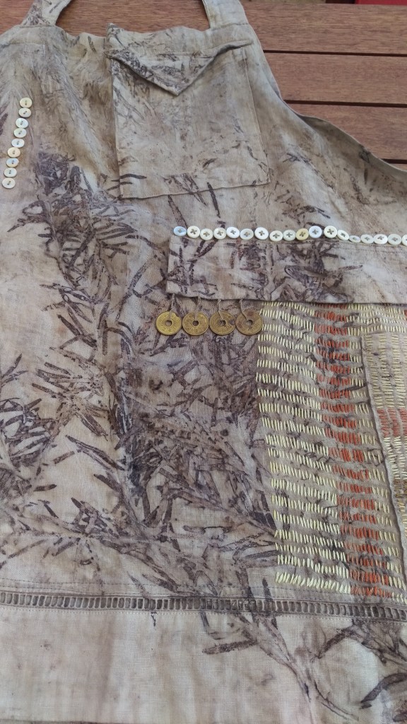 Here is the whole thing. On its early outings I realised it was really loose, and bagged out at the back. In the end, I added a second button and button hole so that I can have it close enough to my body to be comfortable and to do its work. It also means that those beads don’t drag the whole apron down on one side like they did. They may yet be removed! And the coins make it tinkle. Which I am surprised to find I rather enjoy. Fabulous. Thank you, India!