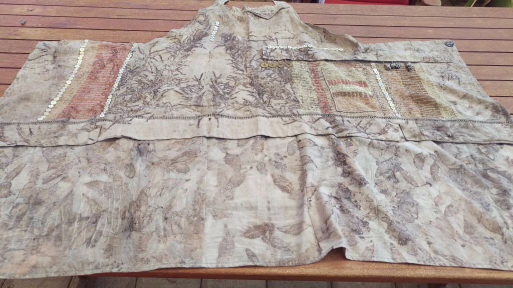 In the end, I added and then removed buttons, decided the skirt was too short and added panels of cotton calico dyed with some dried leaves, and adjusted the neckline a couple of times until I liked it.