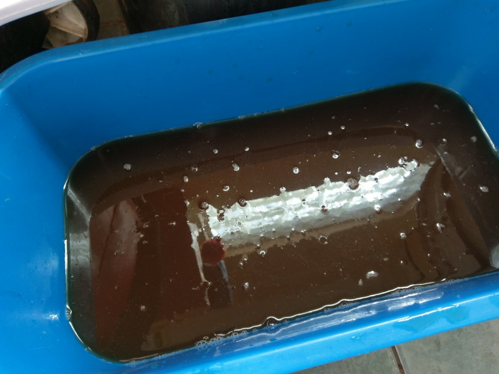 The water after a cold overnight soak. As you can see, this step really takes a load off the hot washes.