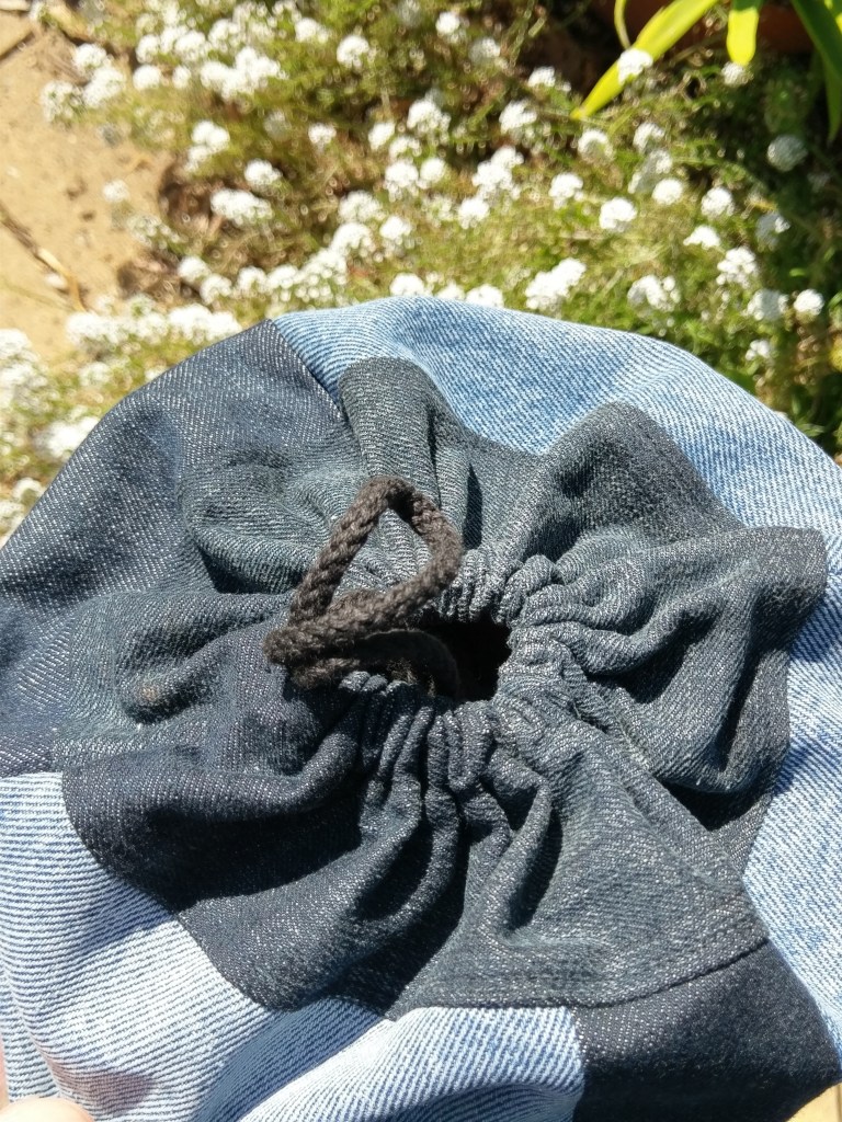 I started with a pattern from Instructables and decided I wanted a drawstring at one end rather than stuffing the thing and closing it up for good. I made some modifications and started cutting up jeans and patchworking them together. As usual, I was finished before I thought too hard about the design of the patchwork. Next time!