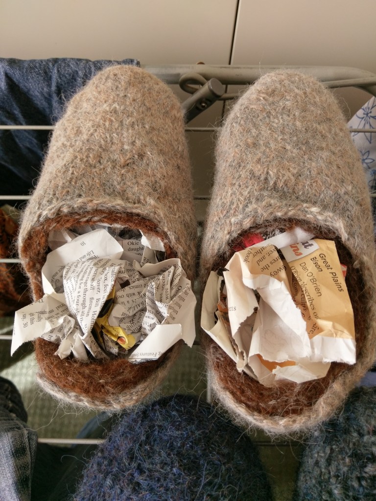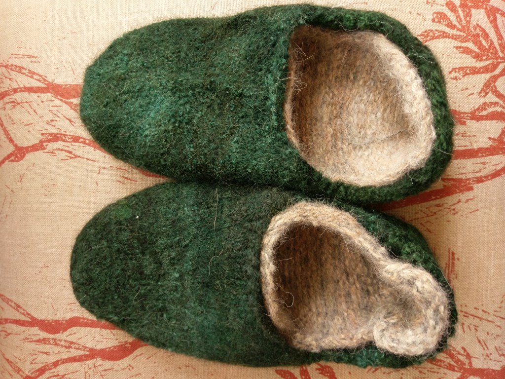 And there the path ends. I decided to get on and dye and felt these because there are just so many unfinished projects in this house right now it’s becoming an issue for me! And then I waited for them to dry and… one pair went in the post to a friend who feels the cold extremely, together with a random pair of socks that were in the back of a cupboard awaiting darning. Darned up and ready to go, she will receive them and the slippers with glee (I’ve checked). Another pair of slippers have gone to a friend who mentioned she’d always wanted a pair of my slippers–by mail, which could take a while right now. A third pair went to another darling in my life who has already sent a picture of his feet up, looking very green and very snug! He was going to the Farmer’s Markets, so he took the logwood pair and the coloured fleece pair to gift on to friends who are organic farmers. And now I have just one pair left, and I have a thought about them too… but no more pictures!! Now you see them, now you don’t!