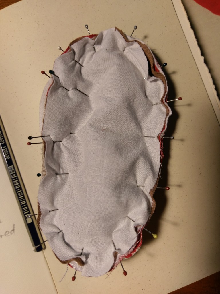 The pattern calls for iron on interfacing. Well, some parts of the upcycled frock already had this feature, so I left it intact and turned it to advantage. For the rest, the scrap stack (offcuts so small they are filed in a pile–too small to fold up!) provided sections of sheet most of which had been turned into hankies and napkins, and tiny offcuts of a linen shirt that has met its next incarnation. The soles? From a dead pair of tracksuit pants, and some offcuts of fabric recently passed on from a friend, from her Mum’s stash. And as for fusible batting? The tracksuit pants provide again!