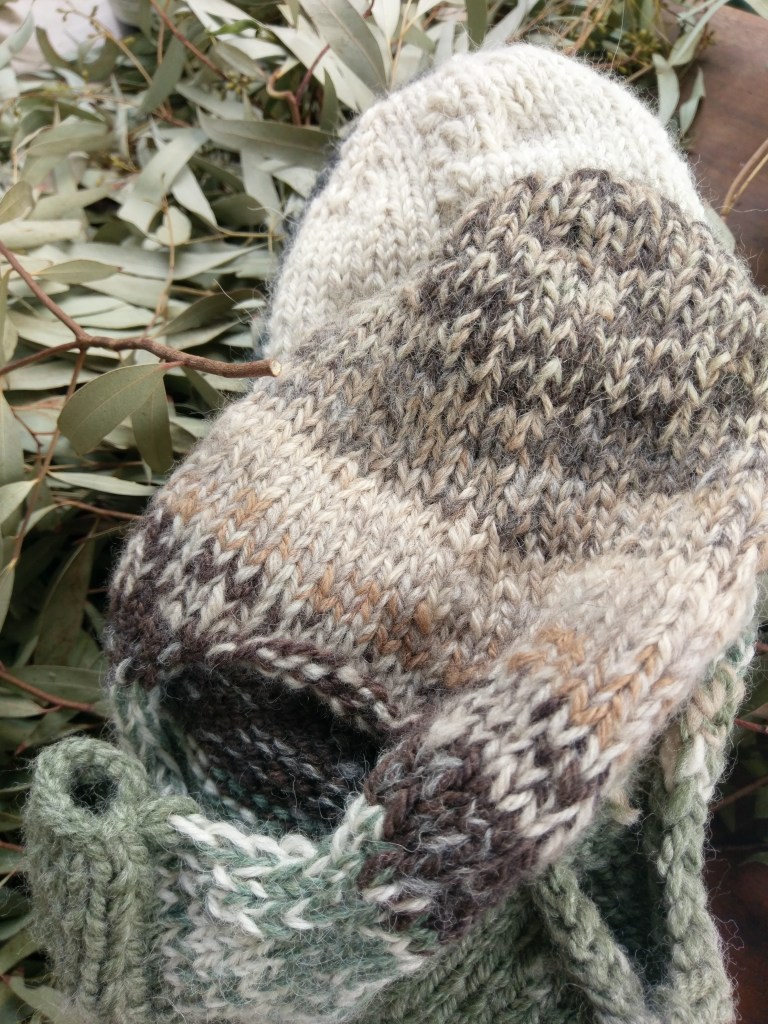 So many wools here–handspun alpaca, legacy naturally coloured handspun and millspun left by a friend’s mother when she died. Handspun that had been in a logwood exhaust bath or three. Grey handspun that had been through an indigo vat. All kinds of bits and pieces of handspun in all kinds of blue to purple colours. Leftovers from that vest my mother-out-law made from 4 ply alpaca. Actually there were some more that were vibrant green, from m*th damaged wool that a friend gave me.