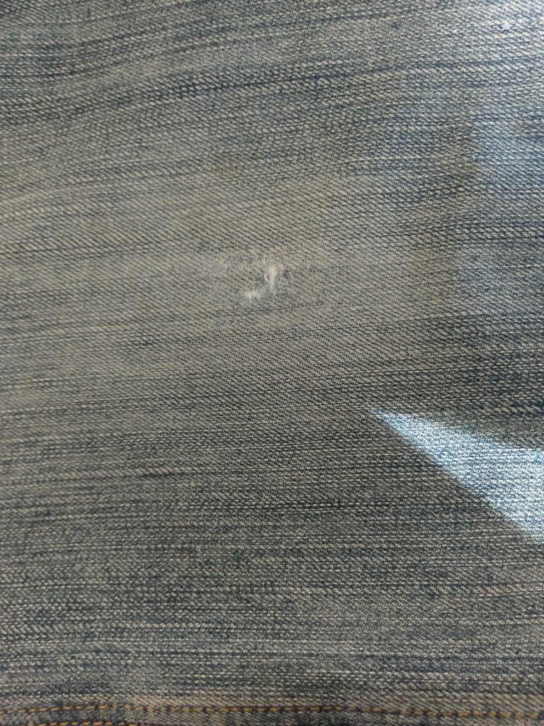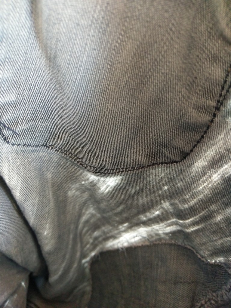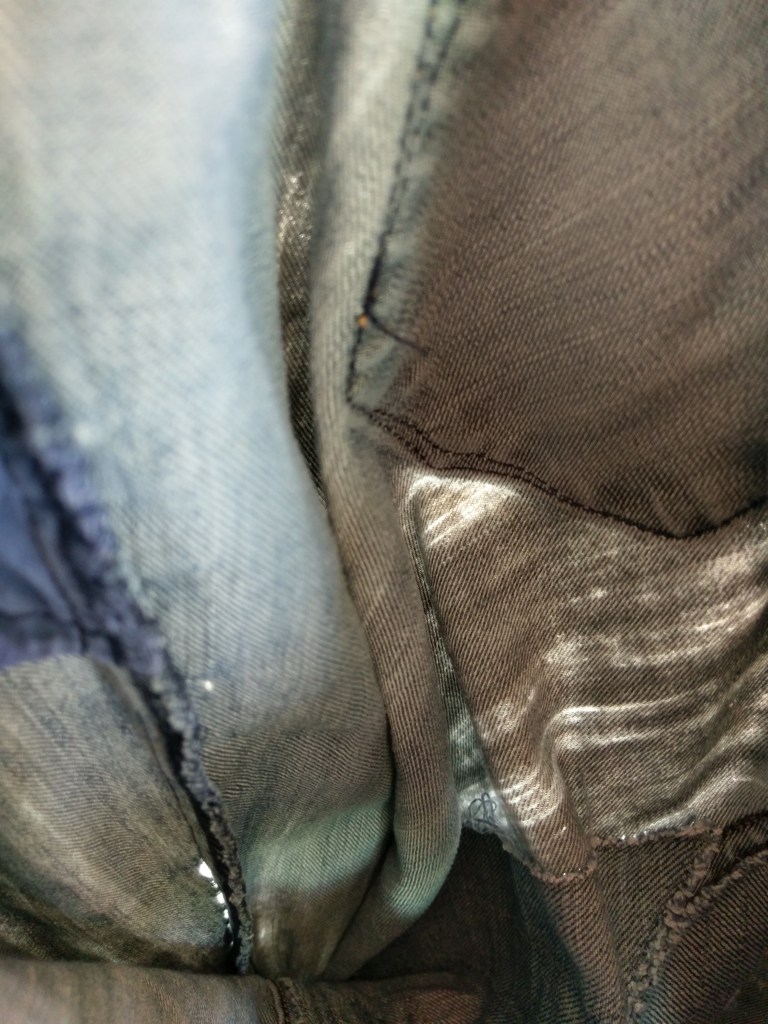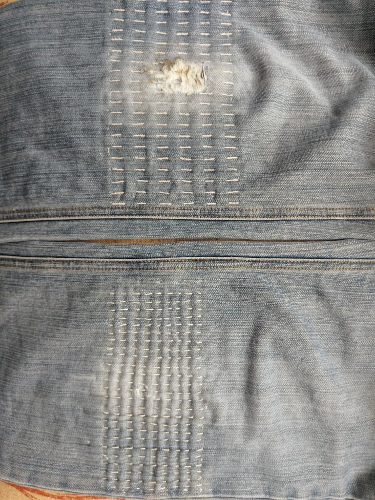 For those wondering how the patches on the inside are wearing–here’s the inside. The madder dyed thread has been through many washes, some focused more on getting out the grime than protecting plant dyes.