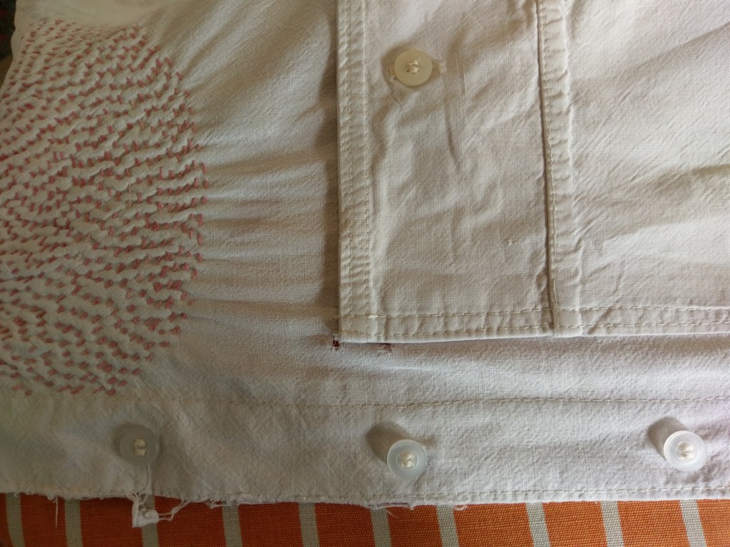 Under that indigo dyed thread is a small patch taken from the scrap pile to reinforce the pocket corner. The time for this shirt has not come yet!