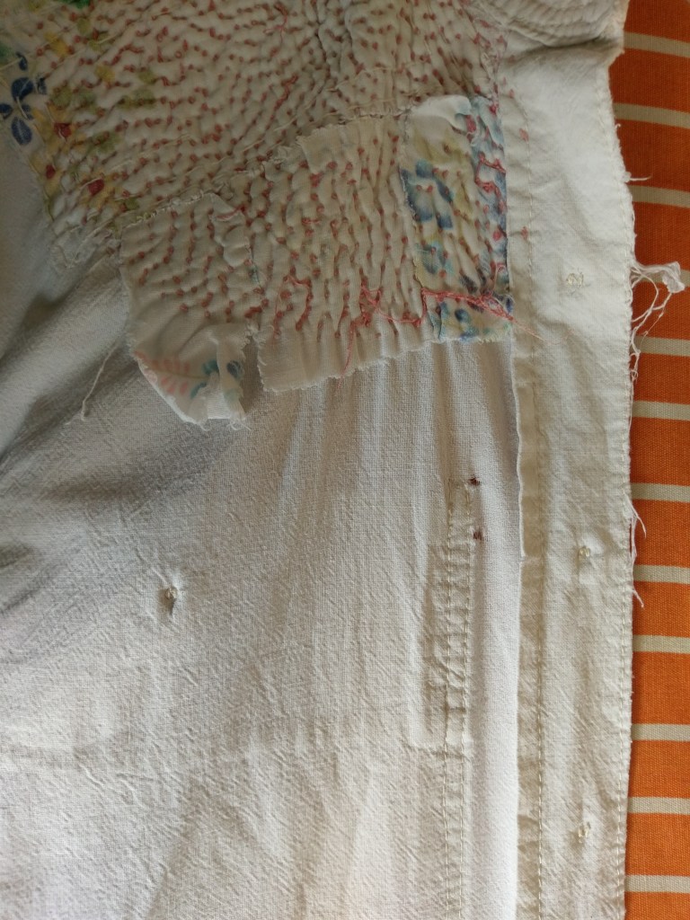 This much mended shirt began as flour bags from the Fremantle Roller Mills, with a big red dingo as well as the name of the mill and the weight of the bag. That was a long time ago! The front edge had worn down to fraying and the corner of the pocket had become a hole. So I covered the worn edge with some handkerchief fabric complete with rolled edge hem–it was in the scrap pile so must not have made the final cut for a hanky!
