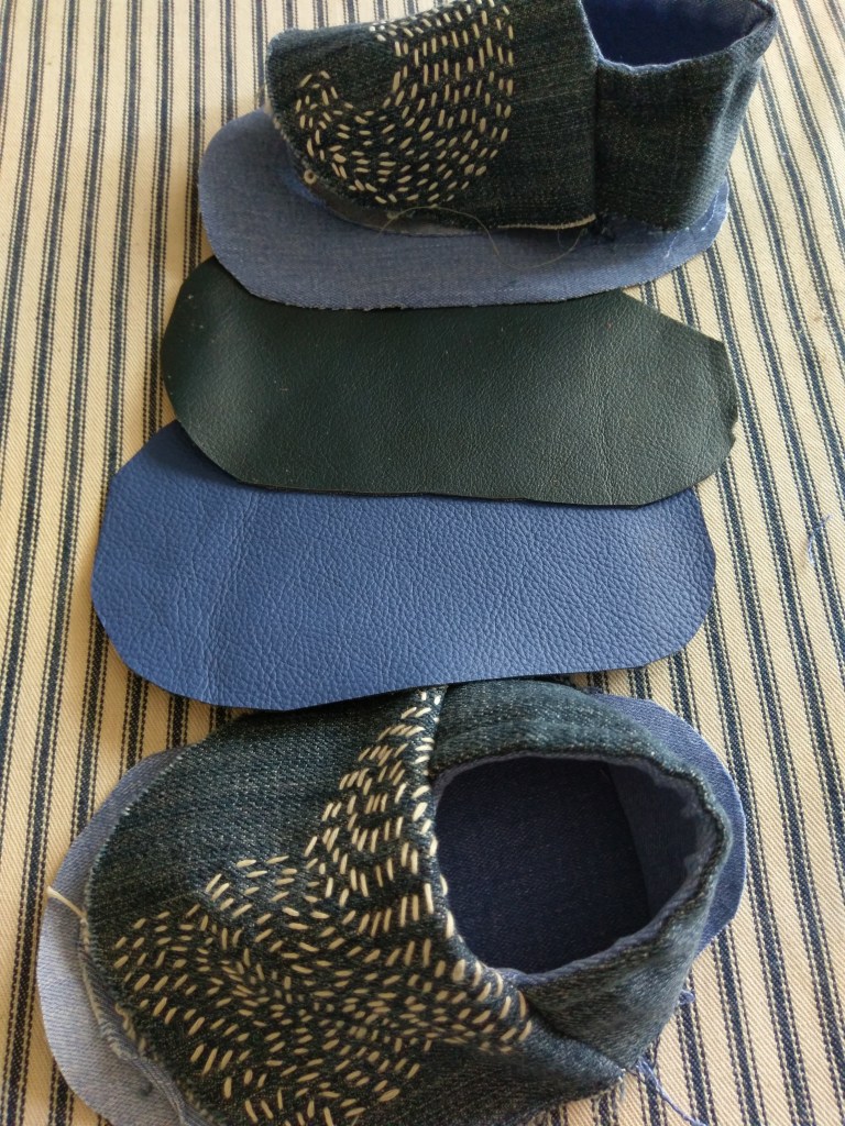 I did a little embroidery, and raided the stash of leather scraps and samples for two more different-coloured soles!