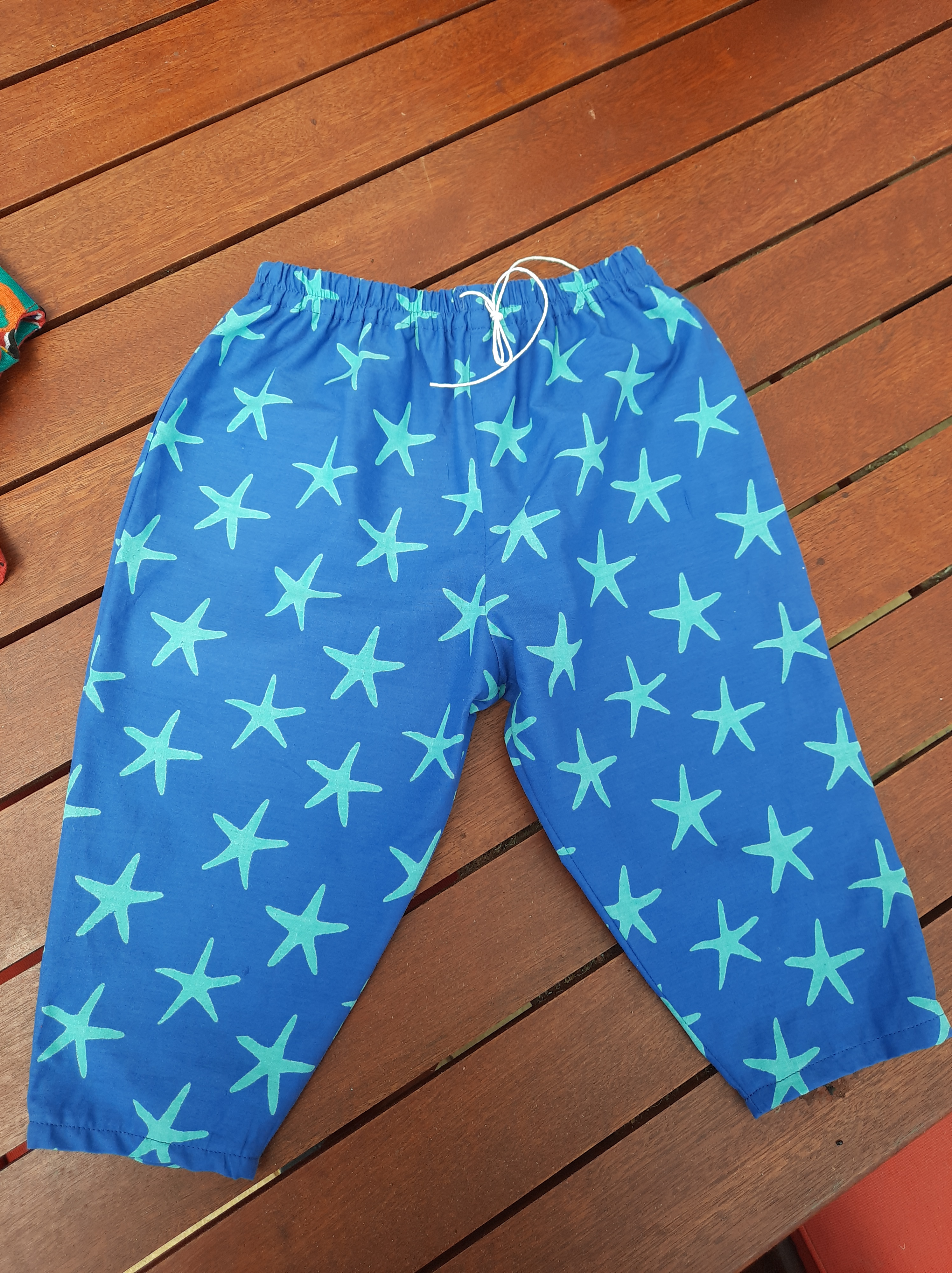 As the pants worked out well, I knocked out some more. The top two pairs are made from the edge of a high quality doona cover I was given by someone on Buy Nothing–we were talking about something else when she offered me fabric scraps for Boomerang Bags. I think she would approve of some of it going to this! But the two on top. Well. I do not need more fabric, and I was interested to see that I felt ungenerous making all the grandbub’s clothes from what I already have. None of it is especially cute. None calls out “small child”. So I, um, bought some more. Not rational. But there it is, I invested in some more fabric in small quantities because I want my daughter to know I think she is special and her child is special. Even though, if she does not know that already–it seems unlikely this purchase will solve the problem!
