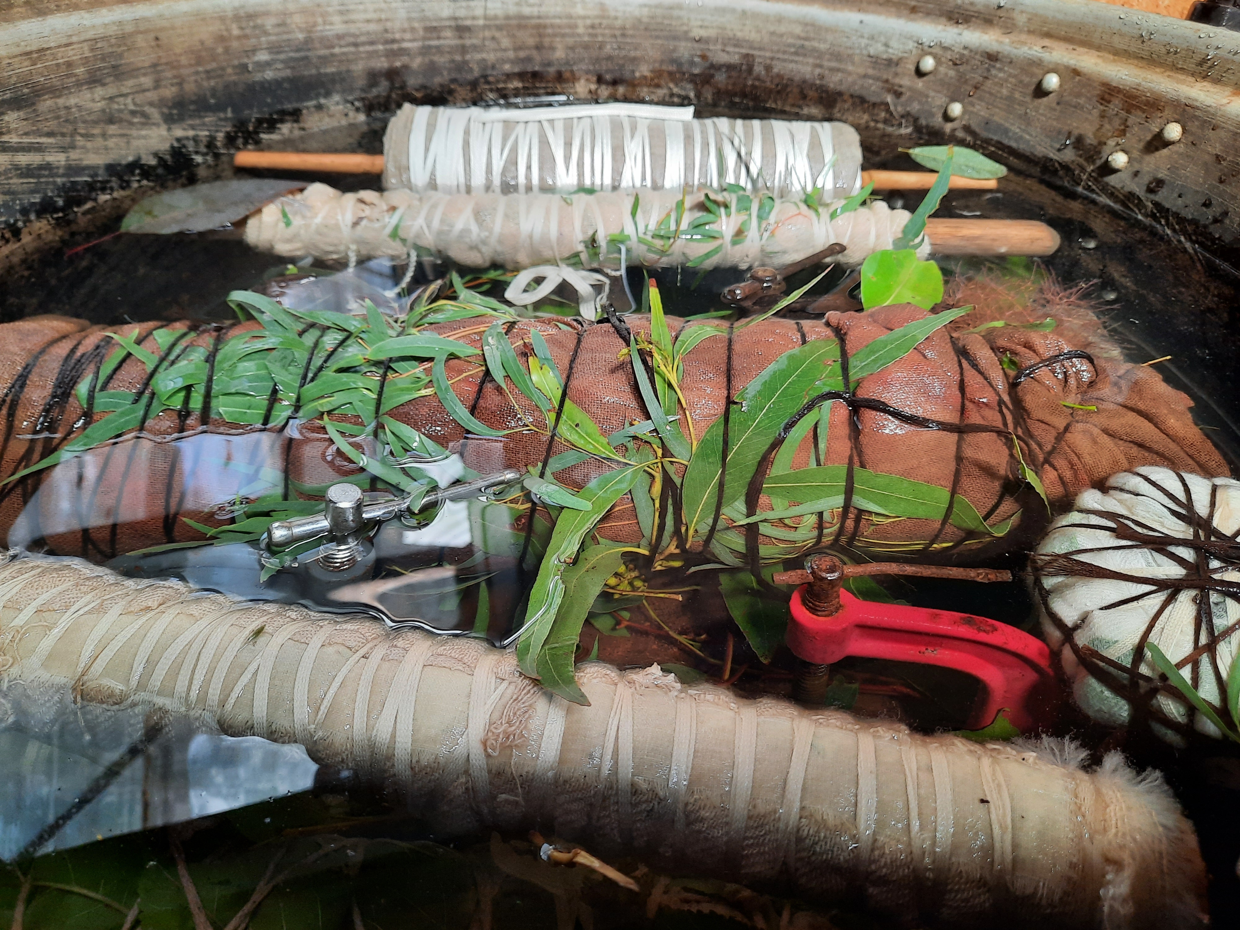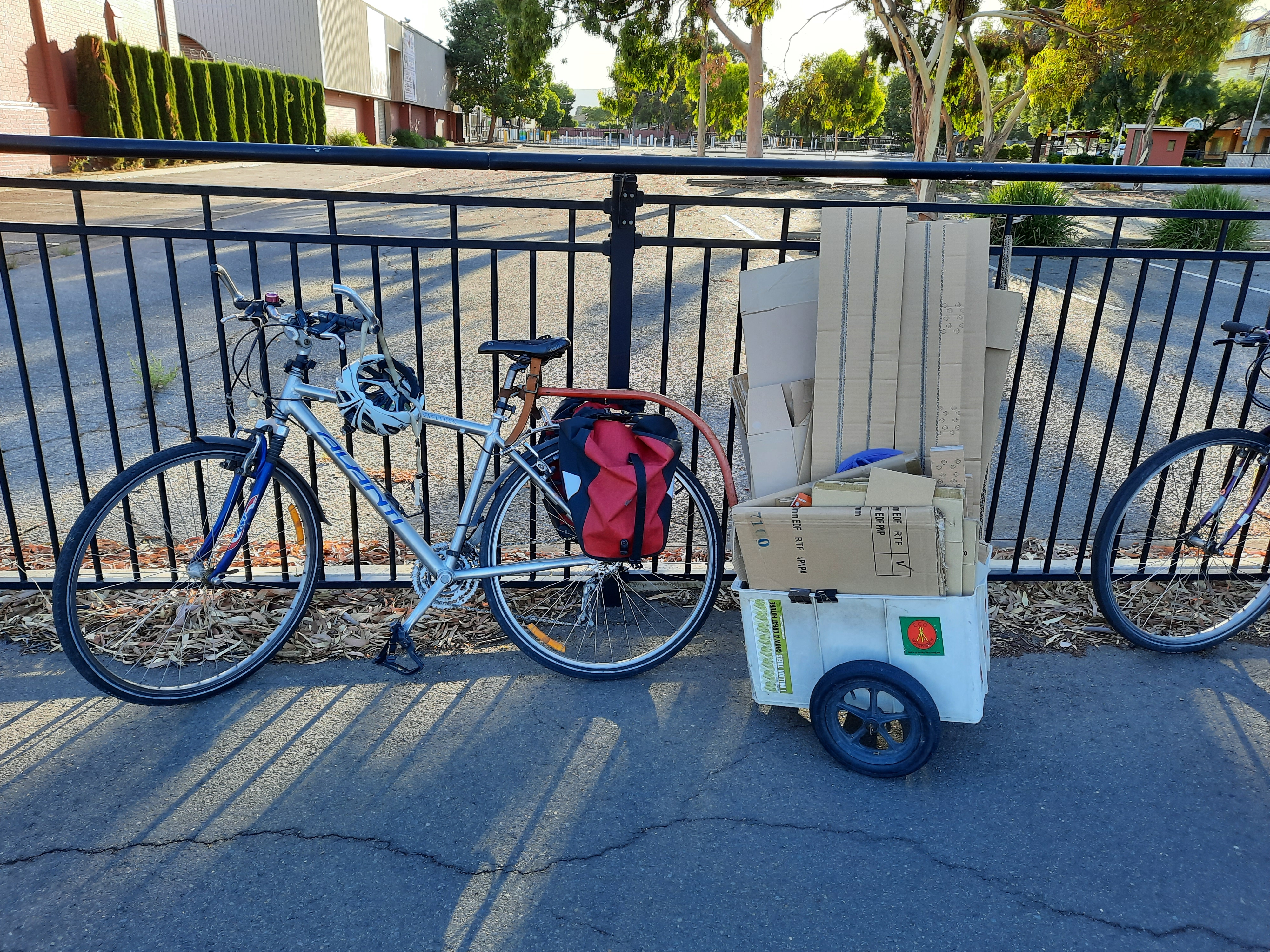 We began with my cardboard stash, and added onto what we have previously done (my friend has added some to our shared efforts without me!) on top of that, our first few sacks of leaves from the nearby car park where E Leucoxylon is in full bloom, and the late dry heat of summer and autumn has led to plenty of fallen leaves. Then we went to the local guitar shop, where they put all the boxes outside and are happy for folks to take them. We stripped out staples and tape again and added on. Then more leaves!