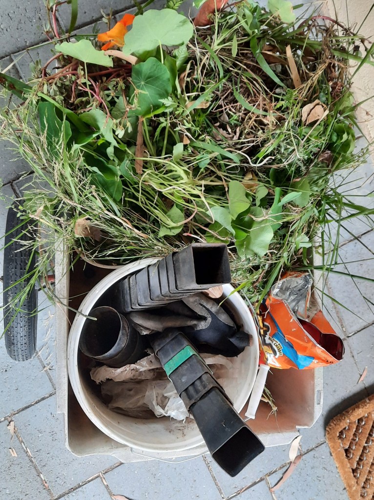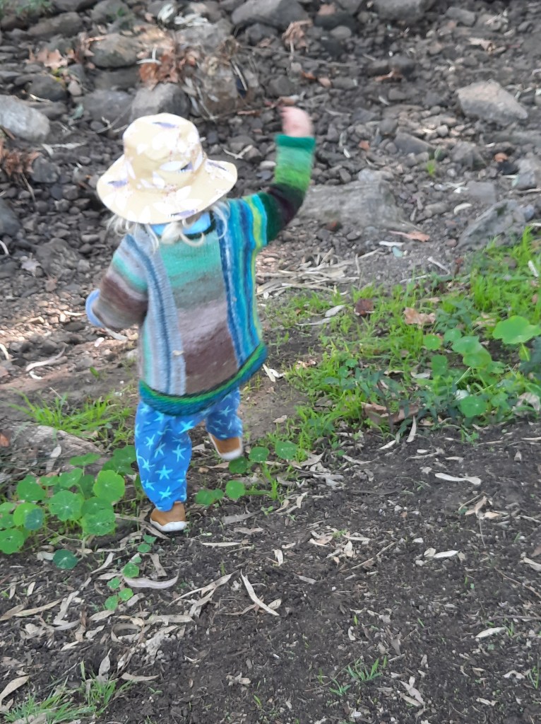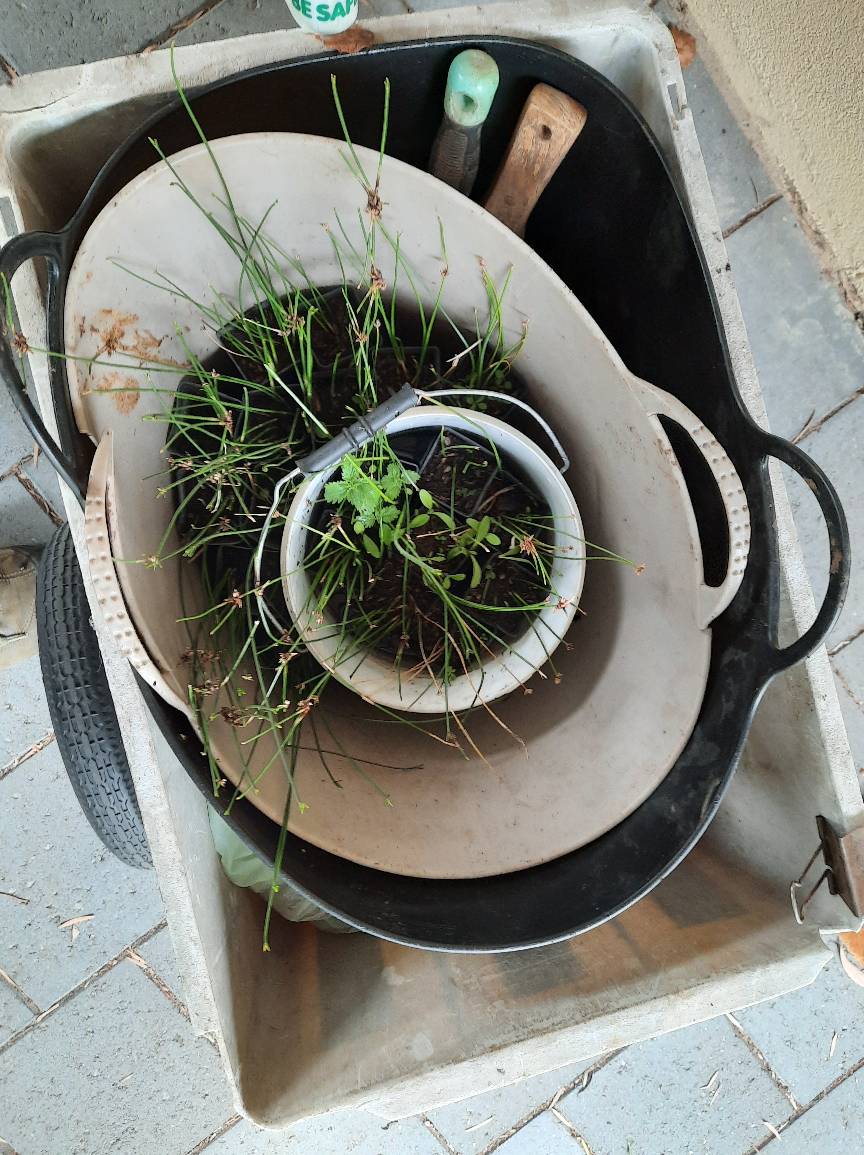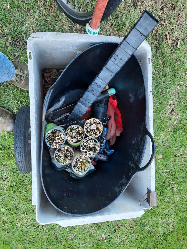 Anyway… we found bamboo and other plants suitable for the bee motel. My daughter and I pulled rubbish from the creek. And the grandbub and I planted the sedges with glee.