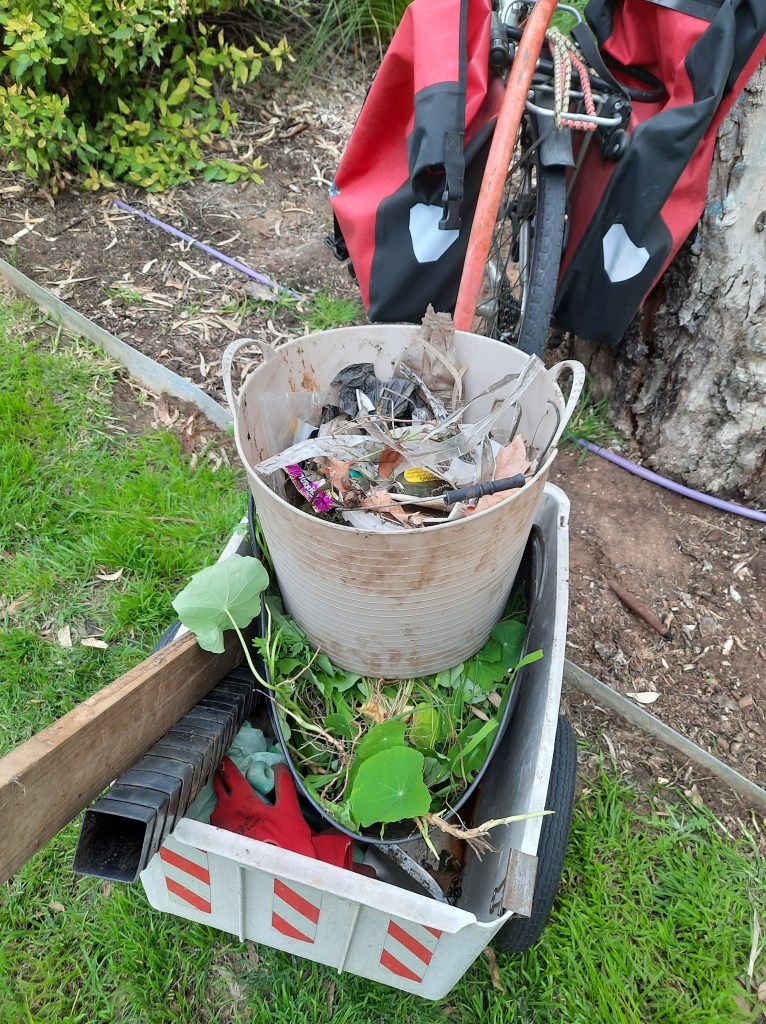 There has been quite a bit of sedge planting. These are going into the banks of the local creek, Willa Willa. Here, the day myself and a friend planted what you can see in my bike trailer, as well as the sedges my friend had propagated. We were joined by a local person who came across us guerilla gardening on his bike route, and stopped for a chat. He was keen to join us, so we got in touch and he came over to plant and weed.