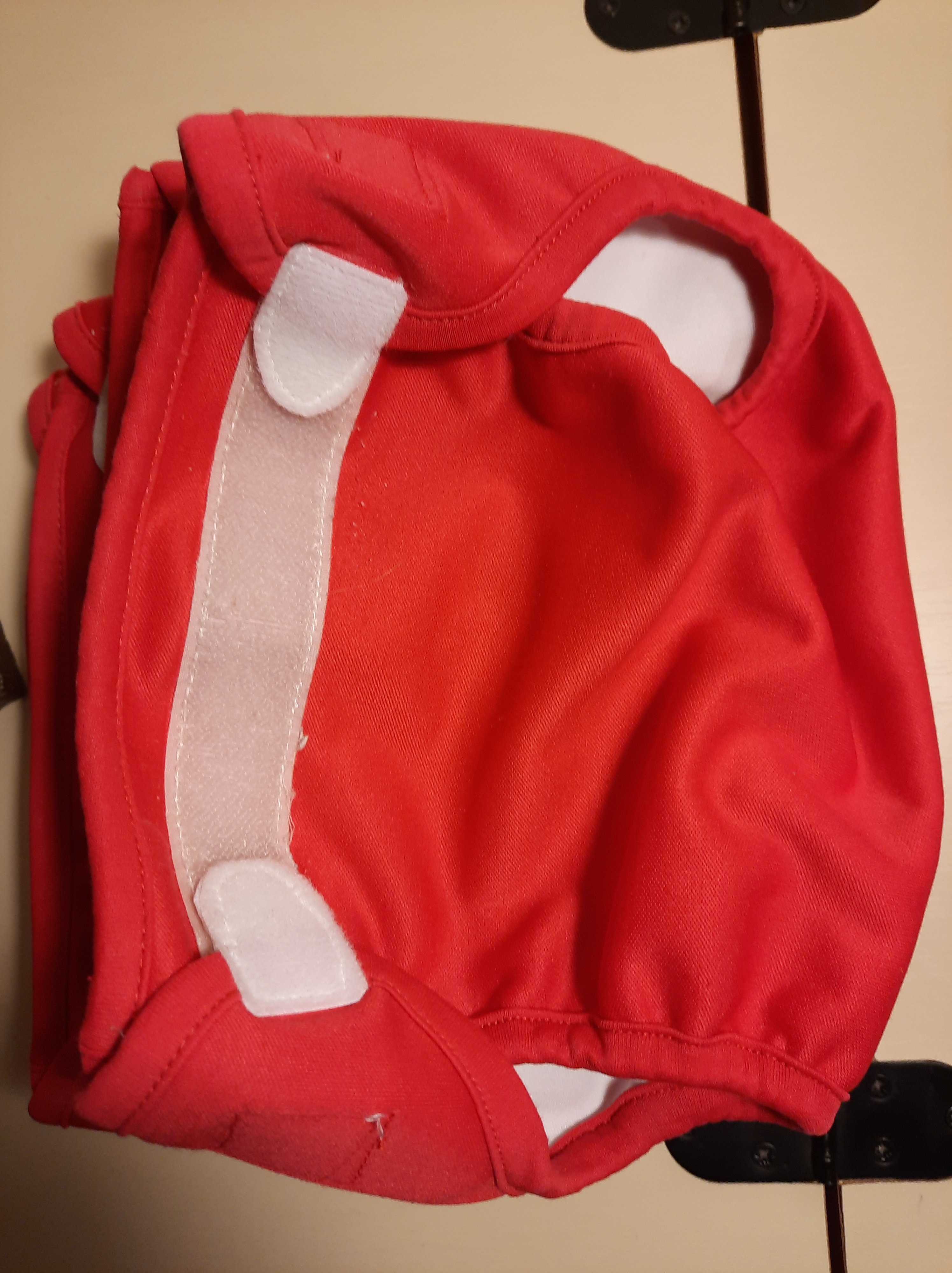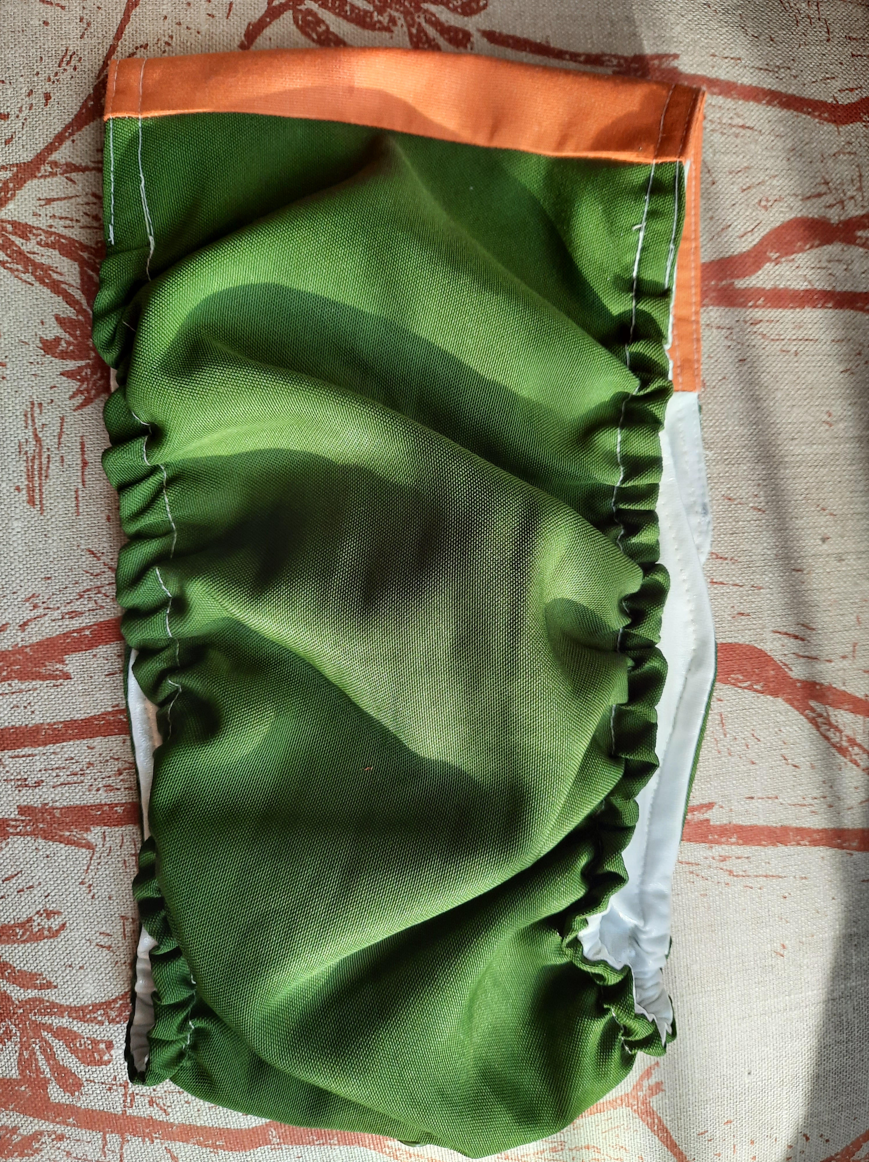 I also got some “commissions” (cue cackling laughter!) this one is a dog nappy, which arrived with the request I make it larger to fit the incontinent dog in question. Yes, the orange is the expansion!