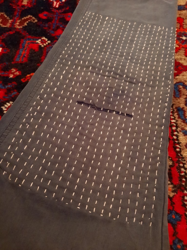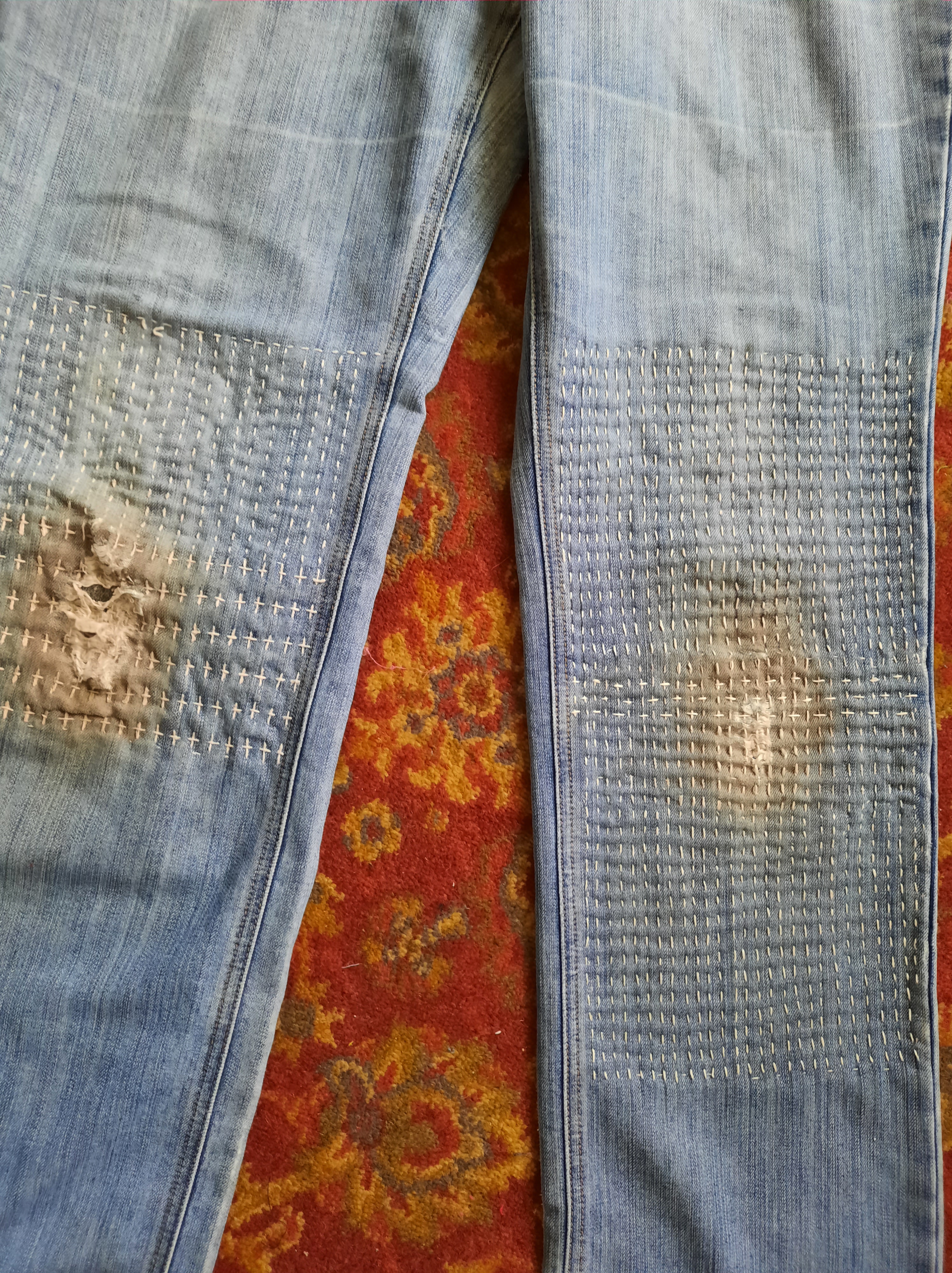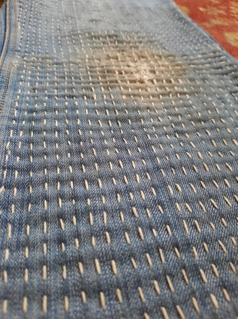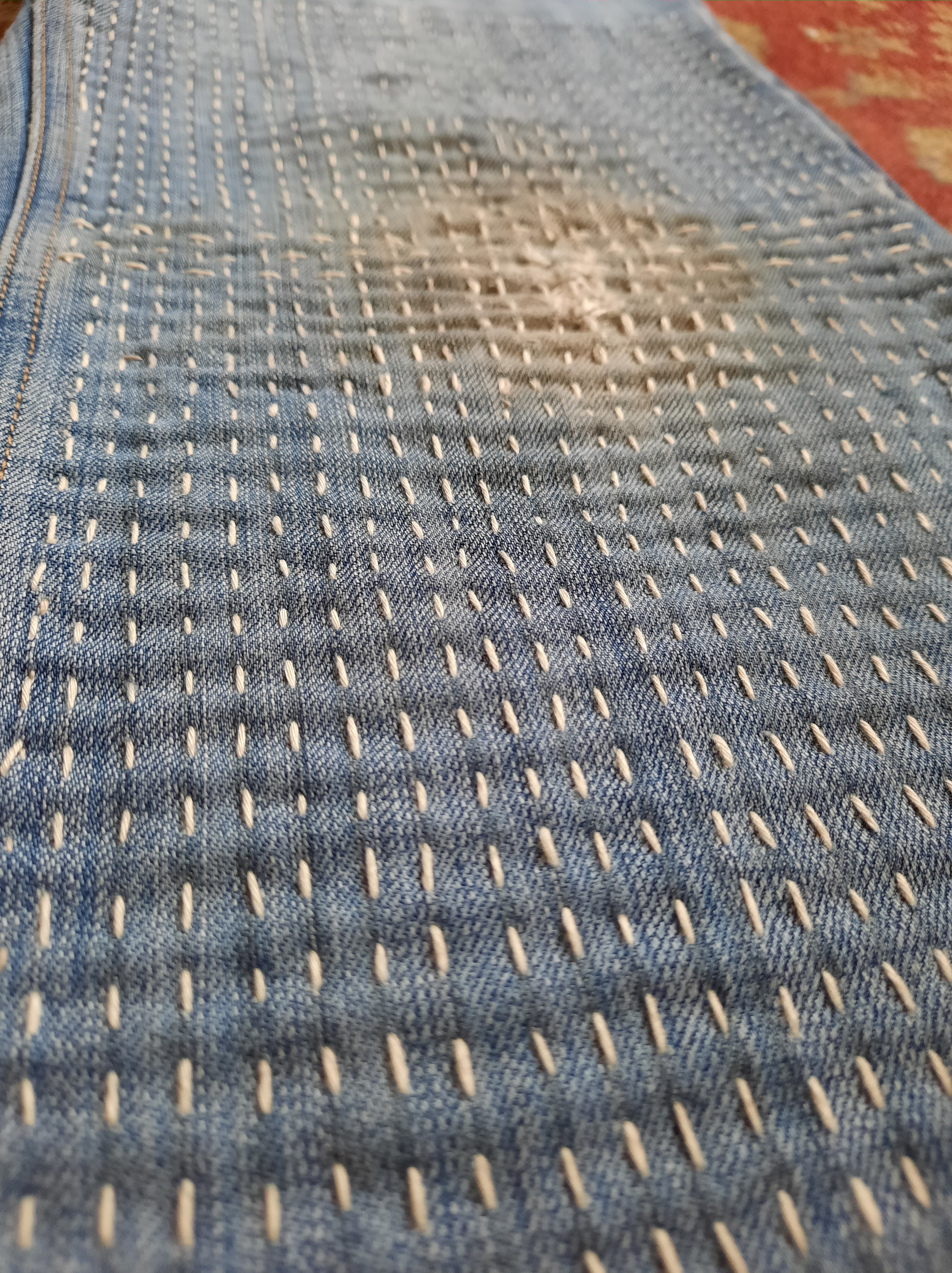 Image: The leg of a mended pair of jeans, on a beautiful coloured rug.
