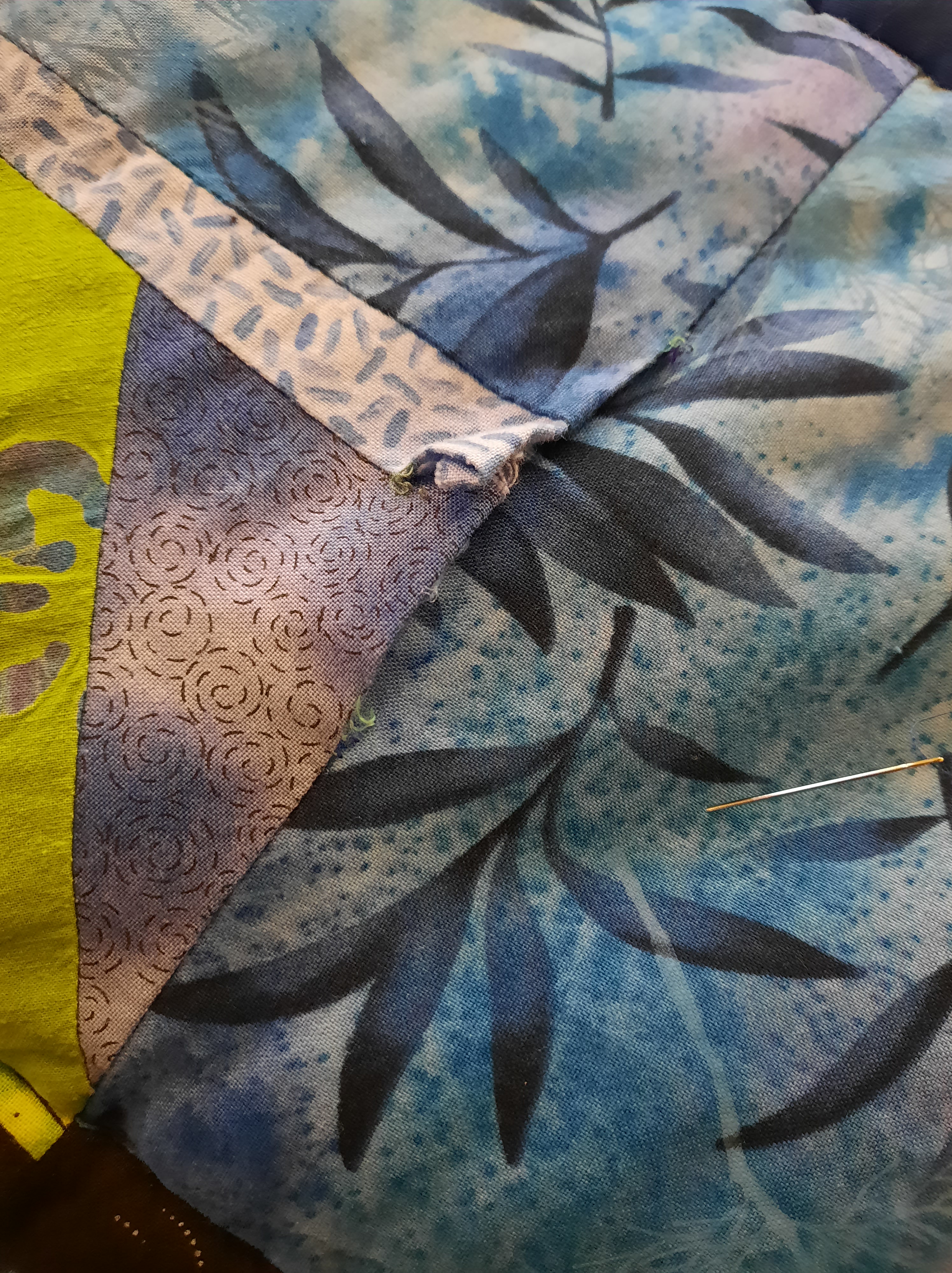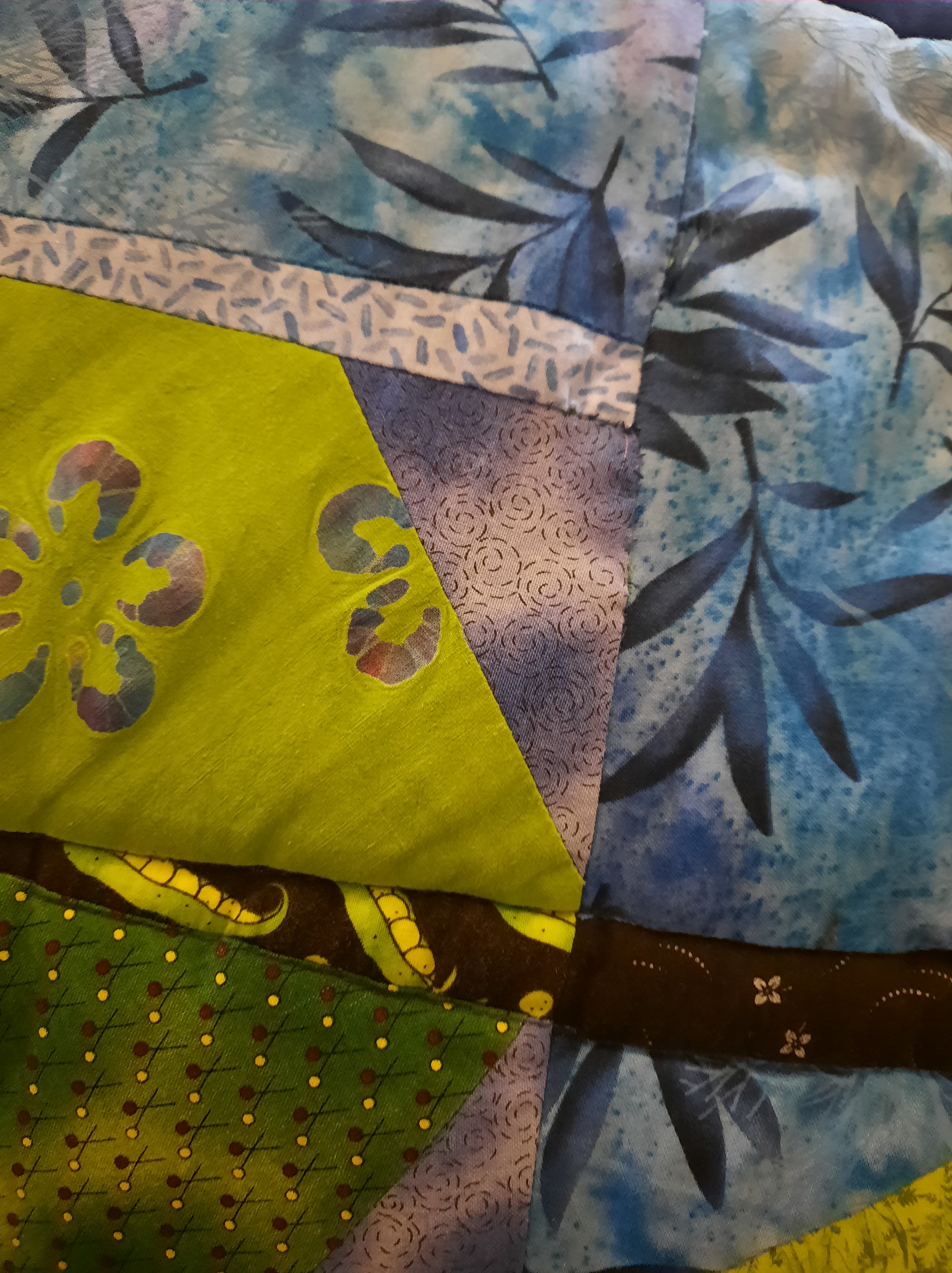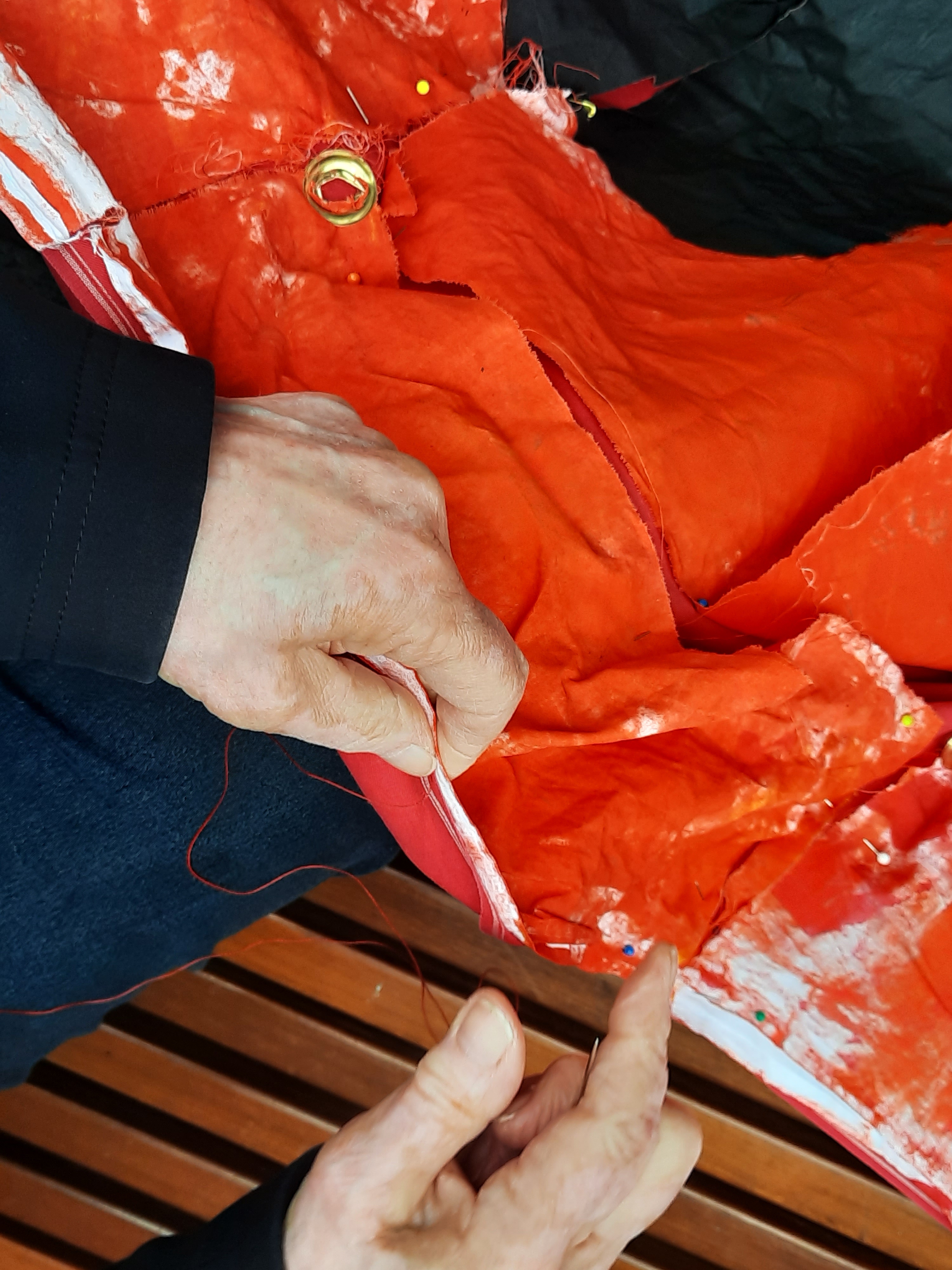 I added massive patches onto the back in (relatively) sympathetic colours (more fabric saved from landfill); pinned and then machine stitched them into place, and then machine stitched the casing at the bottom in place so that the chain that has been threaded through it to hold the banner down a bit in wind, will stay put. Just as well I warmed up on making a quilt recently! This banner is absolutely huge.