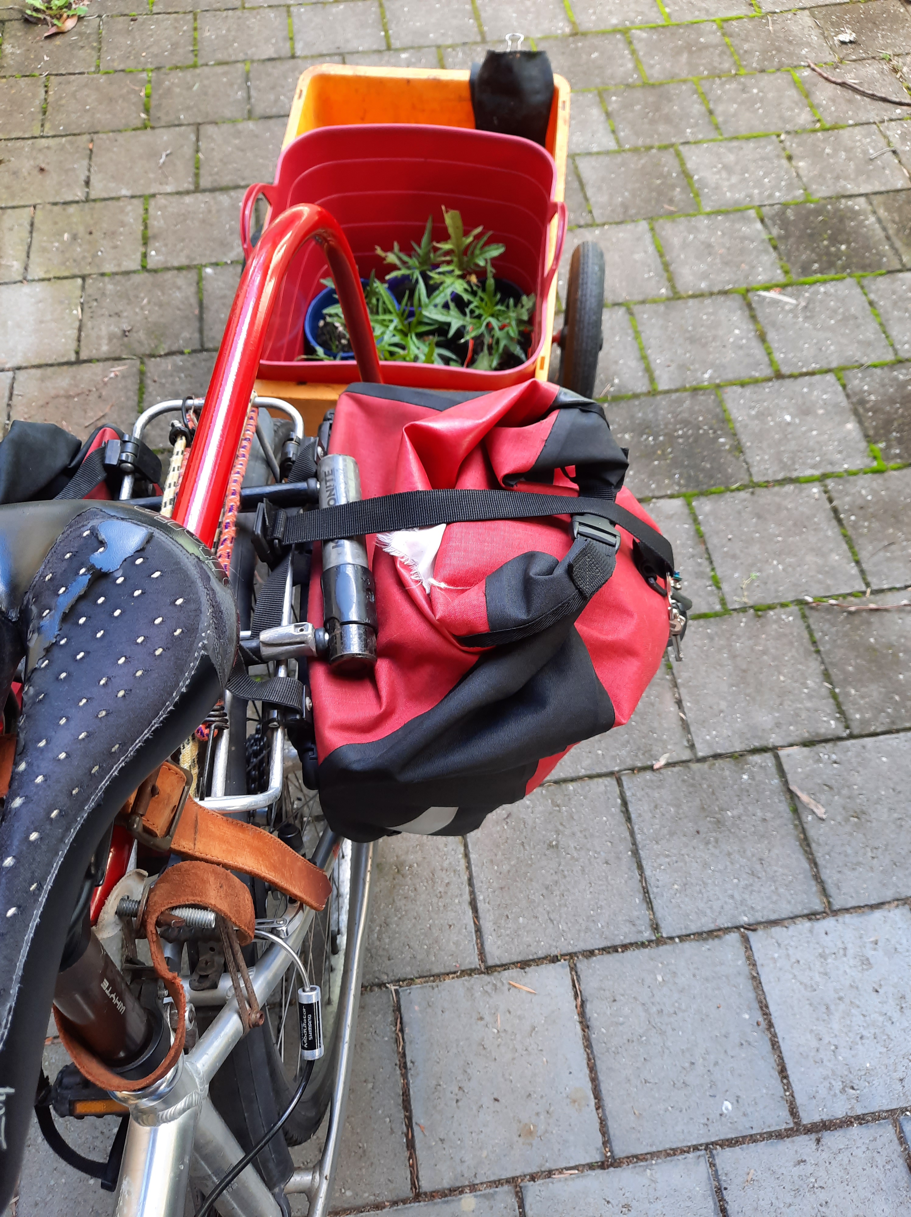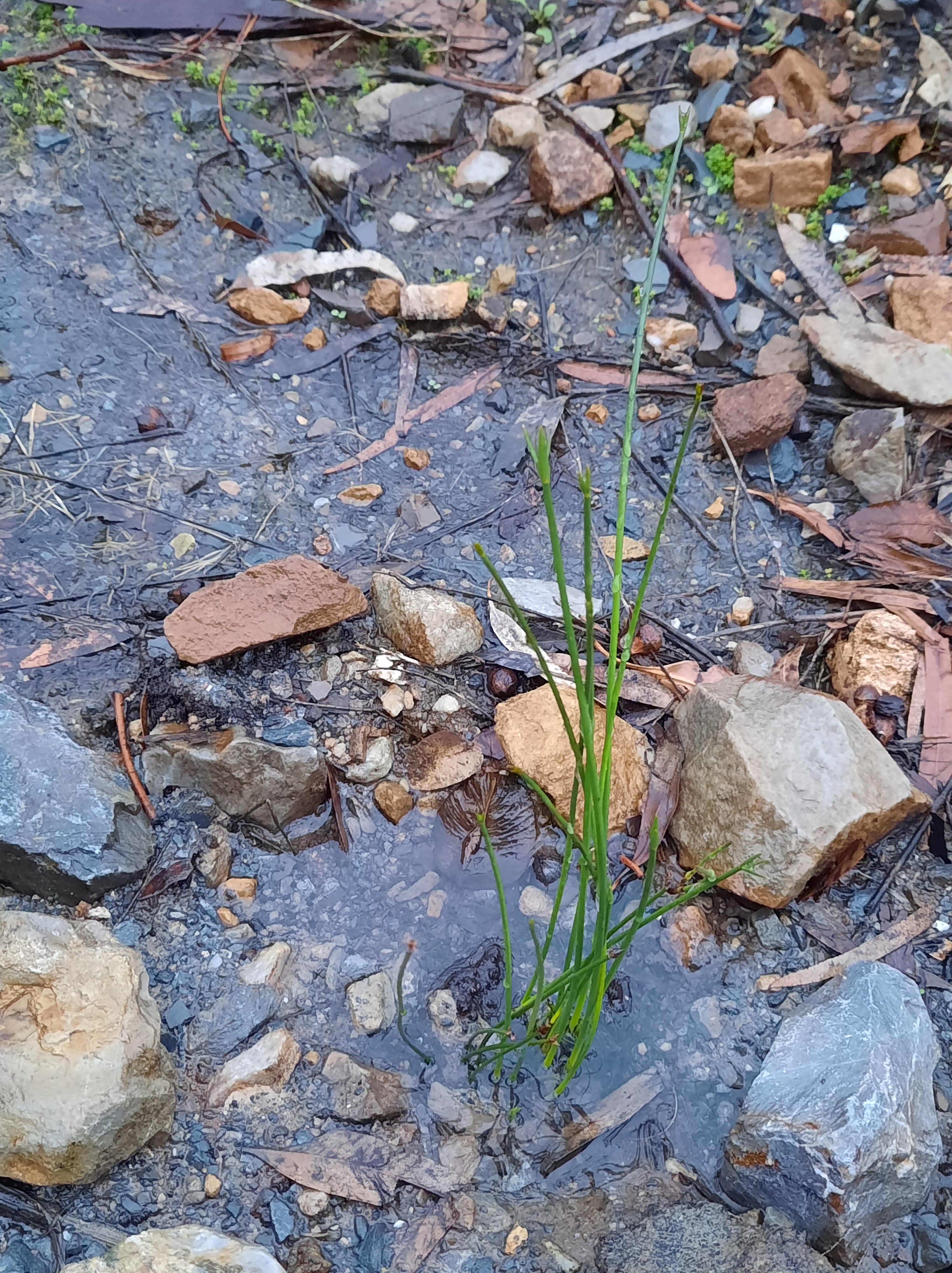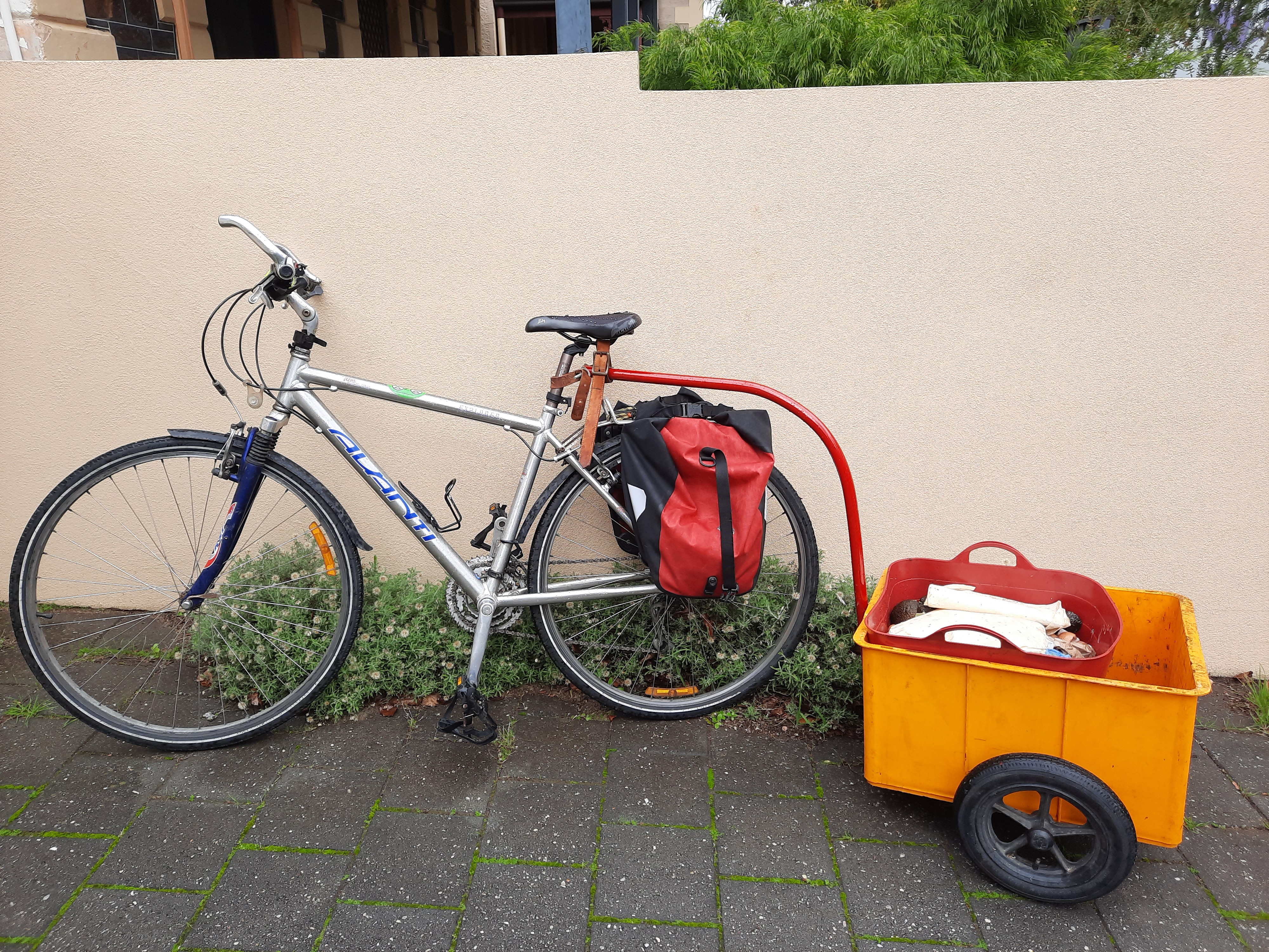 This is a short sedge planting mission (with a stop to collect glass jars from a Buy Nothing neighbour!) that is the jars in a pannier while I’m hauling sedges and mulch in the trailer… and rubbish back home again. There was a spot by the railway line that became a pool when the winter rains really came down. Eucalypt seedlings had wet feet too long and all but one died. I went and planted sedge there instead. So far it’s going well.