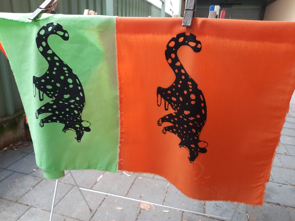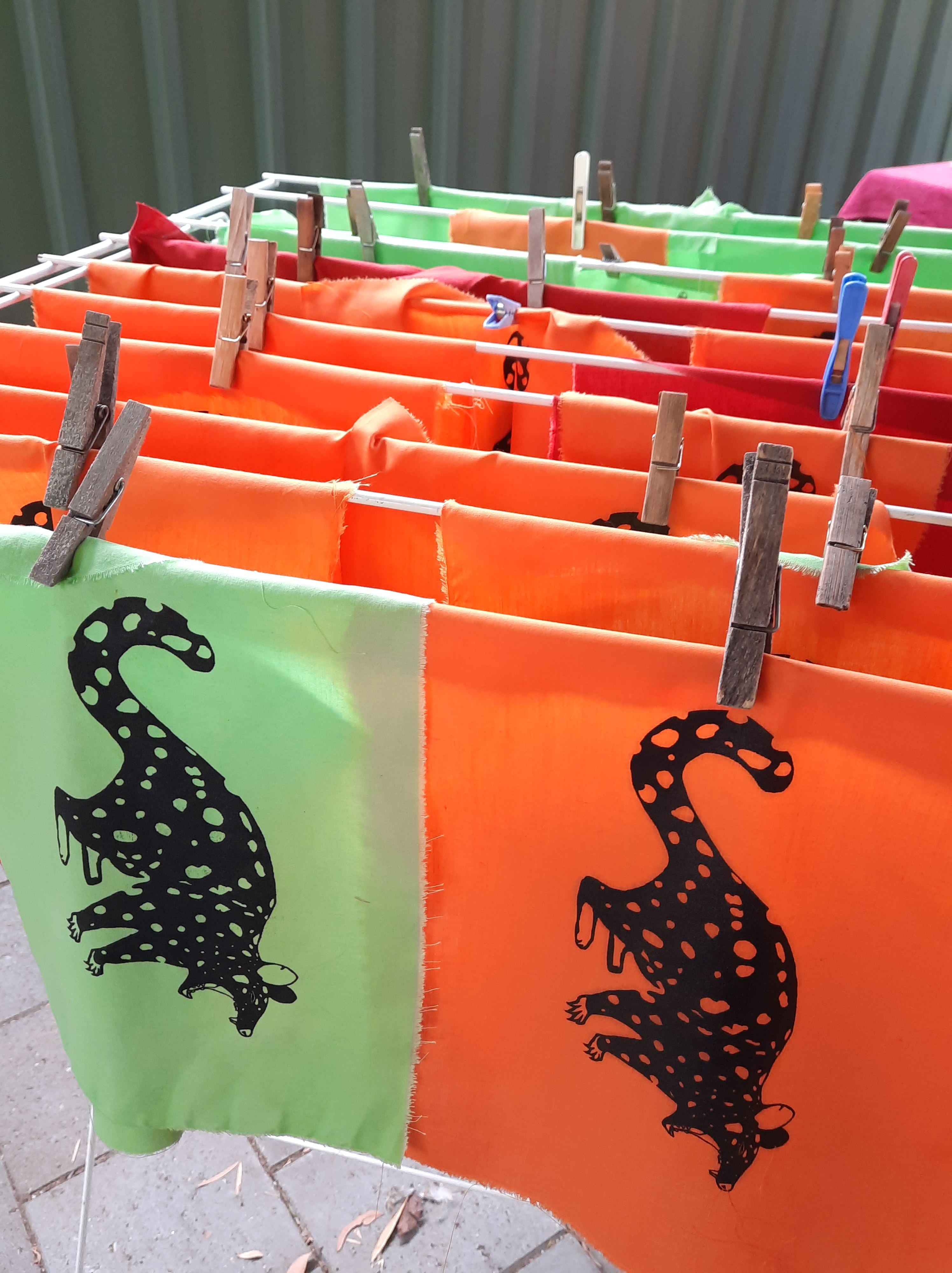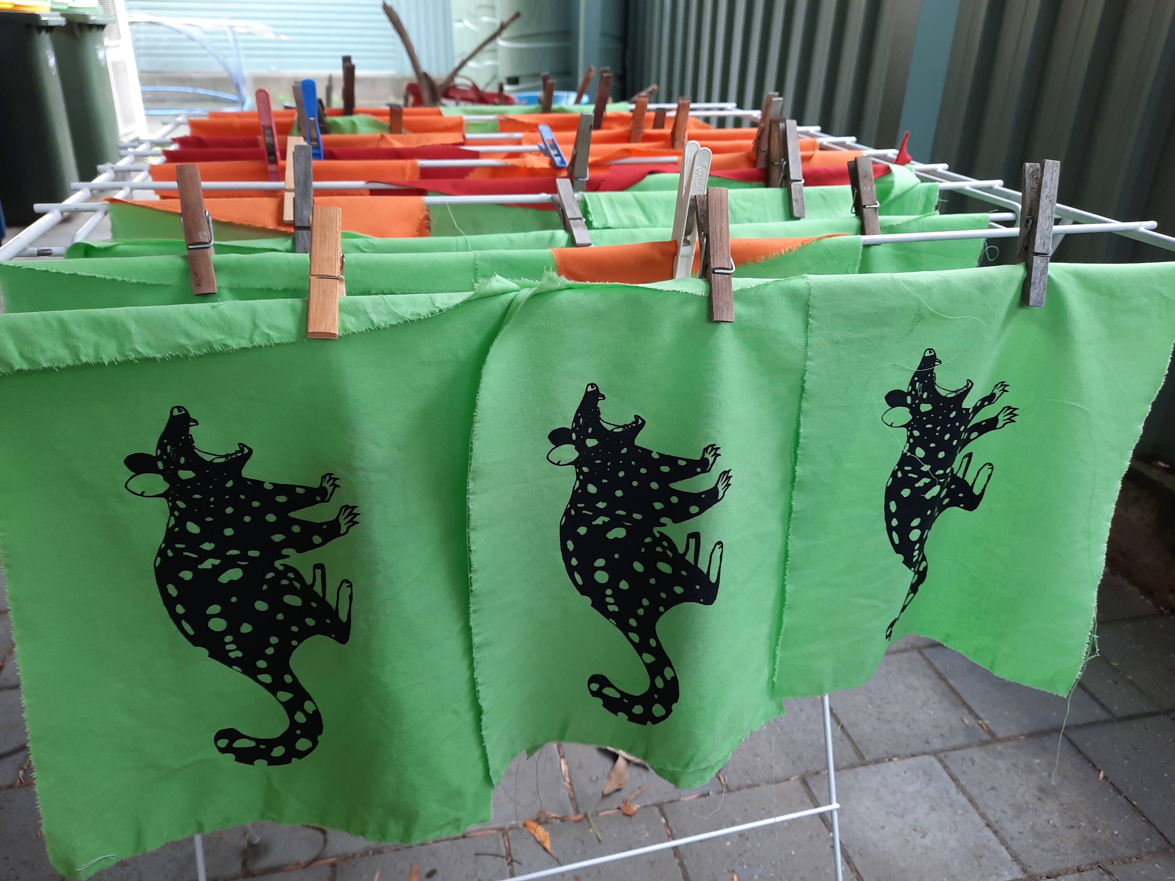I screenprinted some more patches. This time, the endangered spotted quoll. This is artwork that has been given to Extinction Rebellion by the artist.