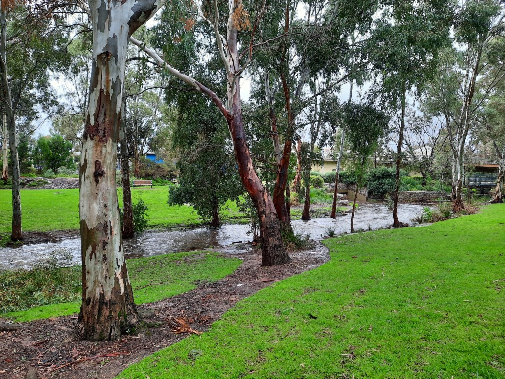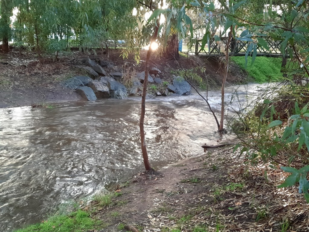 This is the local park where we have planted so many sedges in the creek bank, when the creek is really running and quite high. And the sedges are submerged, holding the creek bank, we hope!