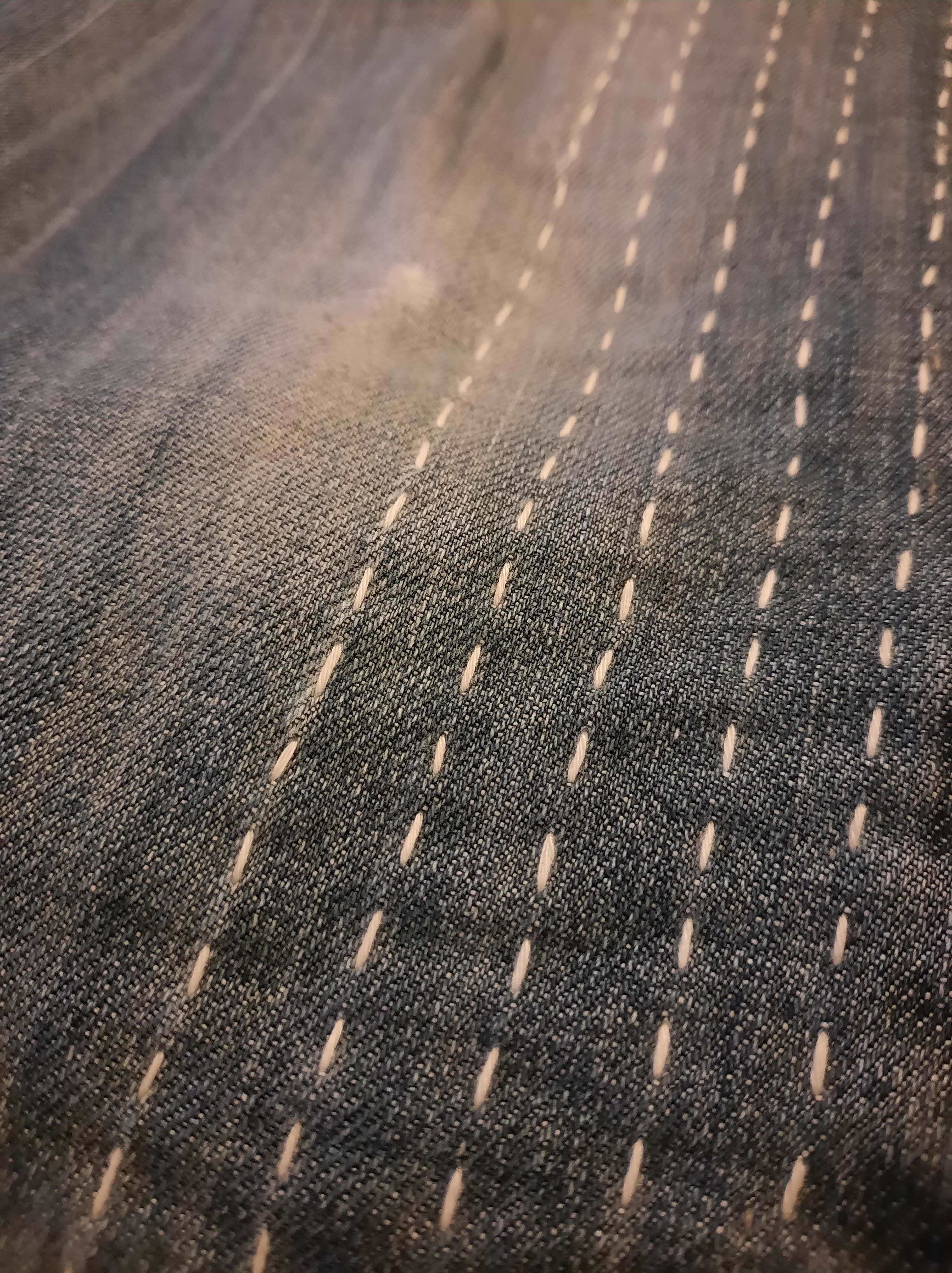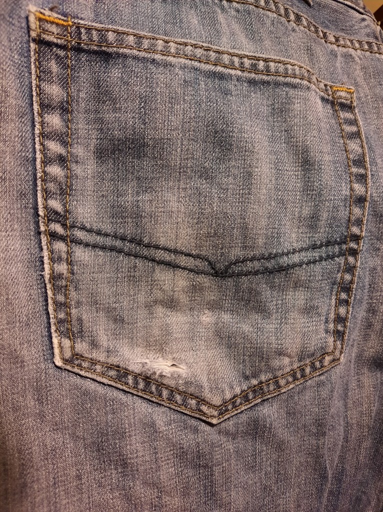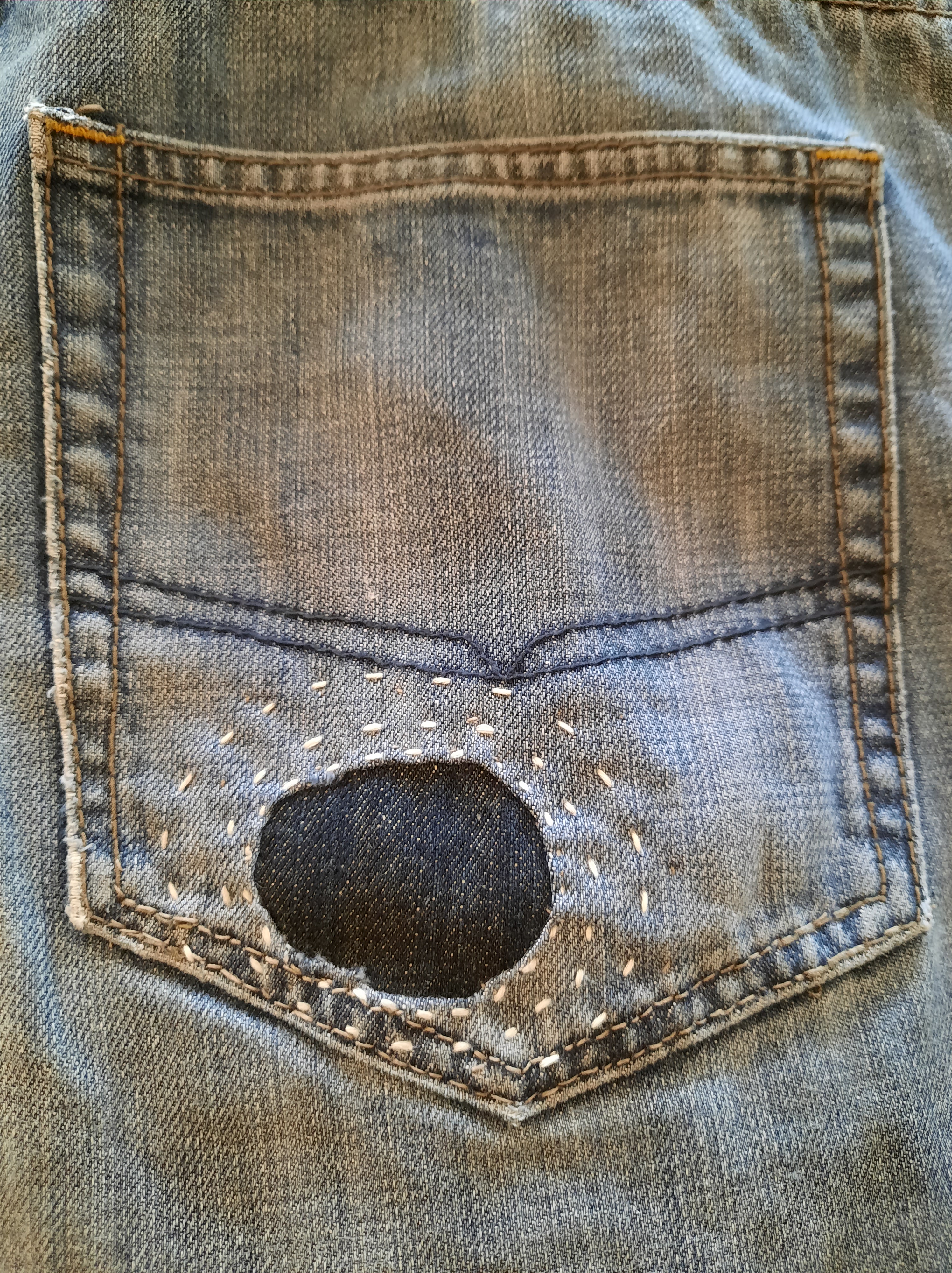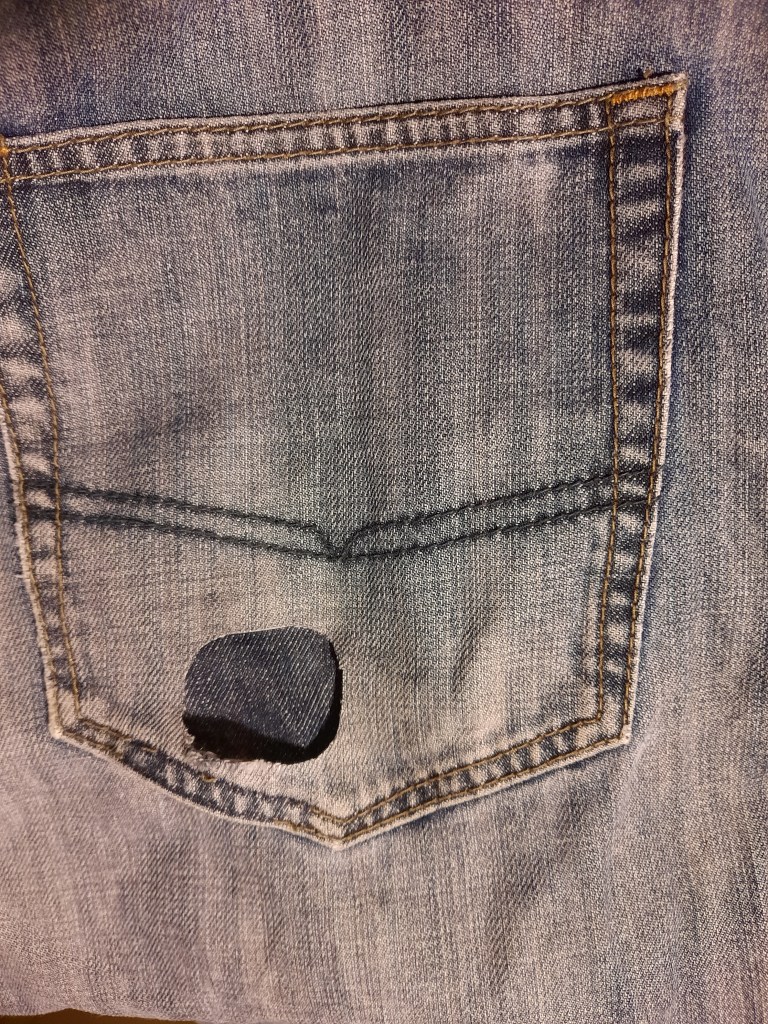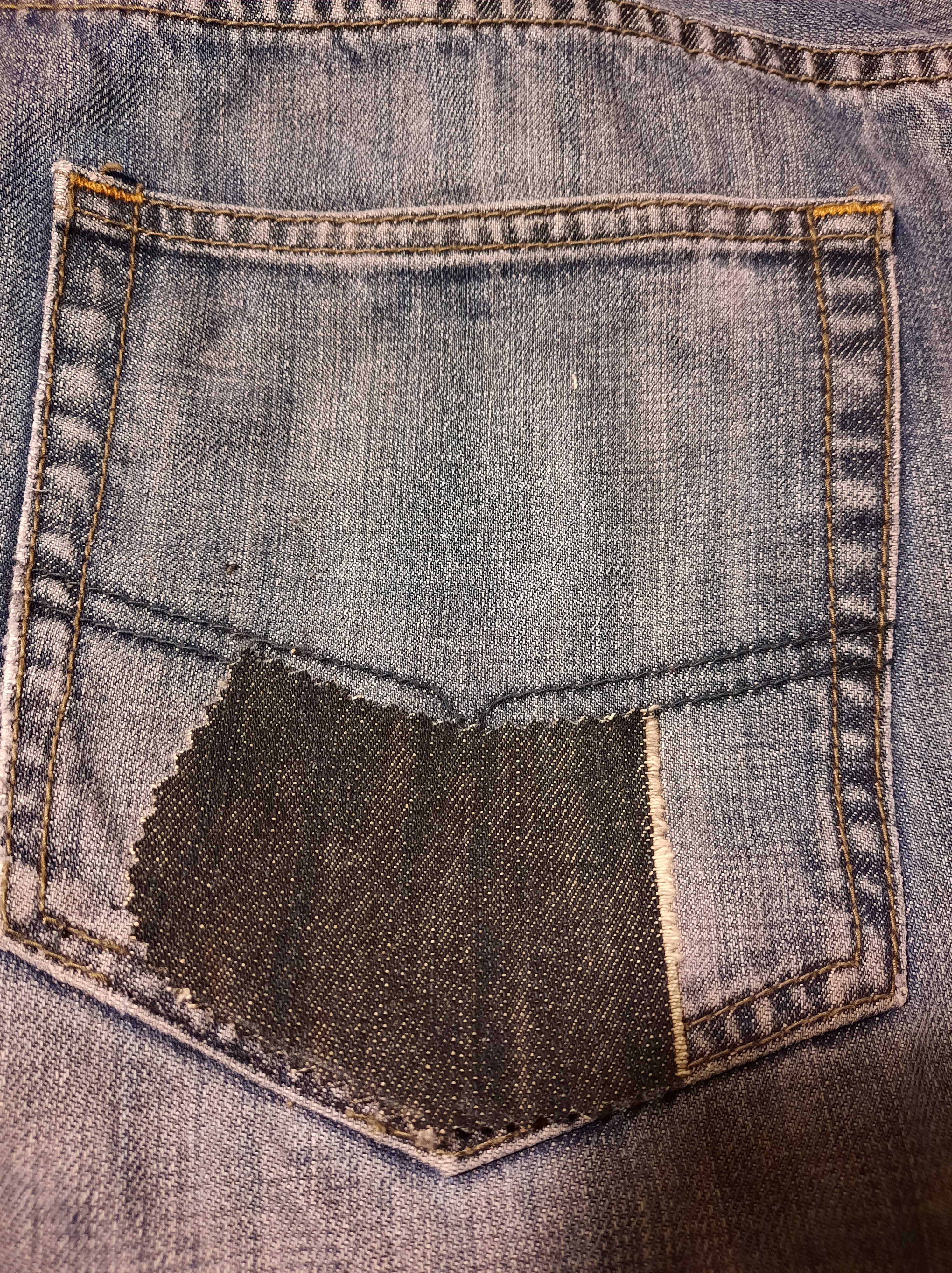 This is a stepped through sequence of mending my jeans back pocket. I’ve decided what to cut out, then decided what shape and size of patch I need. I needed to rip part of the seam holding the pocket to the jeans, to get the patch in position and turn its edges under.