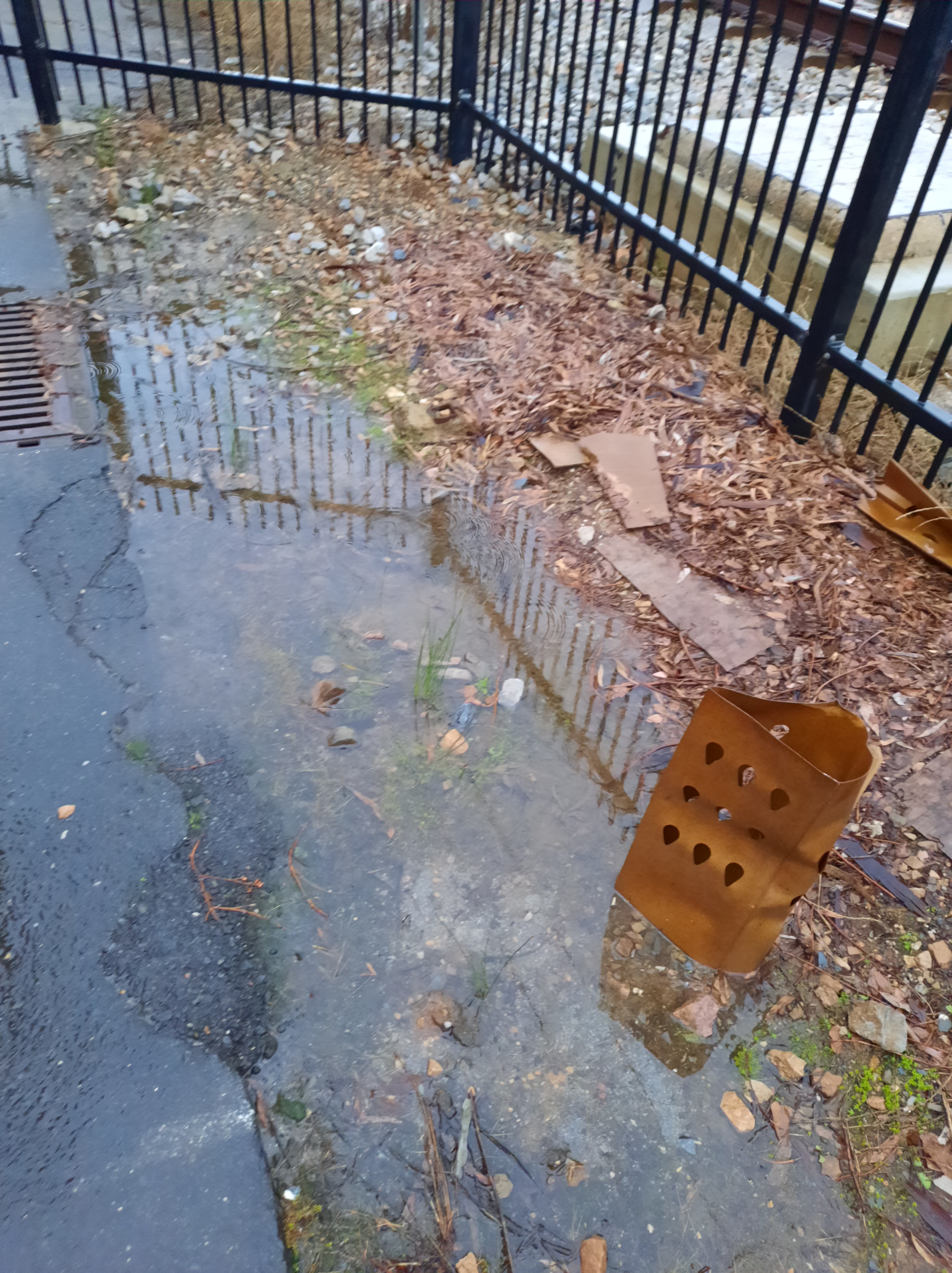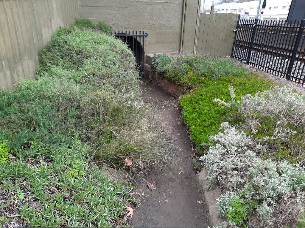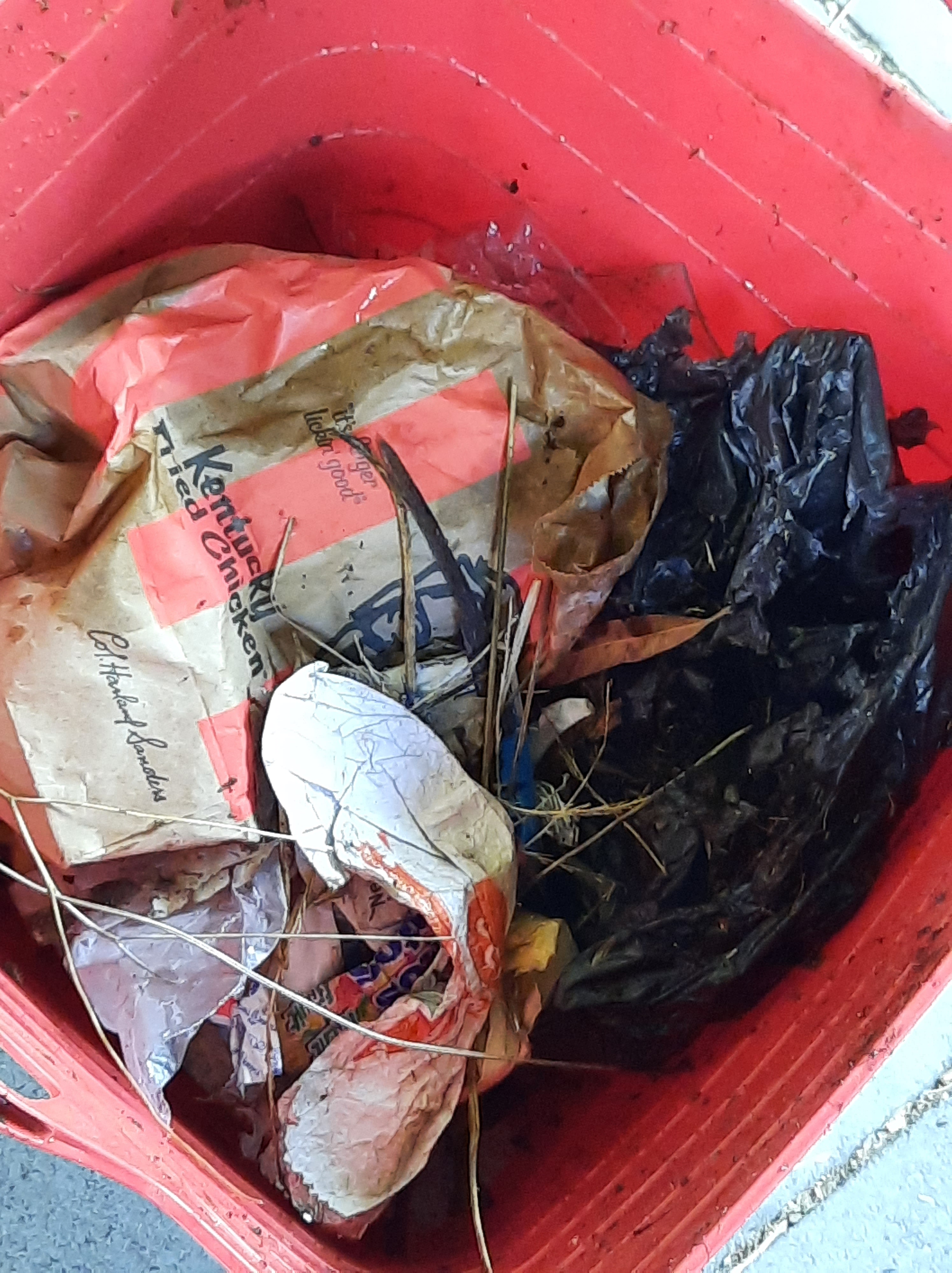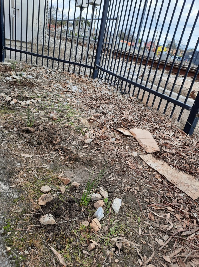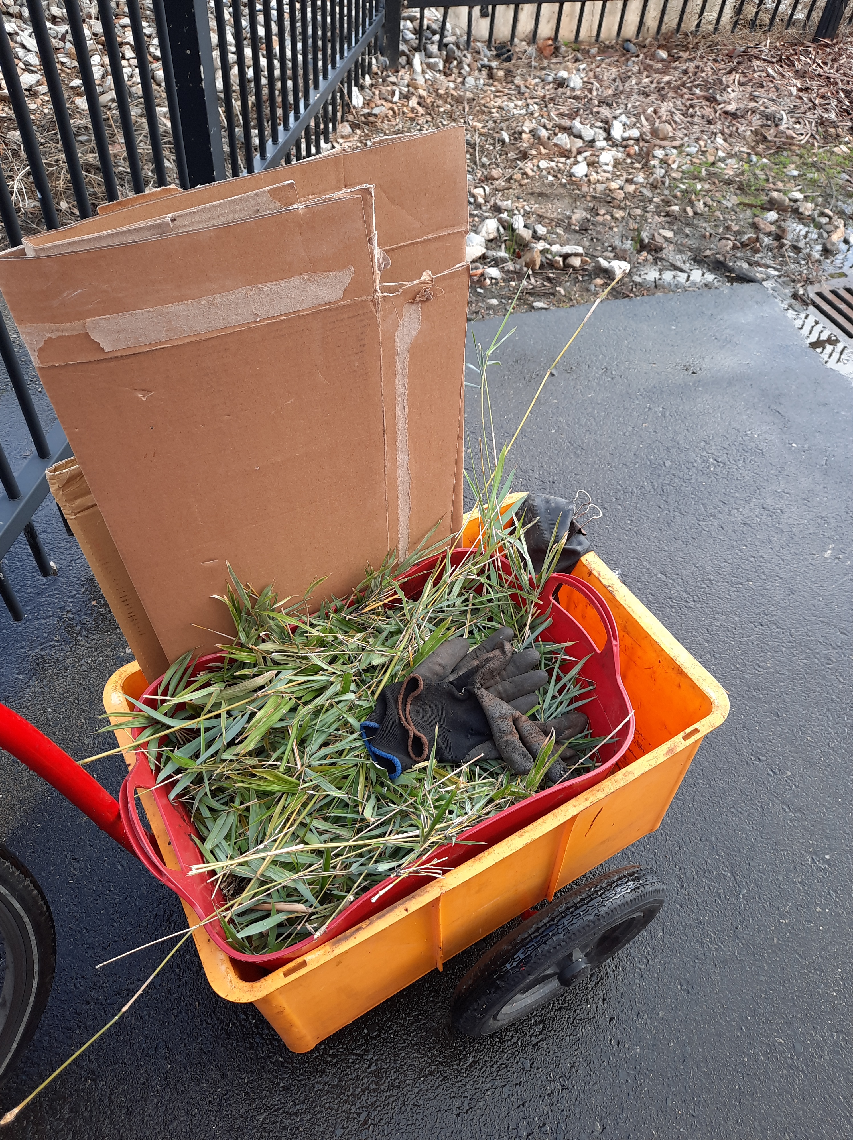 Another mission to the sedge planting by the railway line, this time, mulching. My sister gave me the bamboo she wanted to cut from her place. I saved the bamboo and took the leaves and such (plus cardboard) over to this spot for mulch. Then home with rubbish. The cardboard isn’t visible under the layer of mulch (except when dogs or people lift it up). But it is there, helping suppress weeds.
