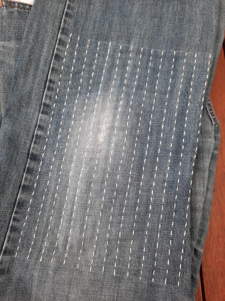 Here is the second knee mend on these same jeans. I love wearing them but they were second hand when I started wearing them and they are not such sturdy quality that they will last forever. Meanwhile…