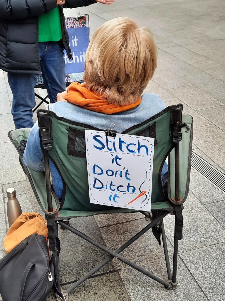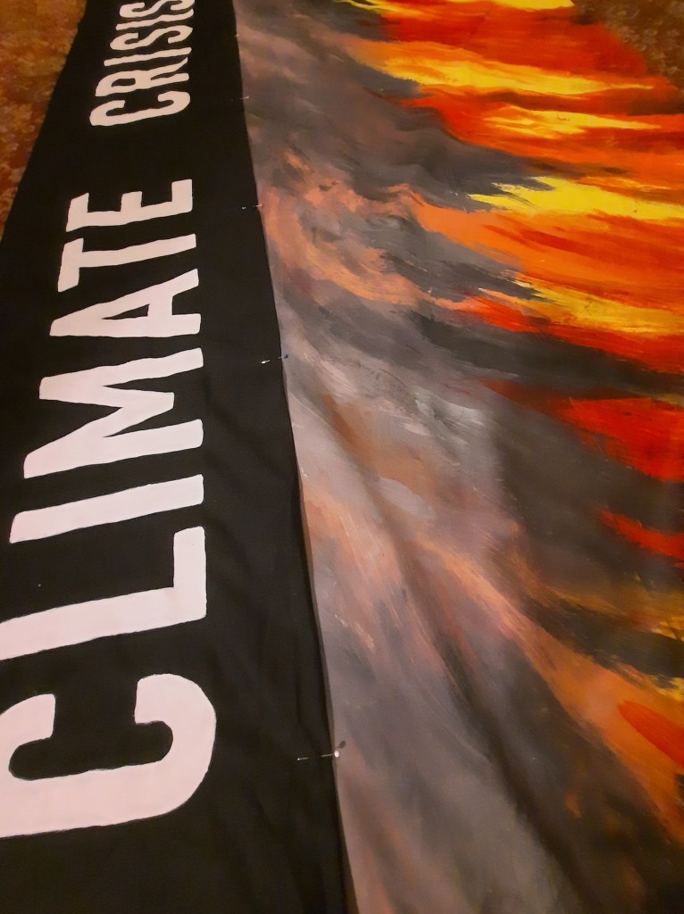 I’m in a phase of Extinction Rebellion crafting. Folks have begun to ask me to make/repair/amend things, and I keep thinking up projects, too. It seems a good application of my skills. This banner went along to an event where it was confiscated by the police outside SANTOS. If you’re interested, you can see it in use here. It was torn so thoroughly and in so many places it seemed like there must have been a tug of war–but I was there and saw no such thing happen. On closer inspection, metal eyelets had been set into what looks like an old bed sheet. That was never going to end well!
